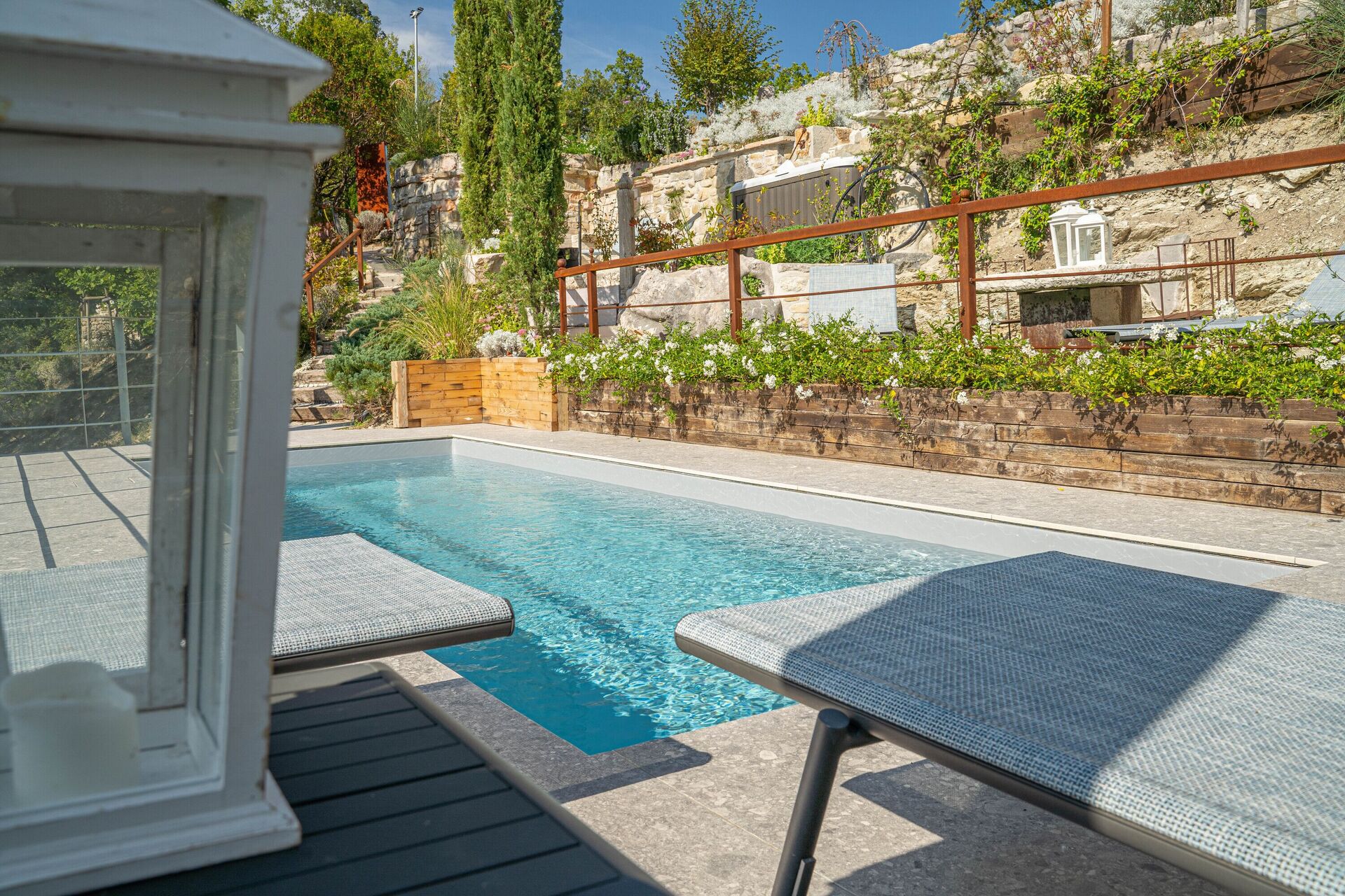 Jardín: piscina (privado/a, ancho: 7m, longitud: 2.5m, profundidad: 1.4m, fuera), bañera de hidomasaje exterior, ducha, barbacoa, comer al aire libre, dos mesas de comedor (gente: 10), mobiliario de jardin, tumbona.
