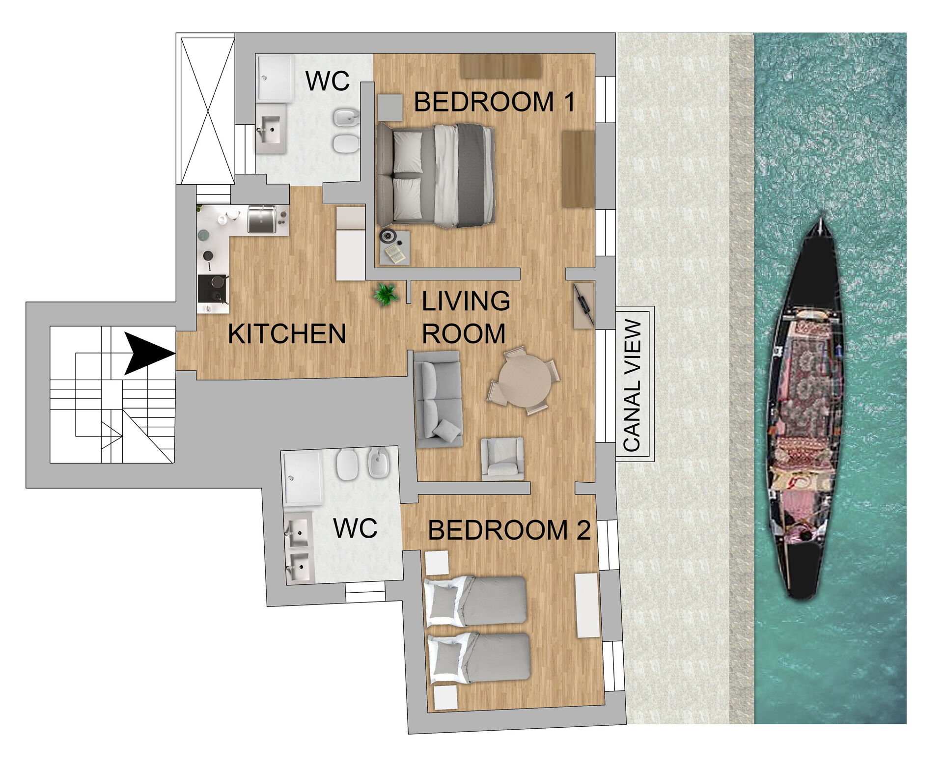 Incluye: cocina, salón, 2 habitaciones con baño.