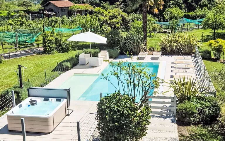 El jardín privado, que se extiende sobre 1.000 m2 y está completamente cercado, cuenta con césped exuberante y árboles maduros que proporcionan sombra y privacidad durante los meses más cálidos. La piscina mide 9 x 4 metros con profundidad de 140 a 160 cm; la bañera de hidromasaje con capacidad para 4 personas se encuentra adyacente a la piscina. El área exterior incluye una ducha exterior, una casa de barbacoa para cenas al aire libre, mobiliario de jardín distribuido en los espacios exteriores y una pista de bolos que añade un toque recreativo al conjunto.