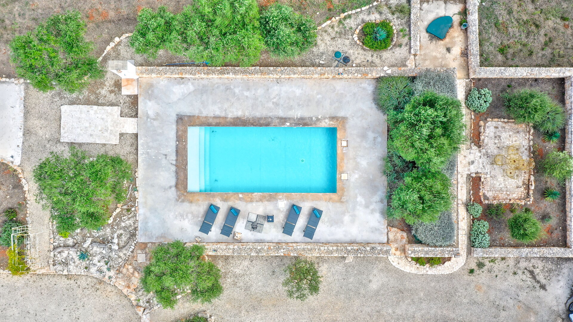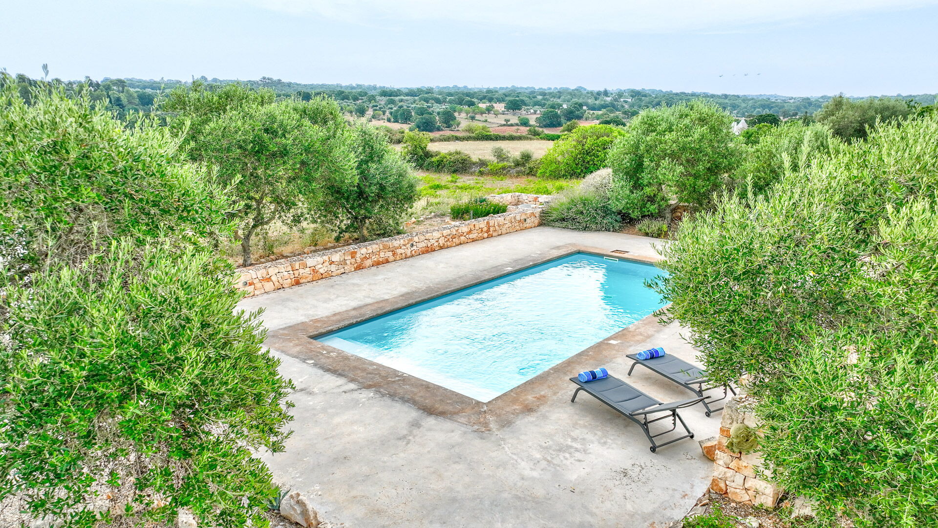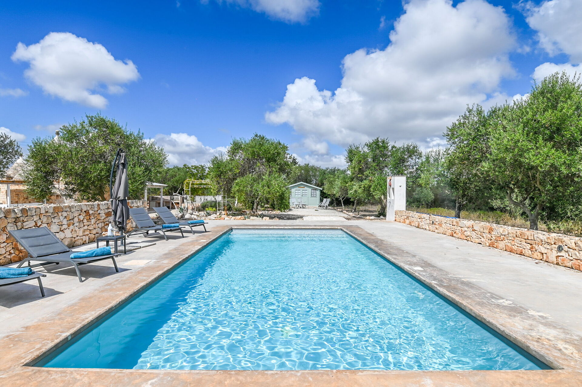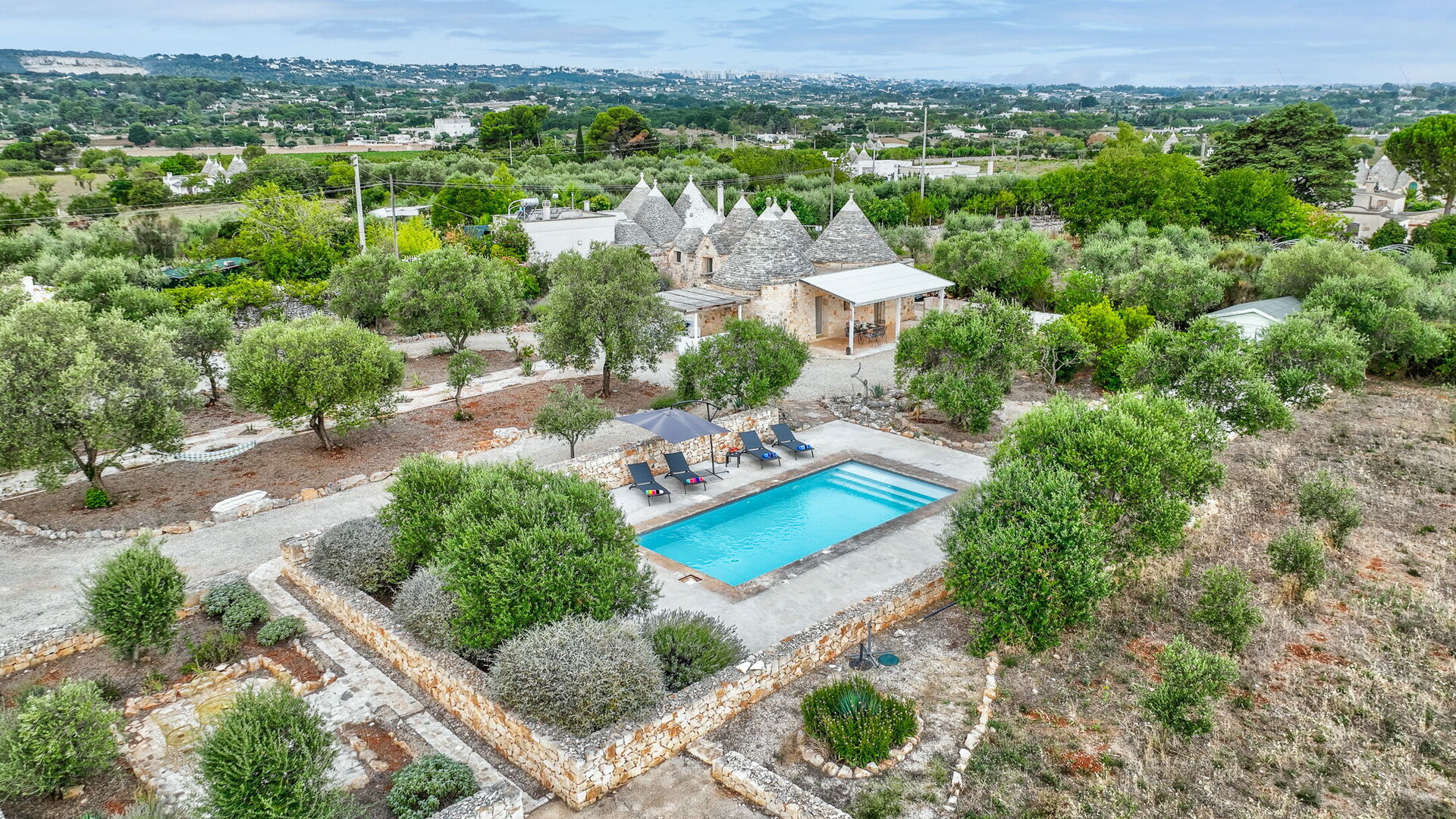 Outside there is a Mediterranean scrub garden with olive trees that frame the skimmer pool measuring 10x4x1.50 m for the exclusive use of guests. Around the guests' disposal, there are four sun loungers.