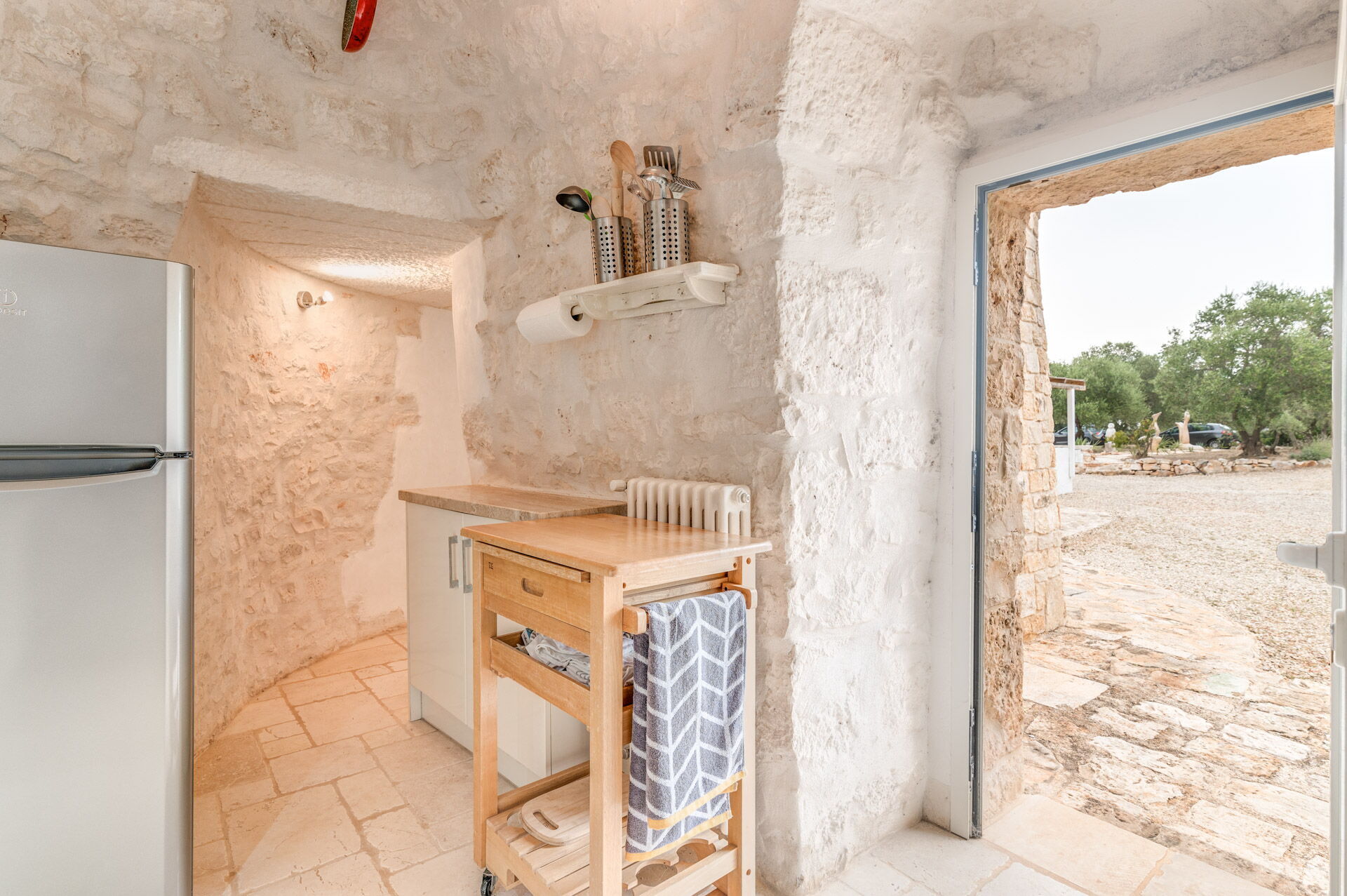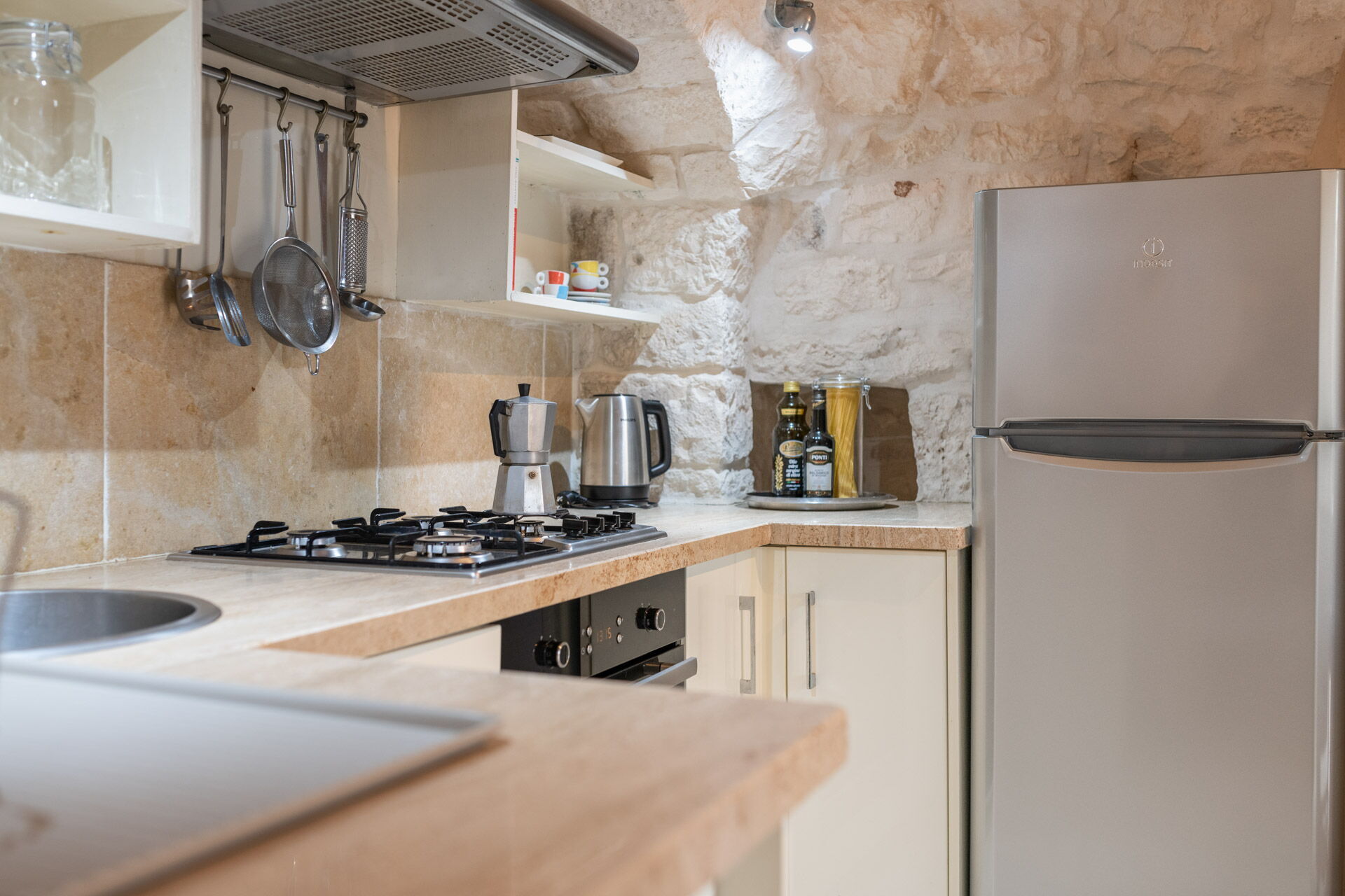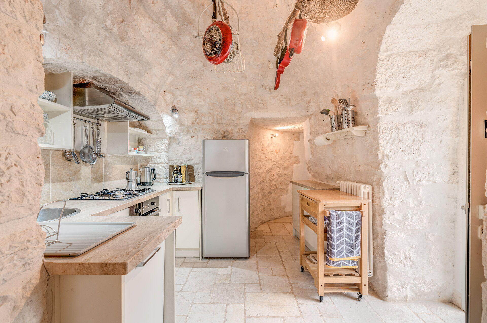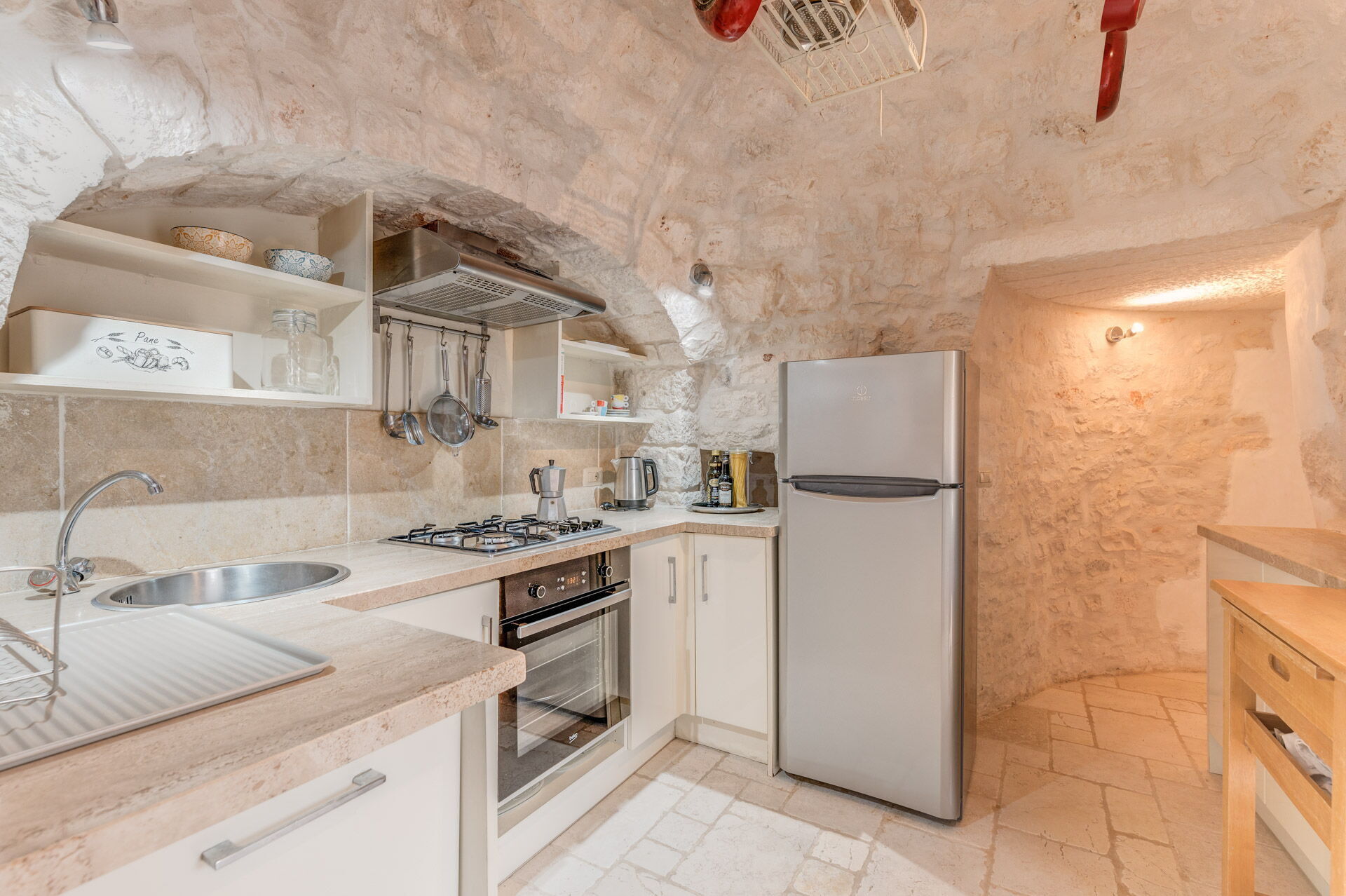 The Trullo can be an entry from both the living room and the kitchen. The full kitchen, central to the Trullo, has a hob with a gas stove and overhanging hood, a sink, a fridge with a freezer and a dishwasher.