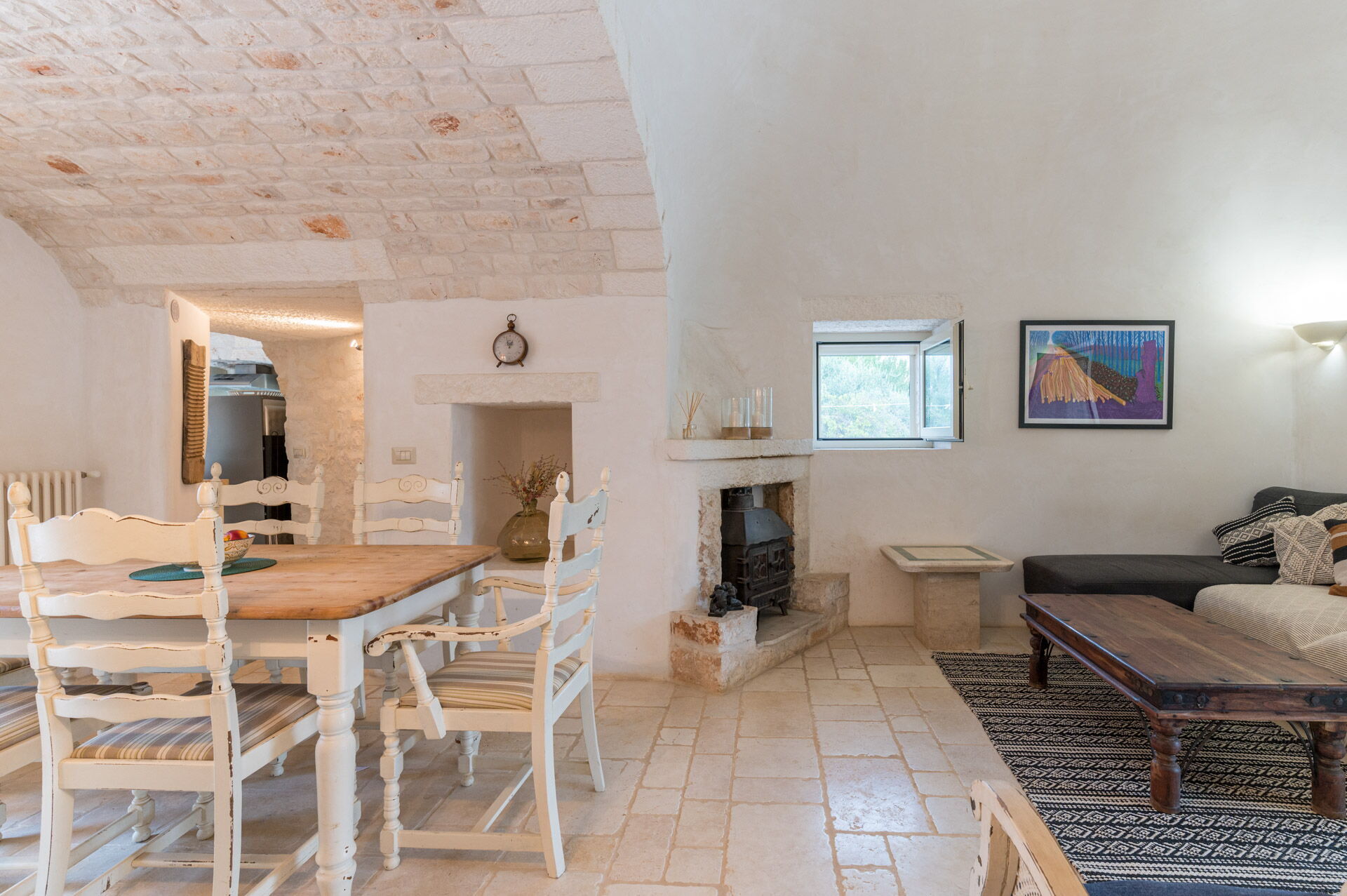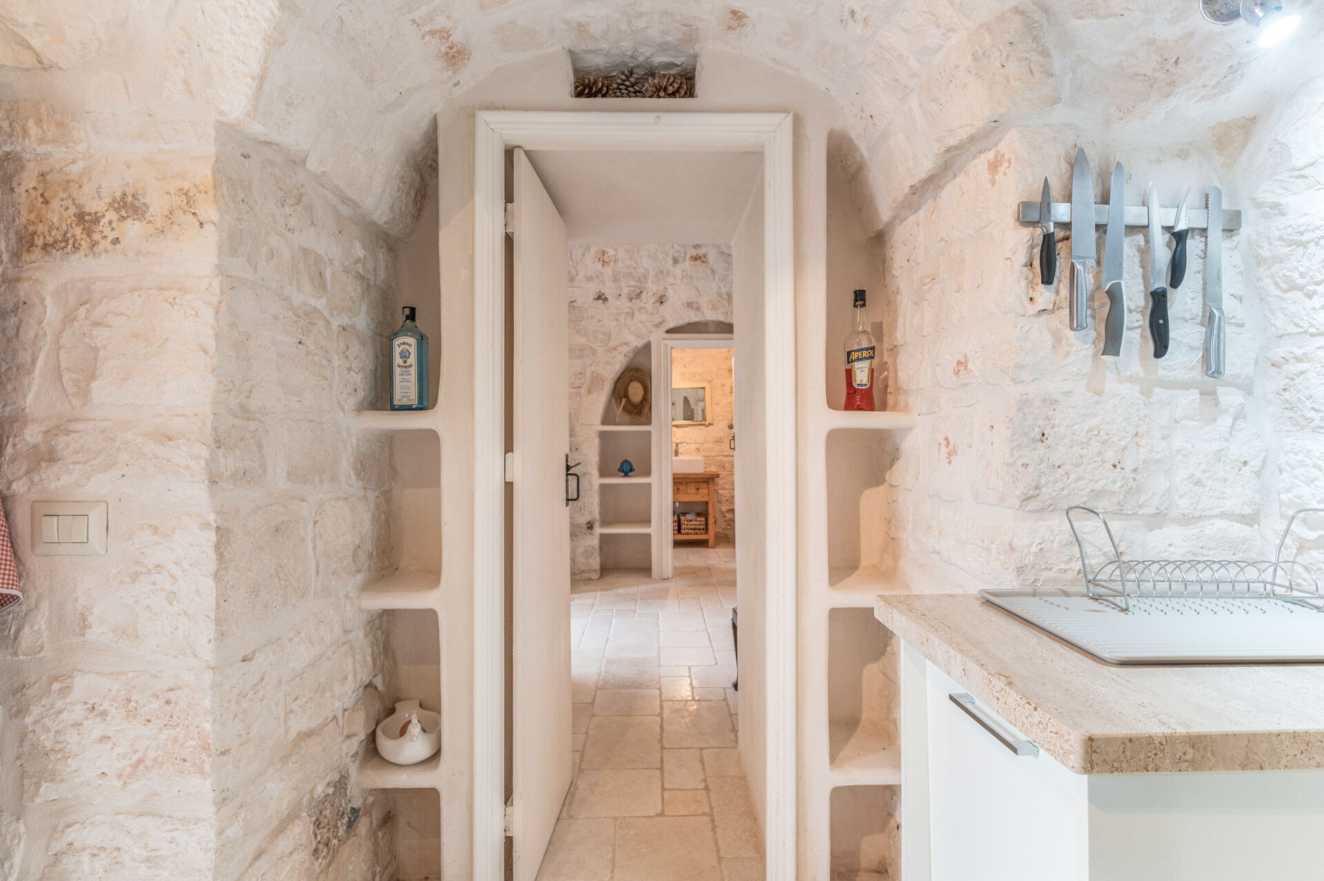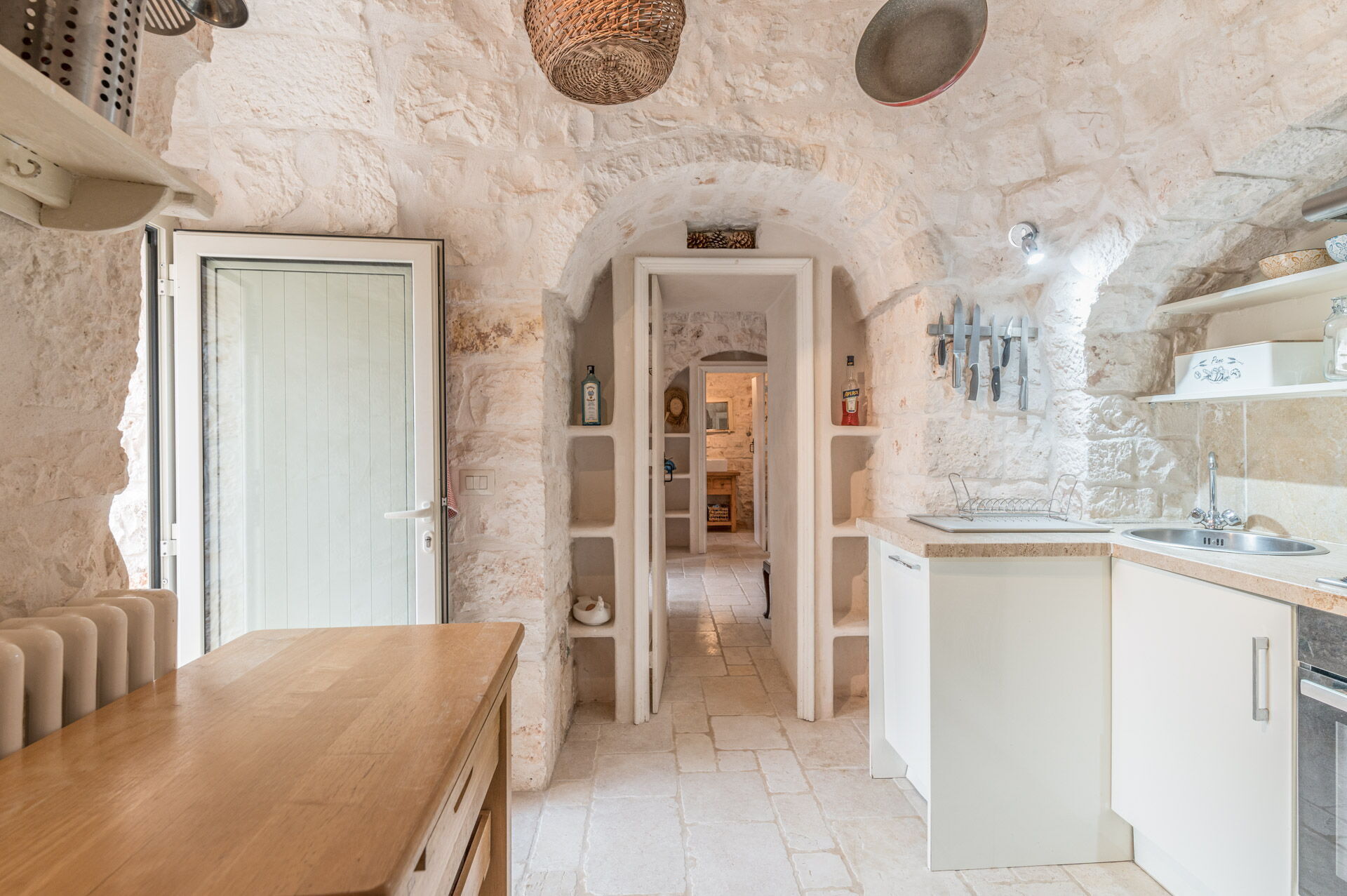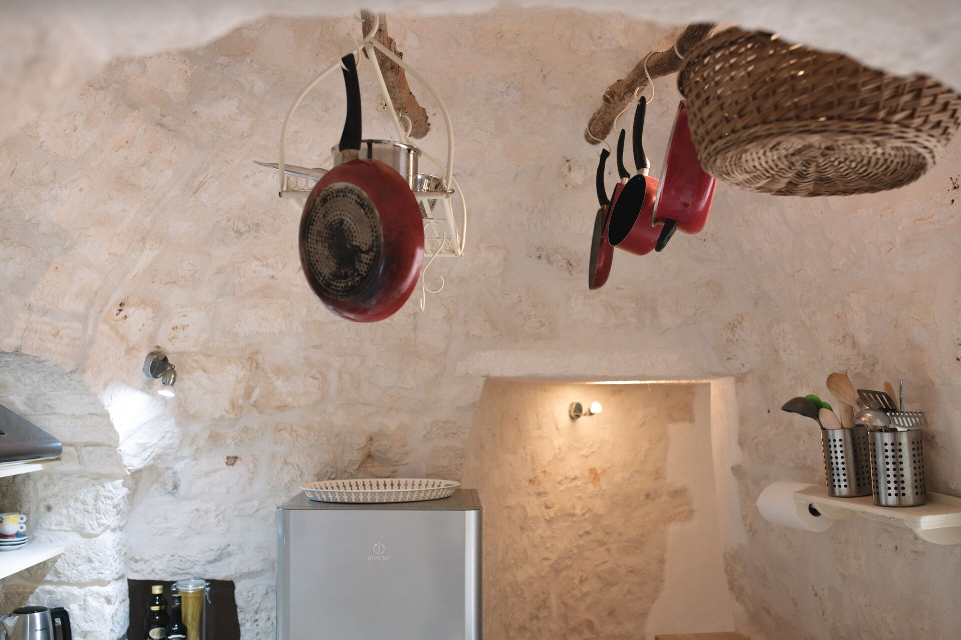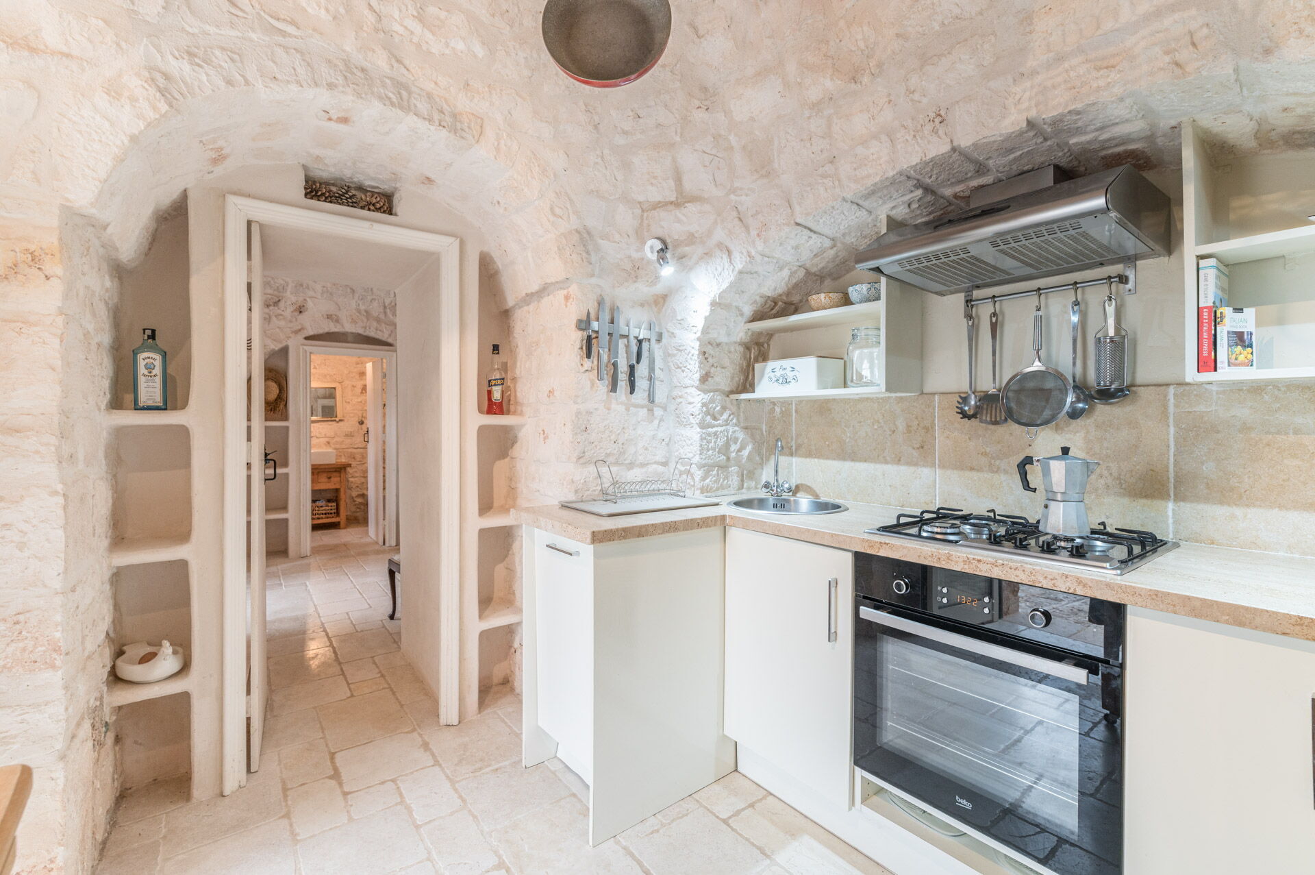 The Trullo can be an entry from both the living room and the kitchen. The full kitchen, central to the Trullo, has a hob with a gas stove and overhanging hood, a sink, a fridge with a freezer and a dishwasher.