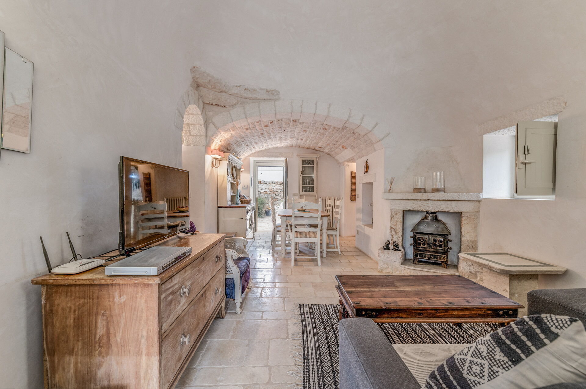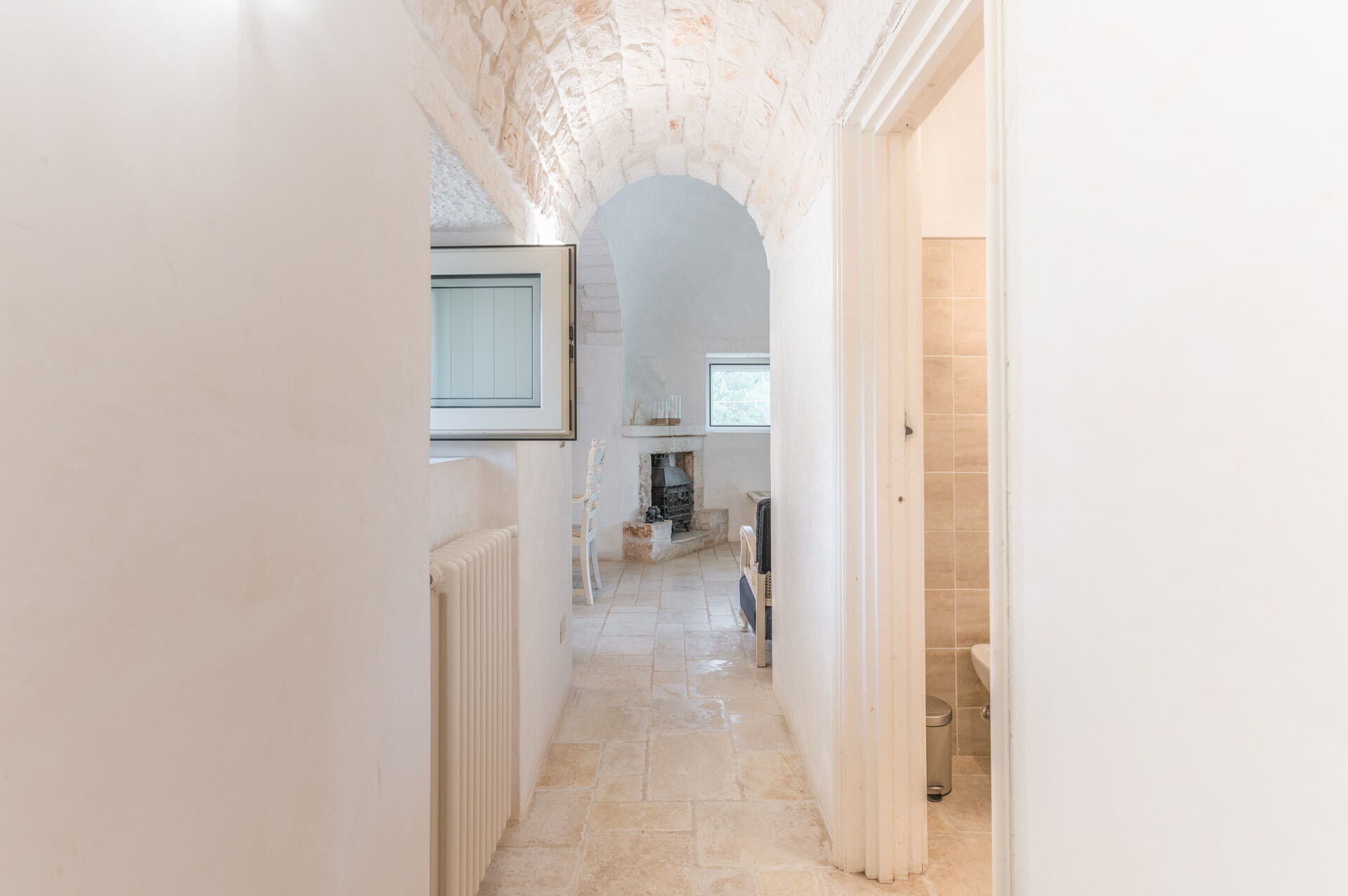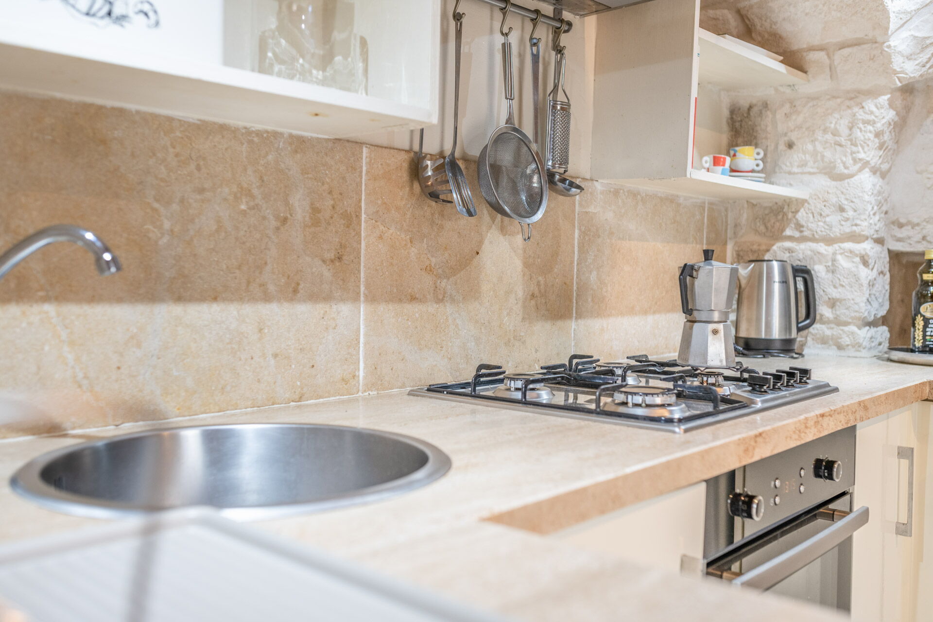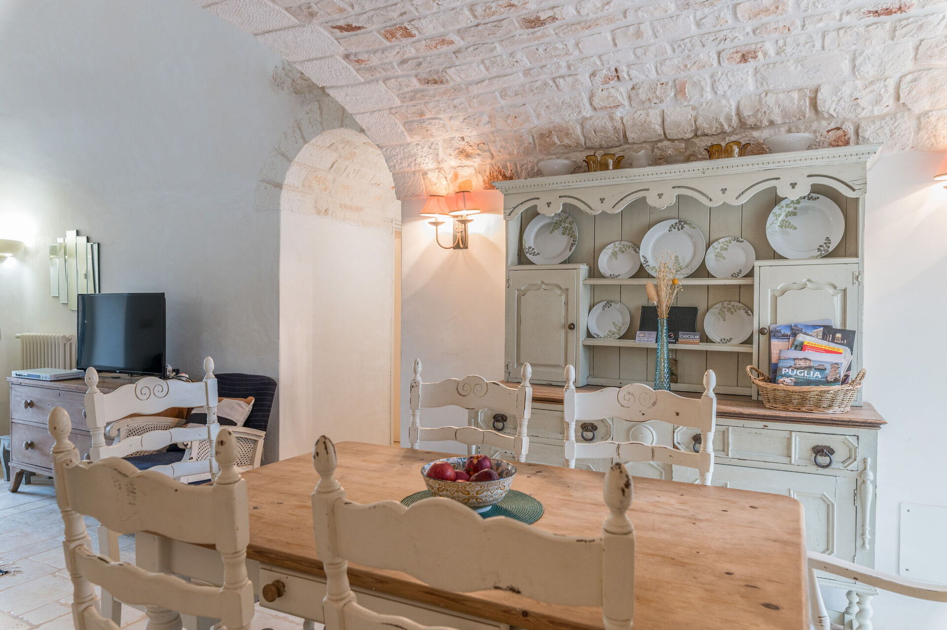 The Trullo can be an entry from both the living room and the kitchen. The full kitchen, central to the Trullo, has a hob with a gas stove and overhanging hood, a sink, a fridge with a freezer and a dishwasher.