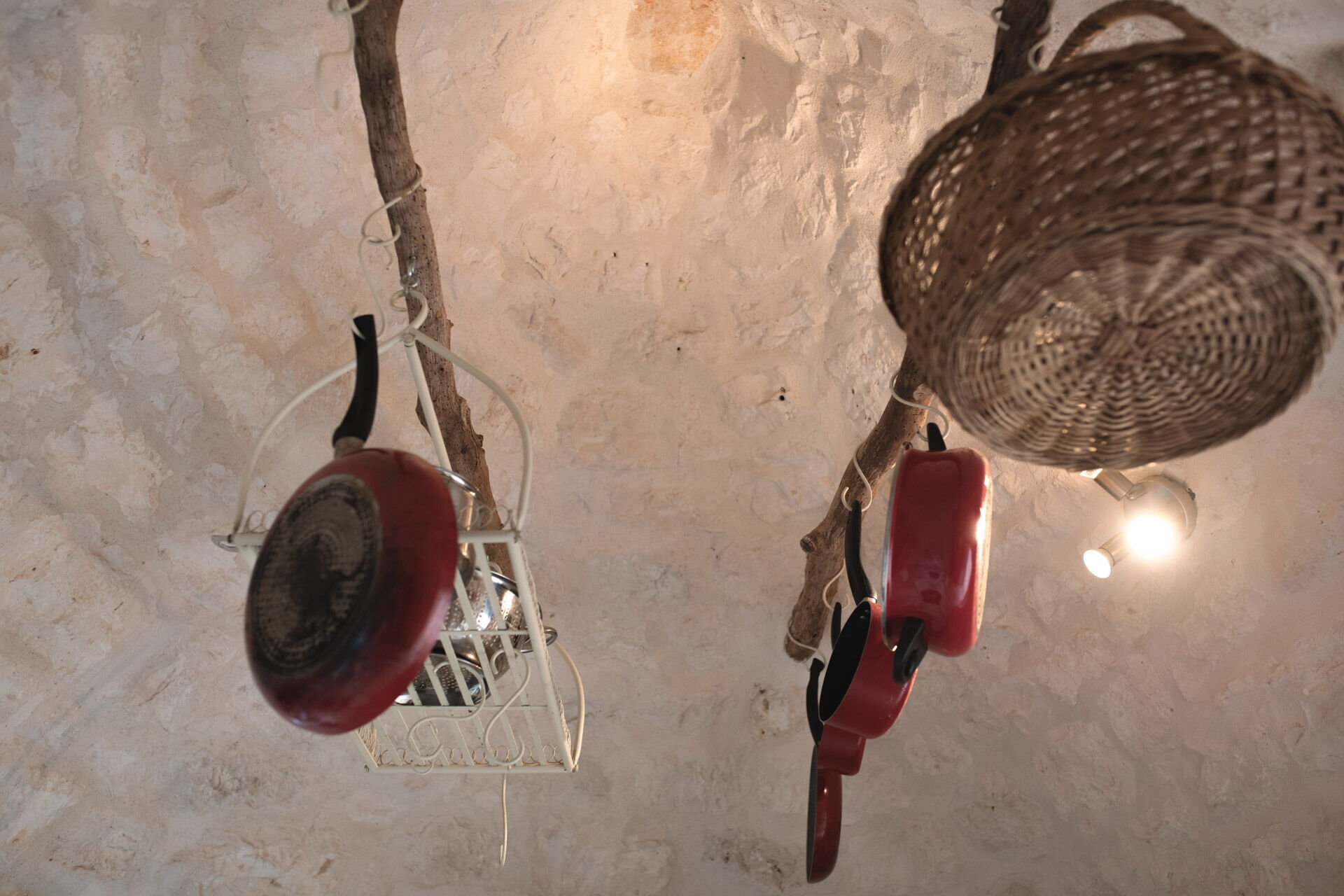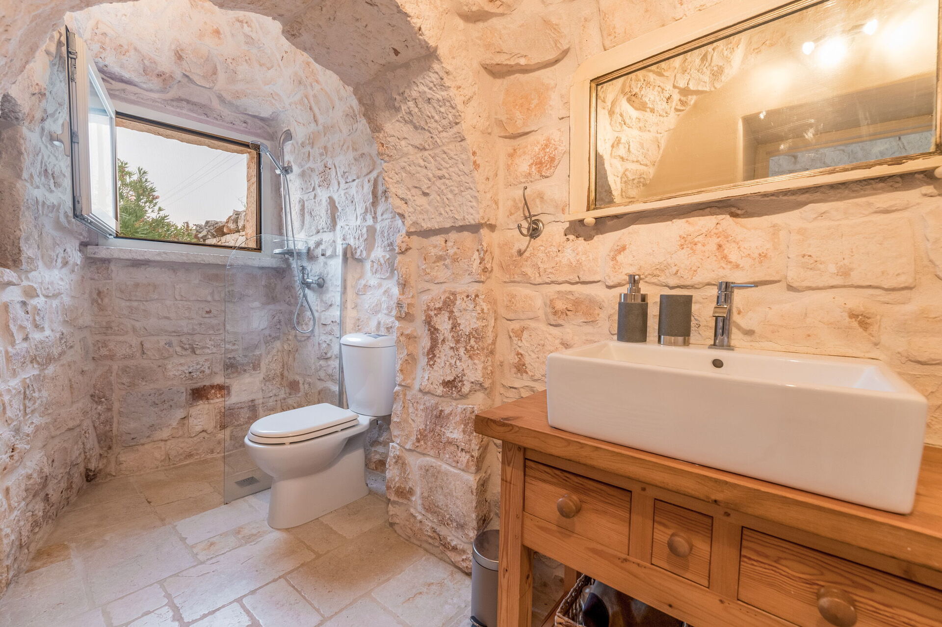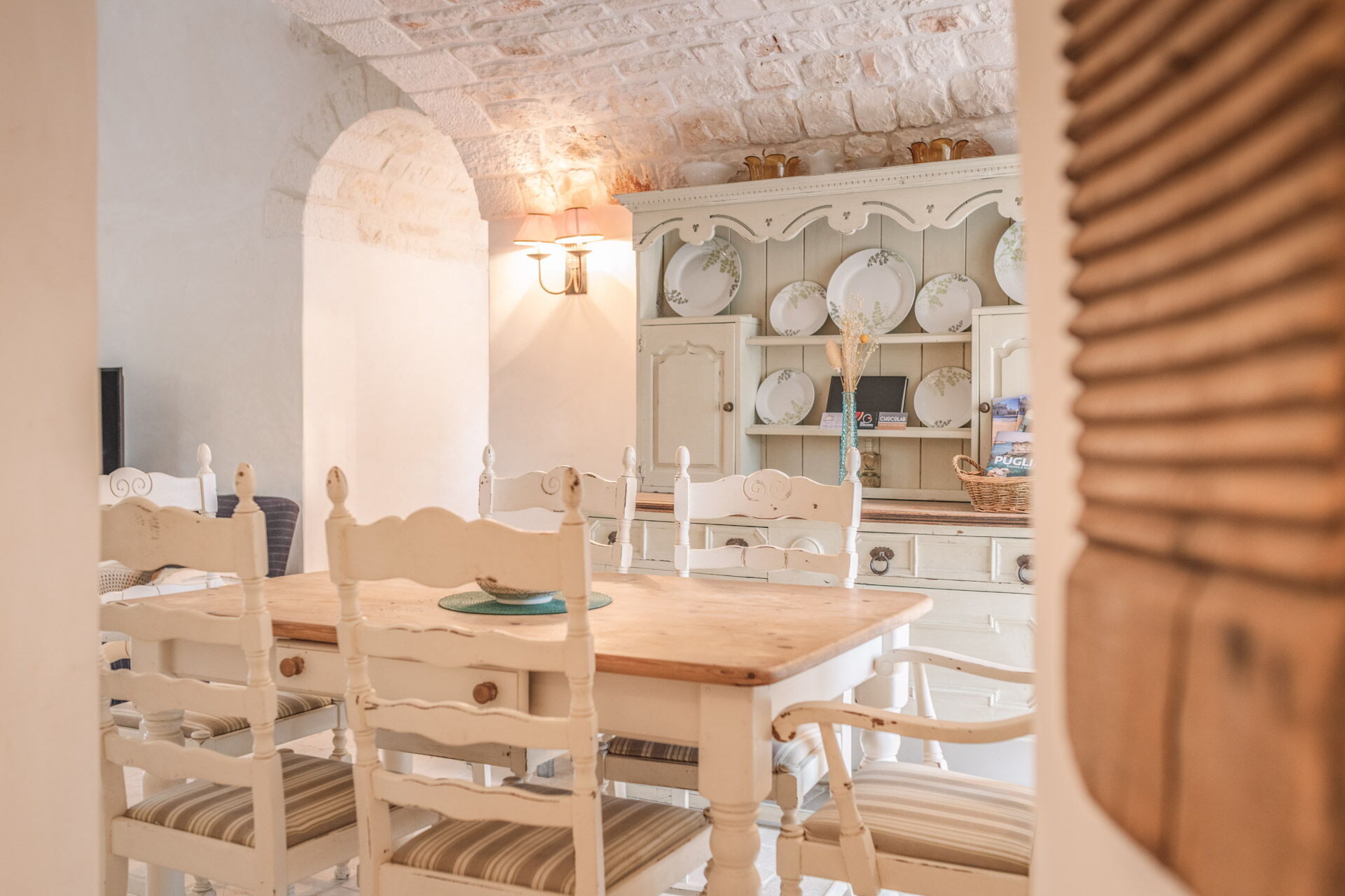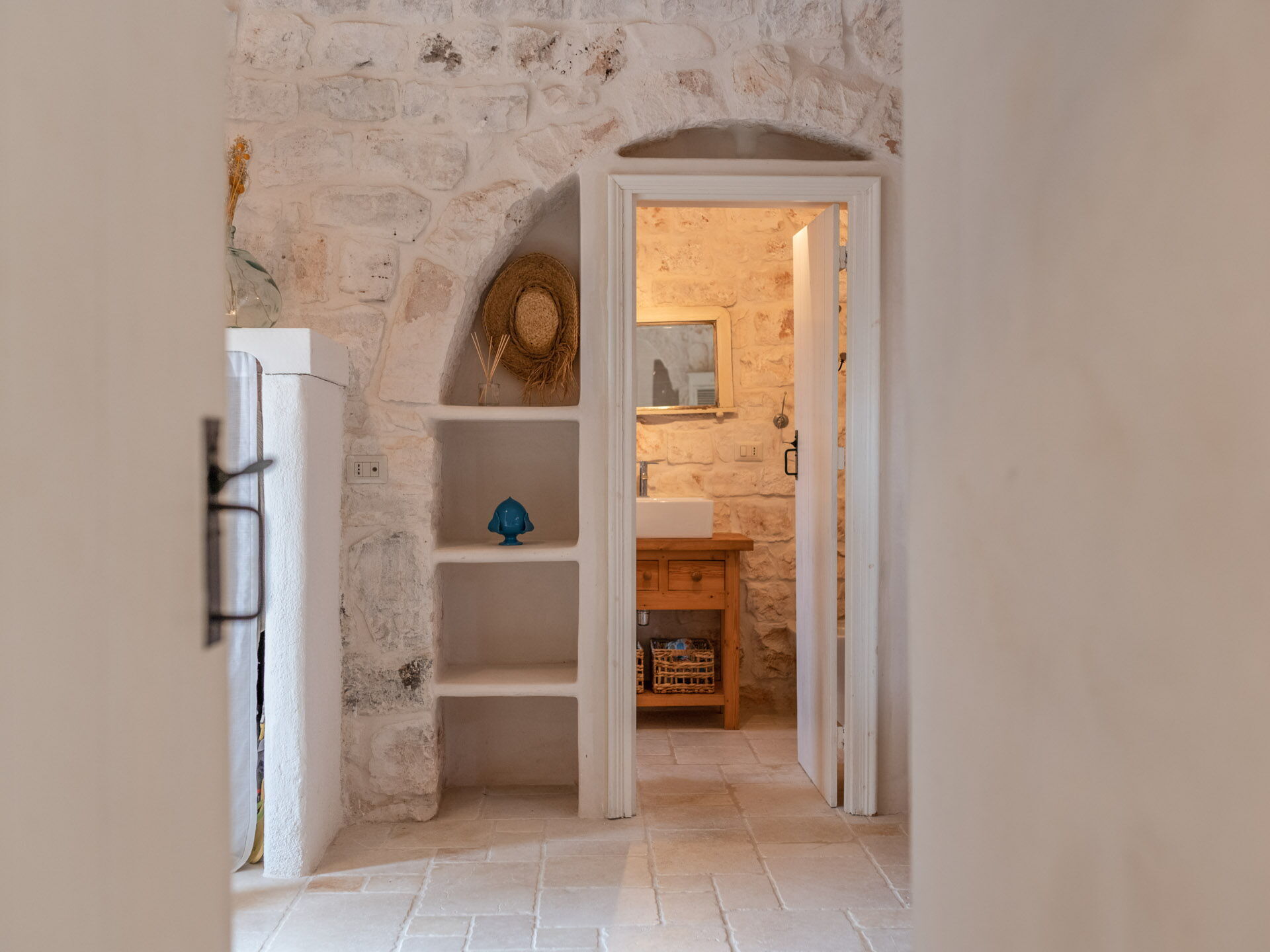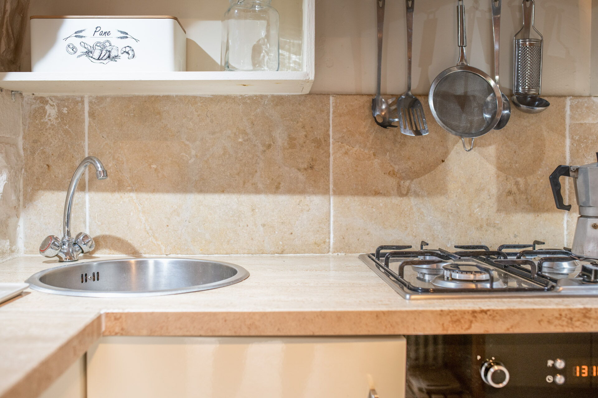 The Trullo can be an entry from both the living room and the kitchen. The full kitchen, central to the Trullo, has a hob with a gas stove and overhanging hood, a sink, a fridge with a freezer and a dishwasher.