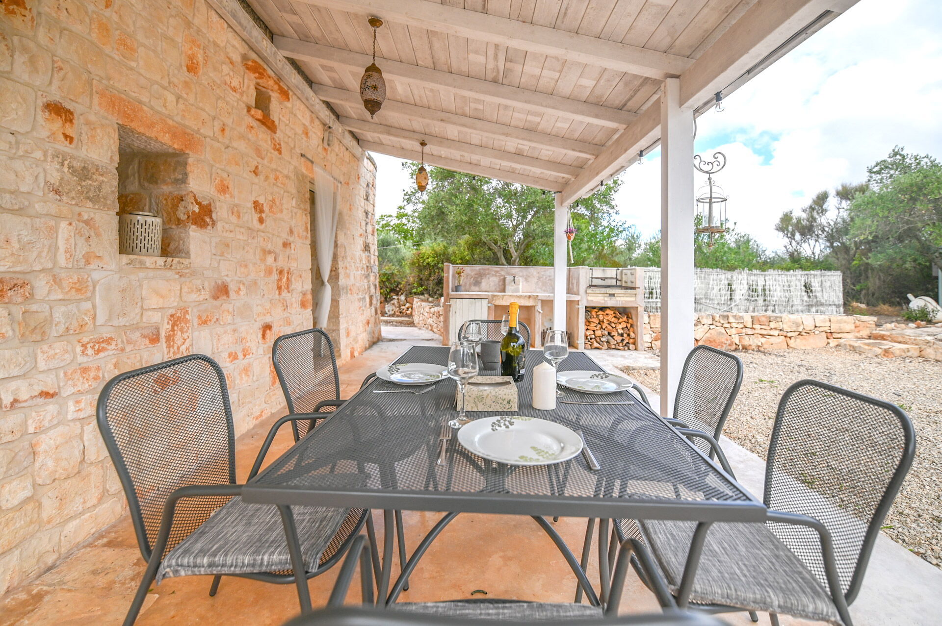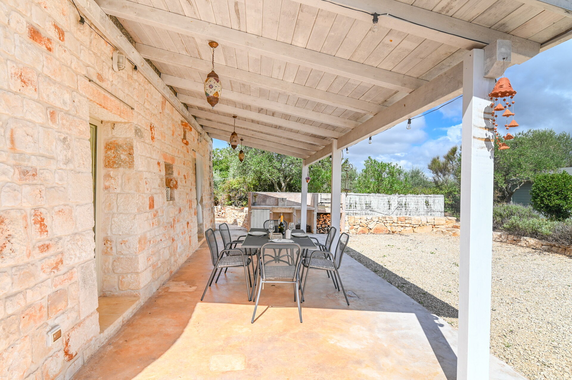 Outside there is a covered patio with a table for fantastic aperitifs, a wooden veranda with a dining table for six people and a wood-burning barbecue with a sink.