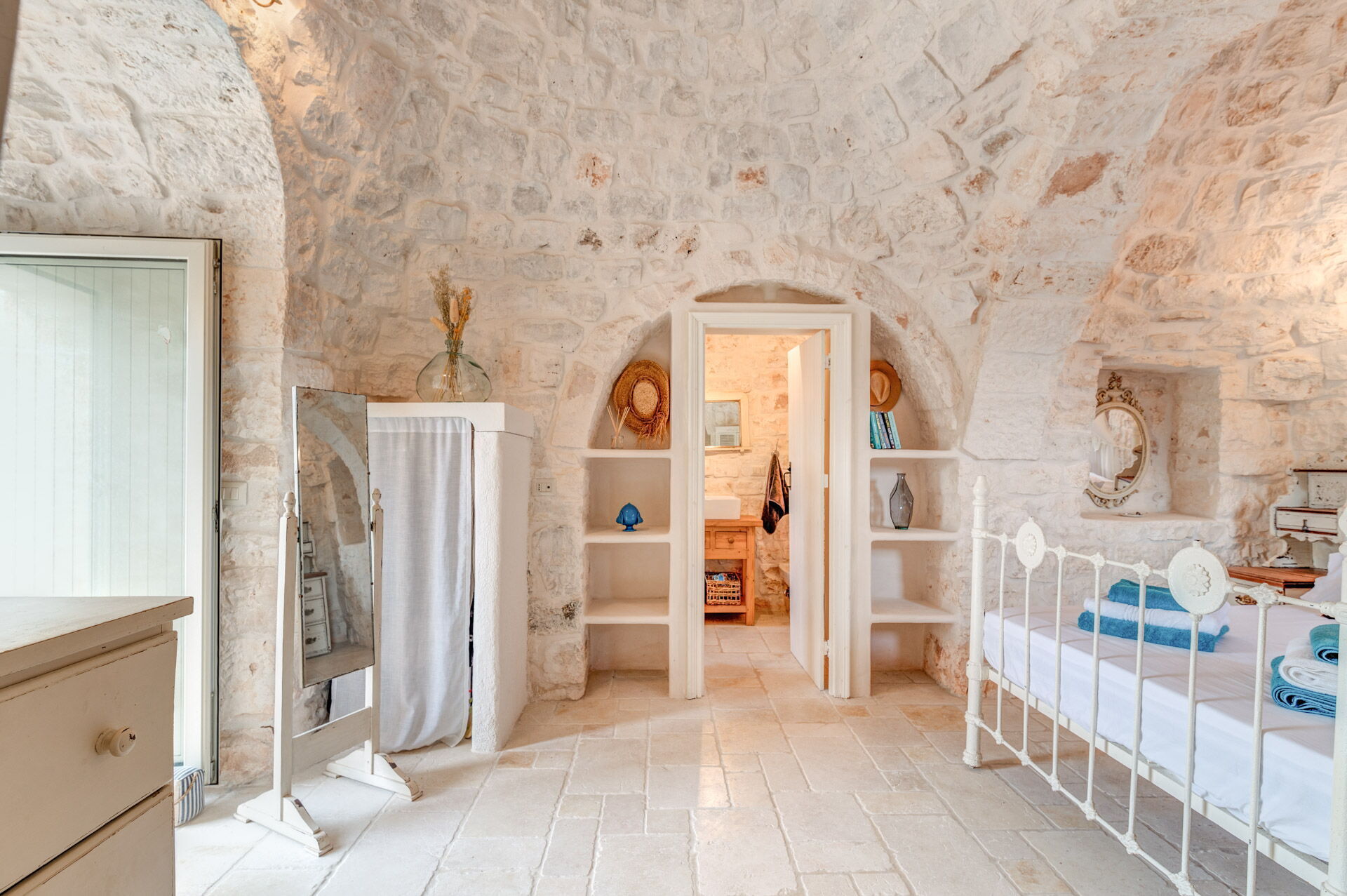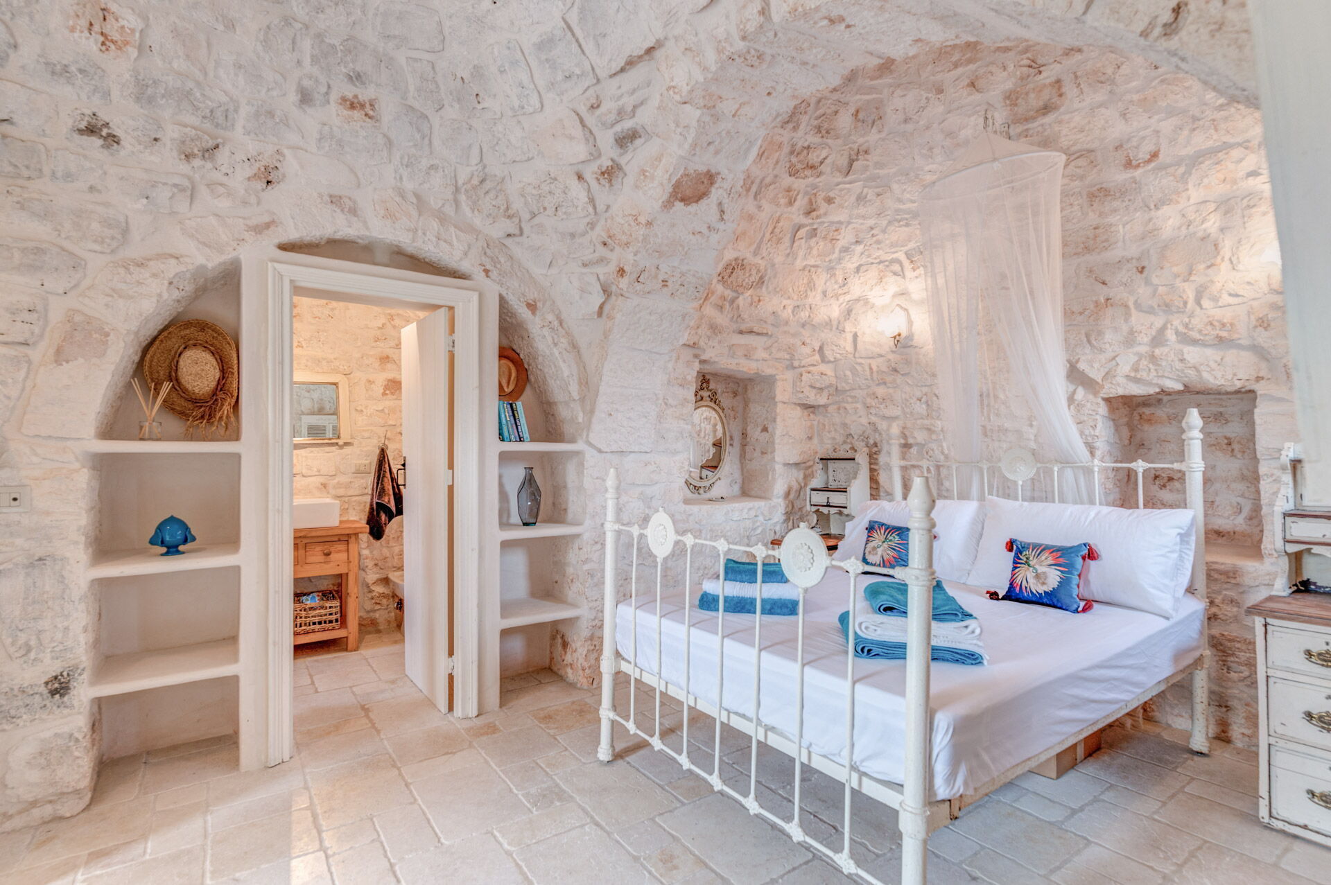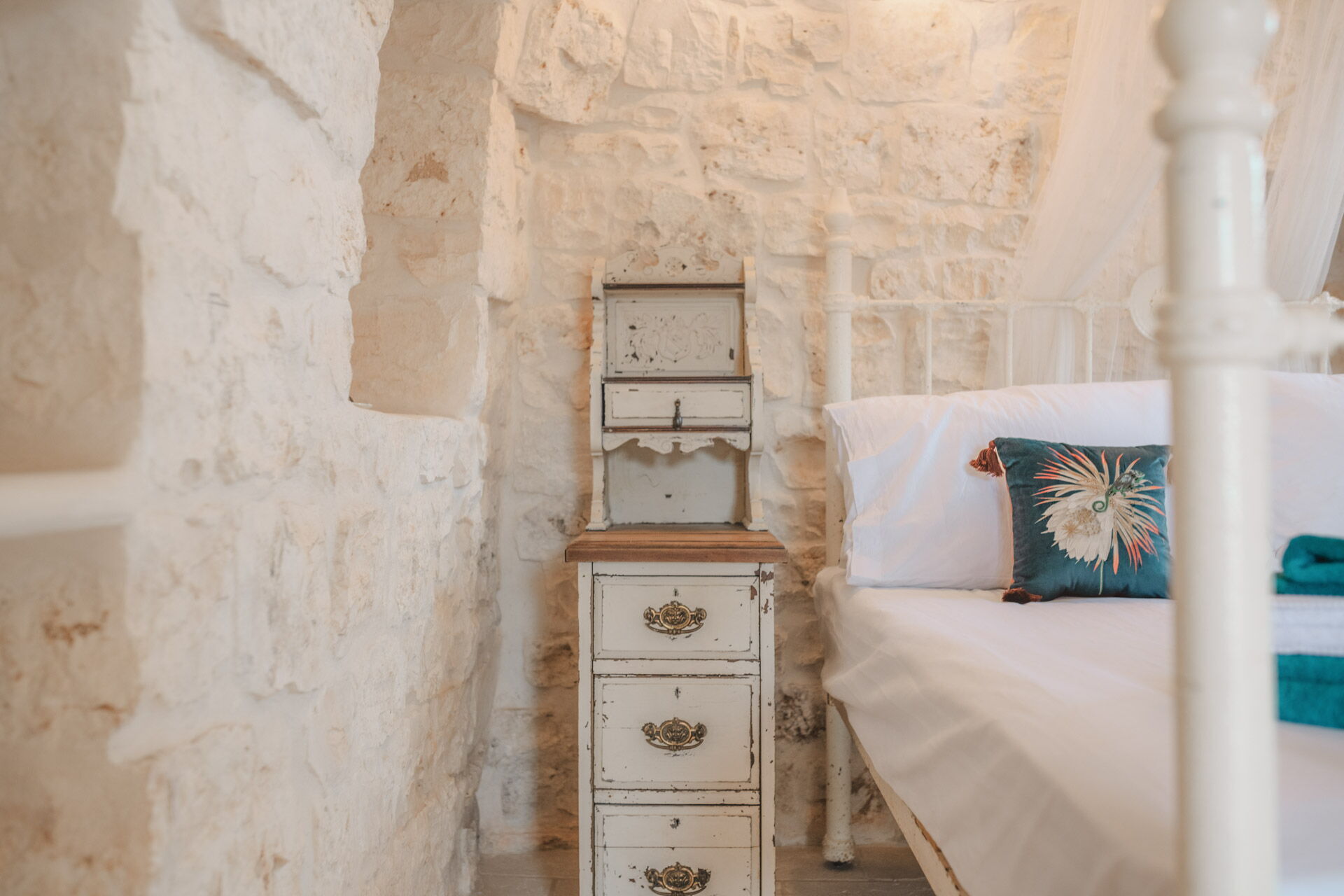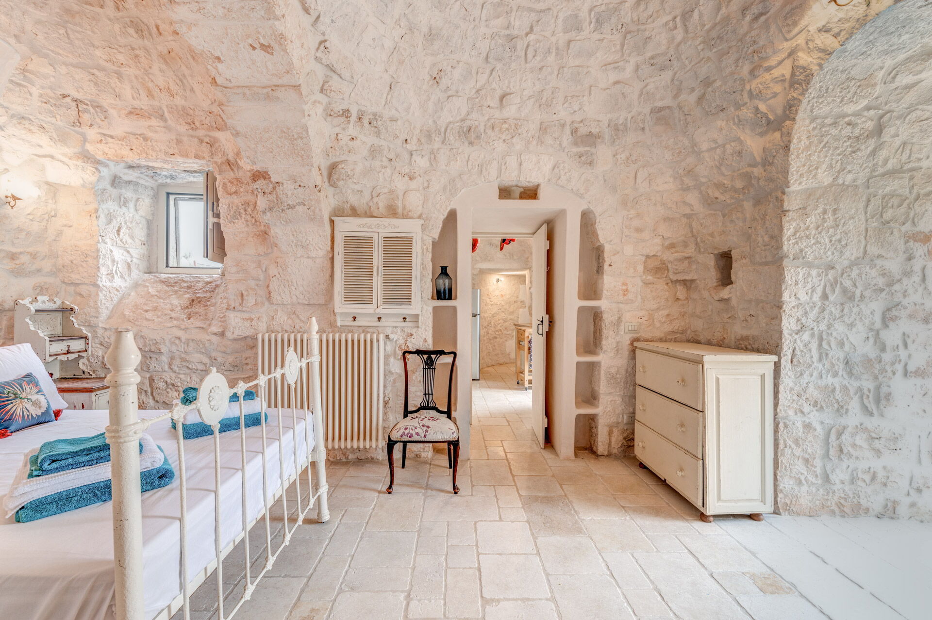 The main bedroom, with independent external and internal access, can be reached from the kitchen, is located in the most historic and ancient part of the Trullo and has exposed stone walls. The room has a double bed with a wrought iron structure, two bedside tables, and a chest of drawers. With private access from the bedroom, there is the bathroom, with a window, complete with sink, toilet, bidet and shower.