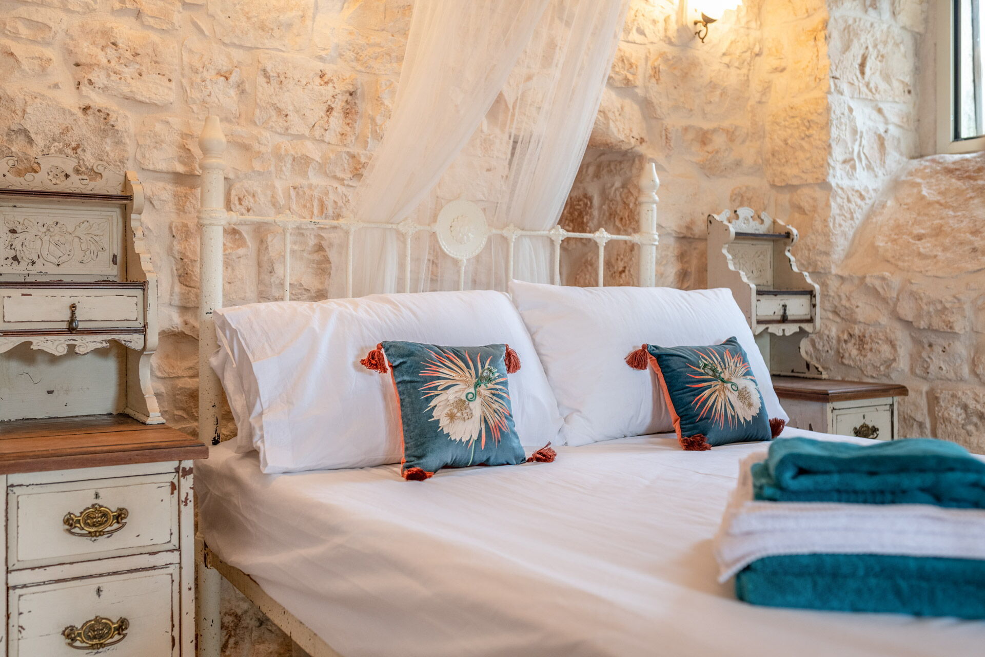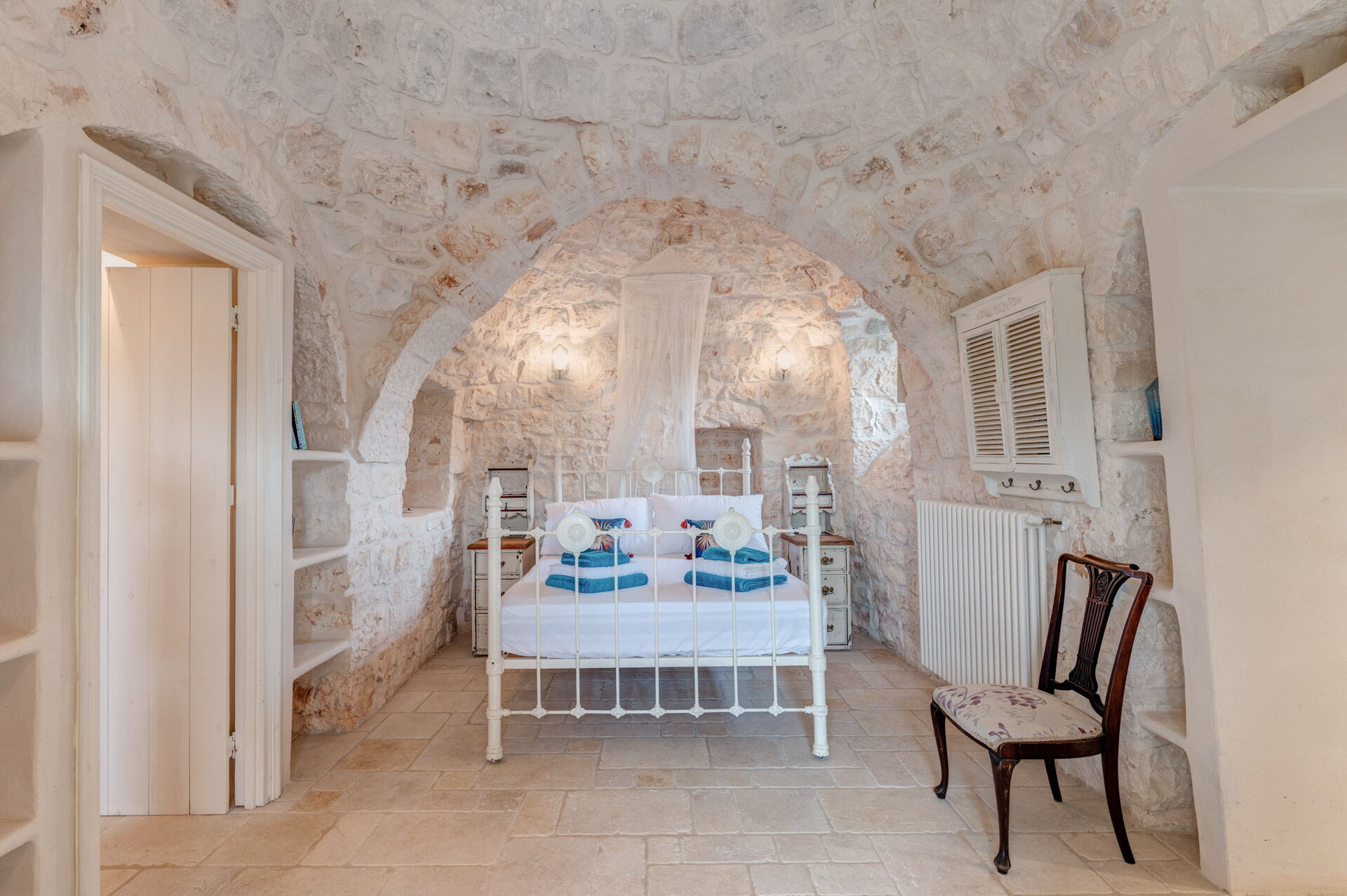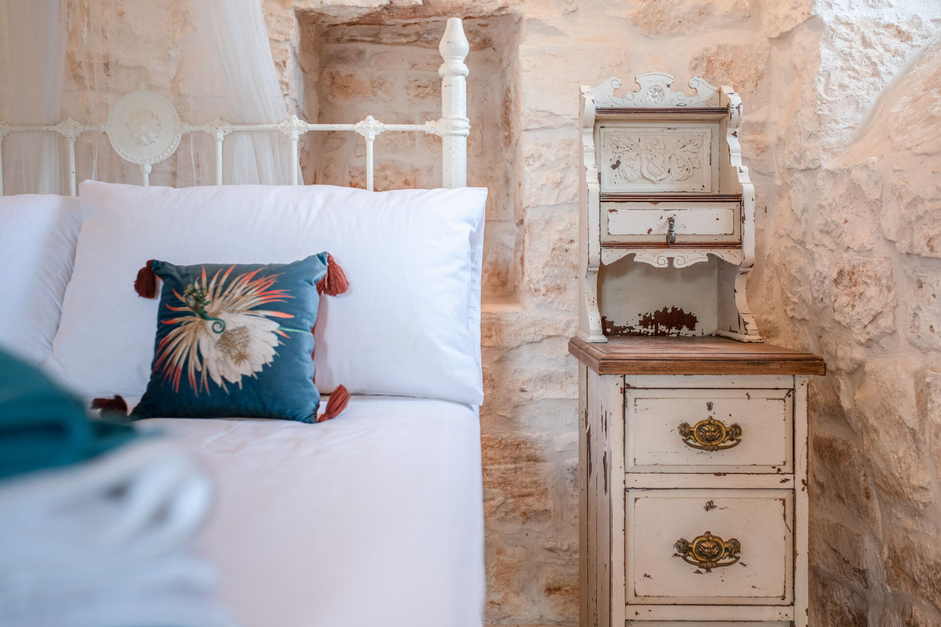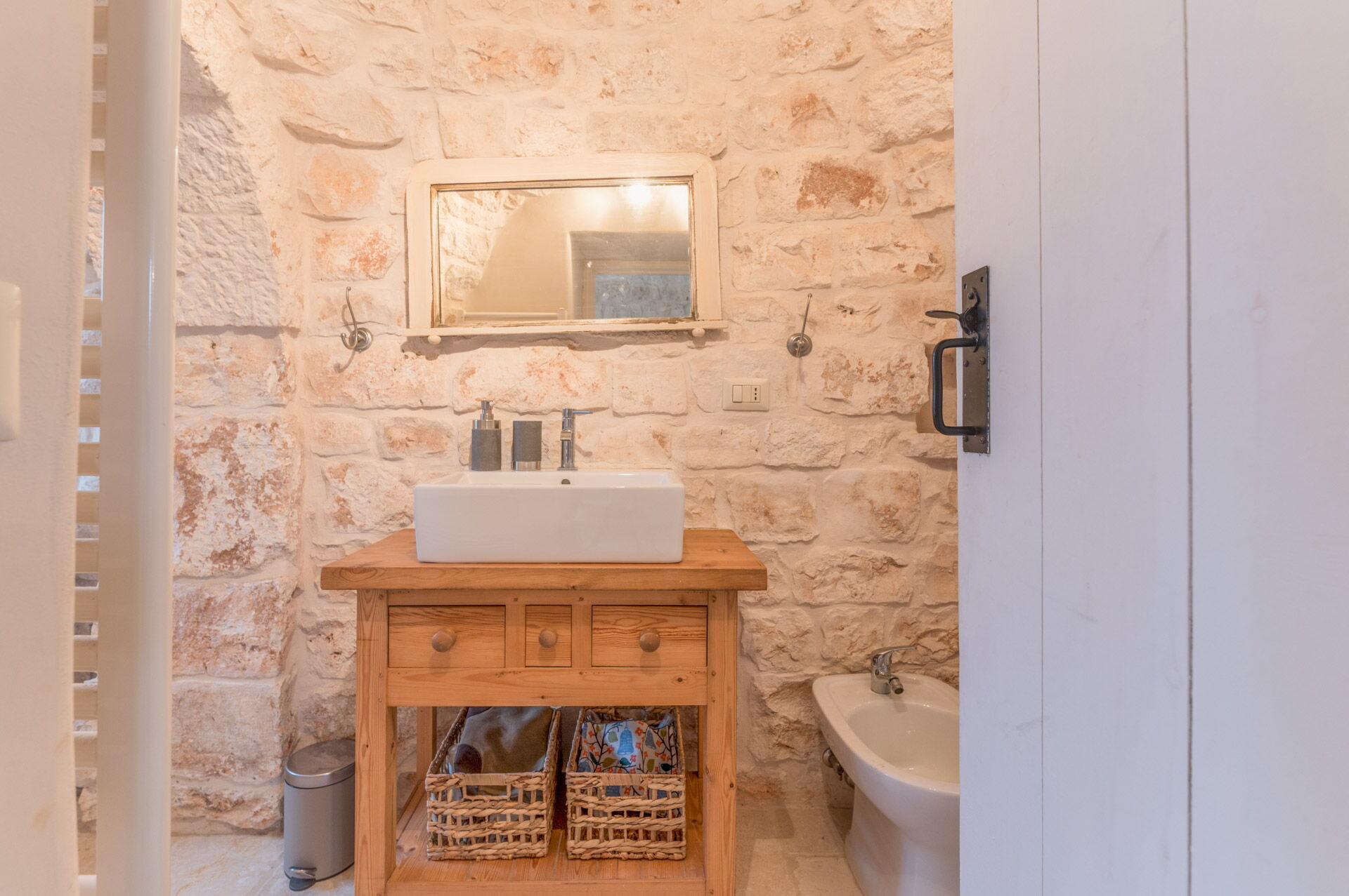 The main bedroom, with independent external and internal access, can be reached from the kitchen, is located in the most historic and ancient part of the Trullo and has exposed stone walls. The room has a double bed with a wrought iron structure, two bedside tables, and a chest of drawers. With private access from the bedroom, there is the bathroom, with a window, complete with sink, toilet, bidet and shower.