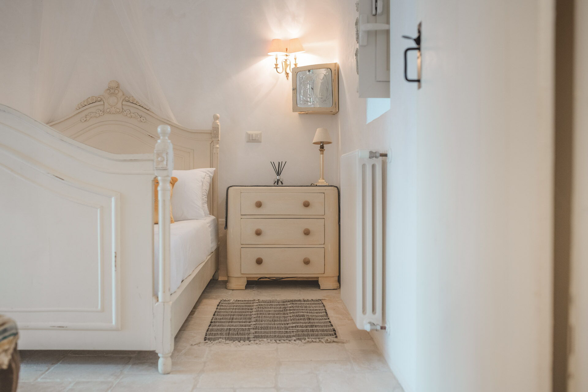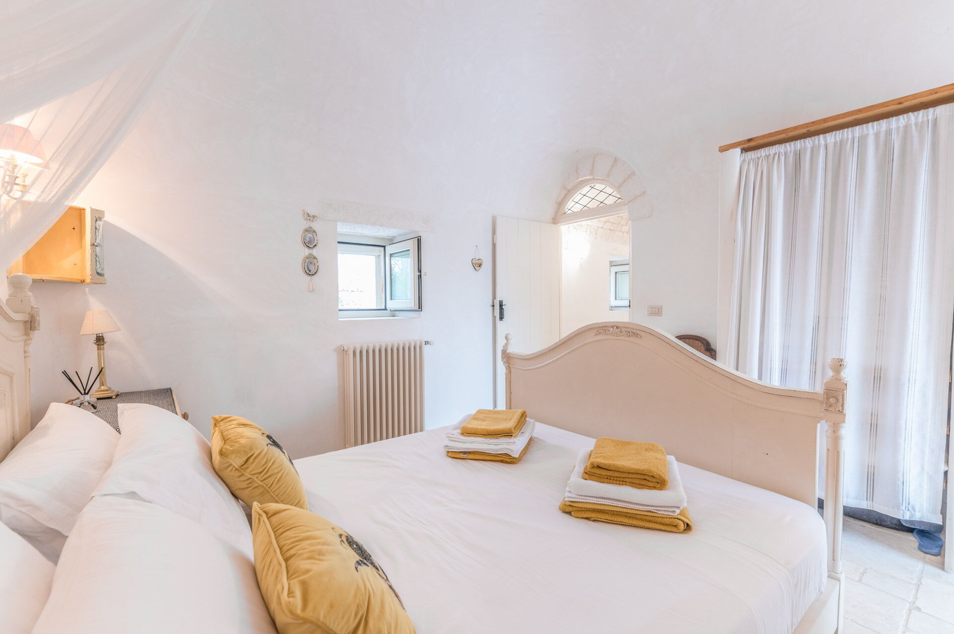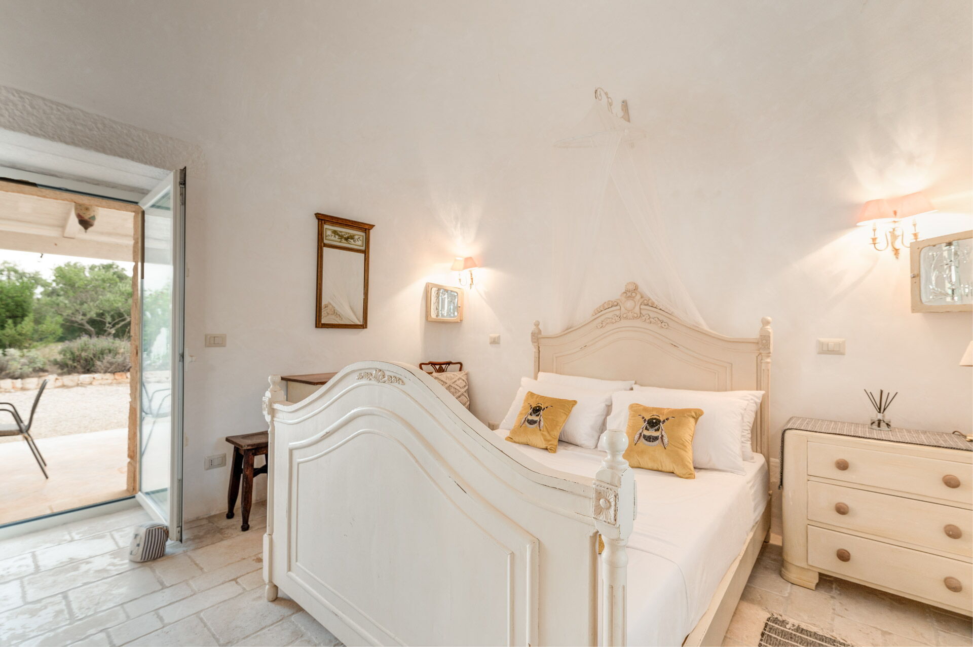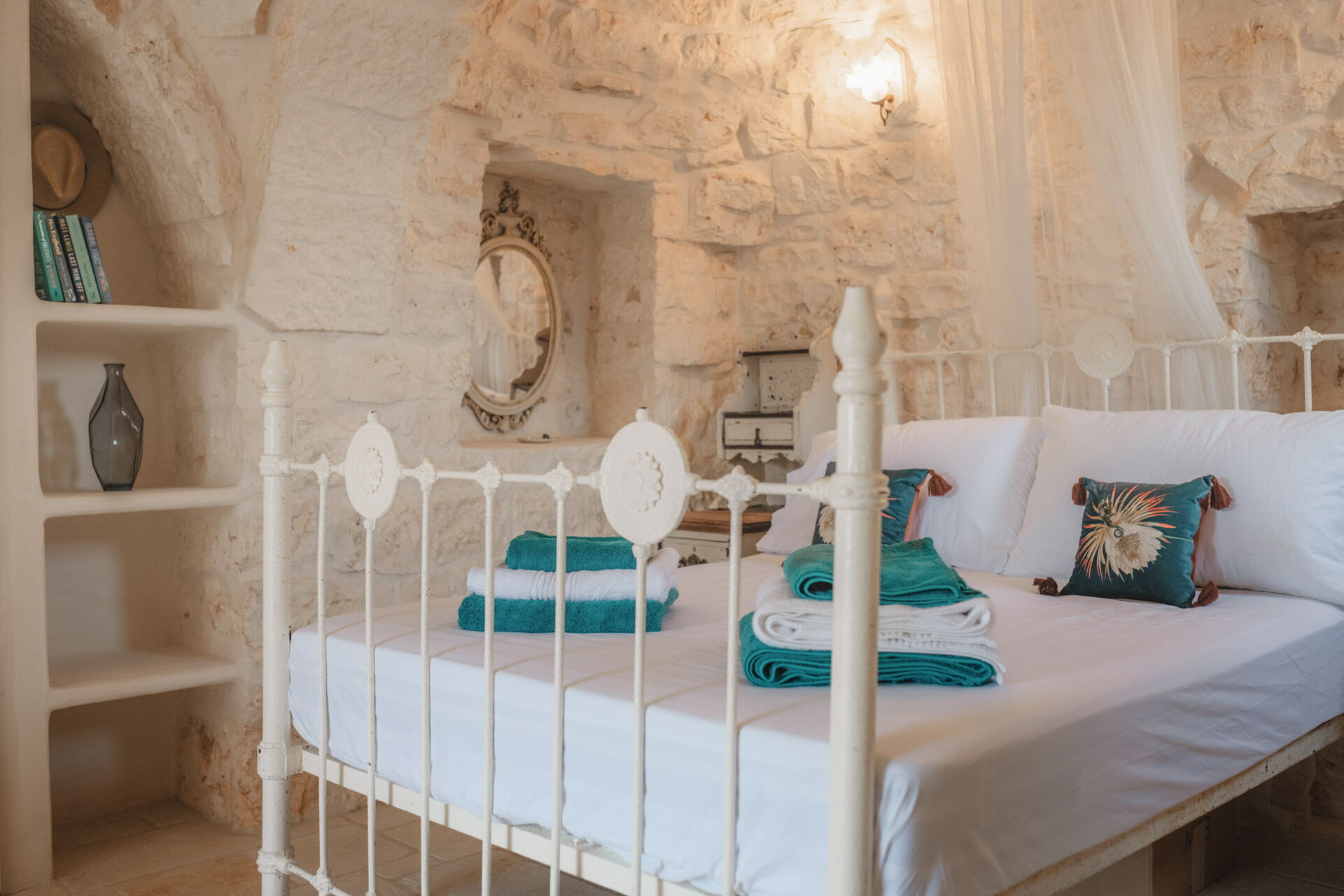 The main bedroom, with independent external and internal access, can be reached from the kitchen, is located in the most historic and ancient part of the Trullo and has exposed stone walls. The room has a double bed with a wrought iron structure, two bedside tables, and a chest of drawers. With private access from the bedroom, there is the bathroom, with a window, complete with sink, toilet, bidet and shower.