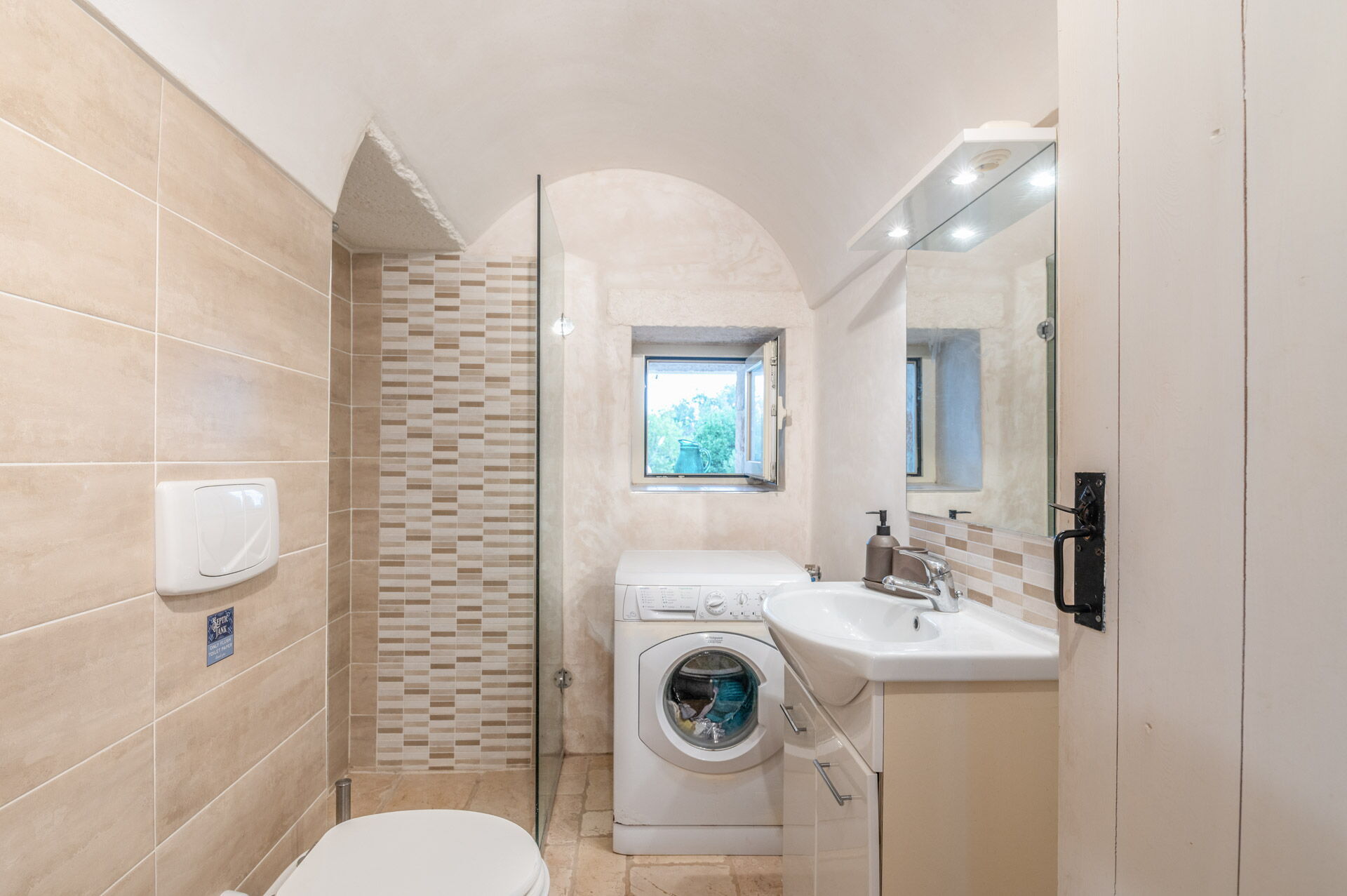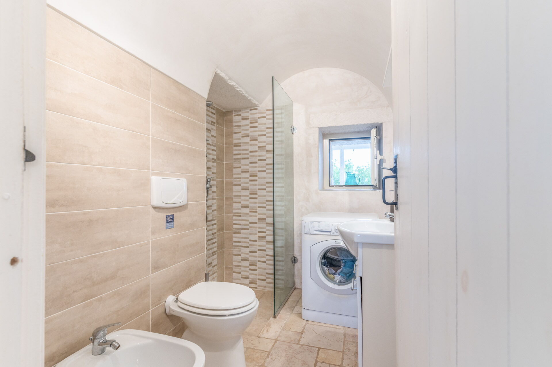 The second bedroom, with independent external internal access, has whitewashed plaster walls and a wooden double bed with a headboard that shares a bathroom with a window complete with shower, toilet, bidet, sink and washing machine.