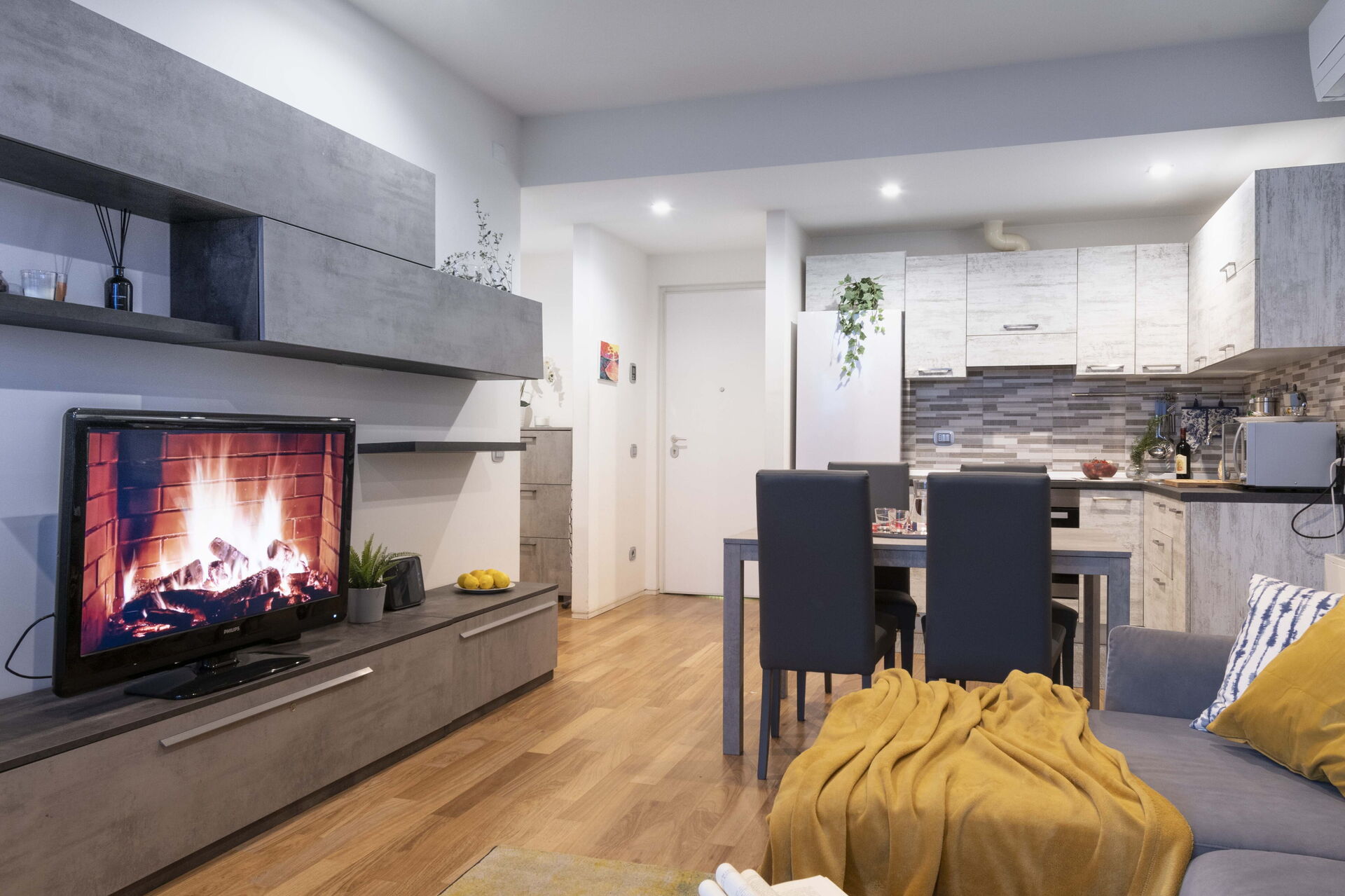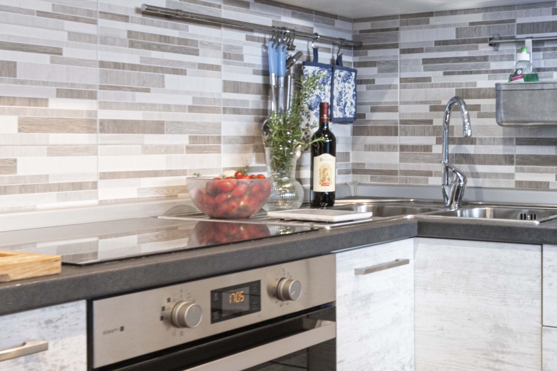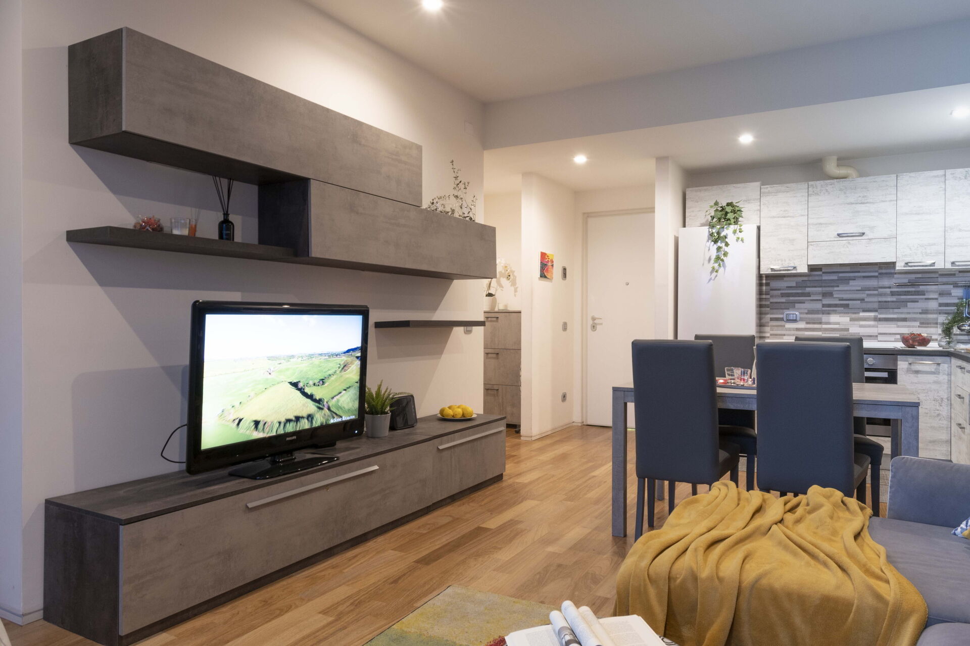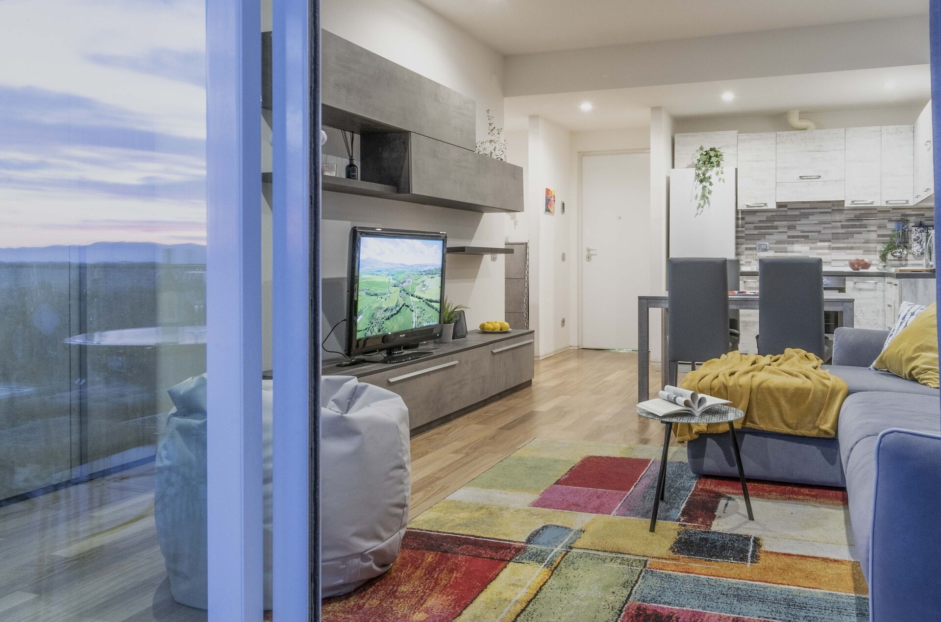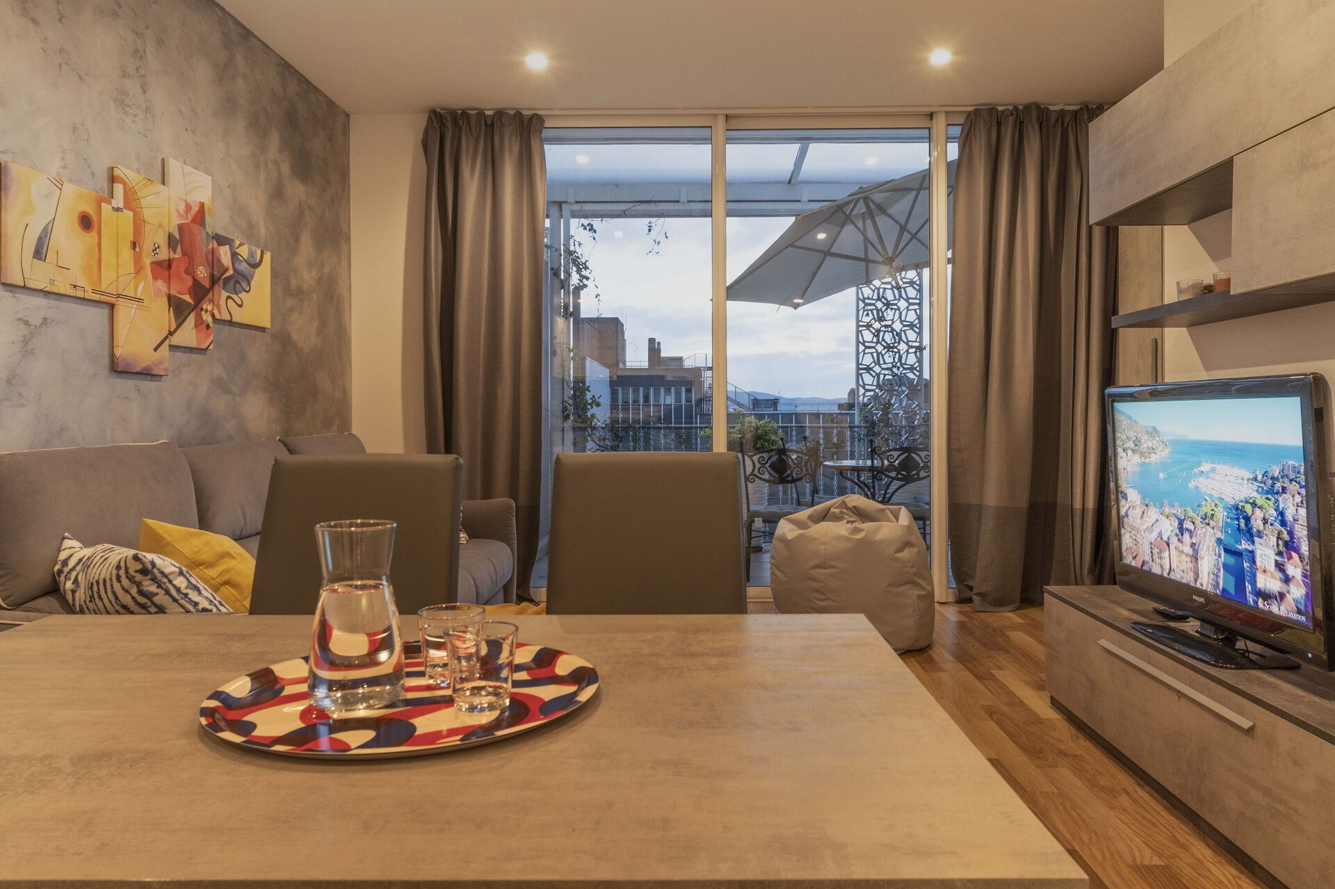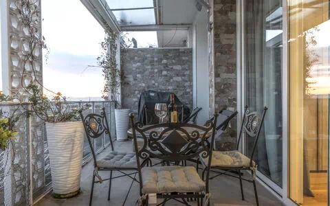 Cocina-salón: cocina bien equipada, mesa de comedor, lavavajillas, frigorífico, congelador, microondas, horno, tostadora, máquina de café italiana, máquina de café americana, escritorio, sofá cama de matrimonio, WIFI internet, internet, aire acondicionado, tv vía satélite, acceso a la terraza.
