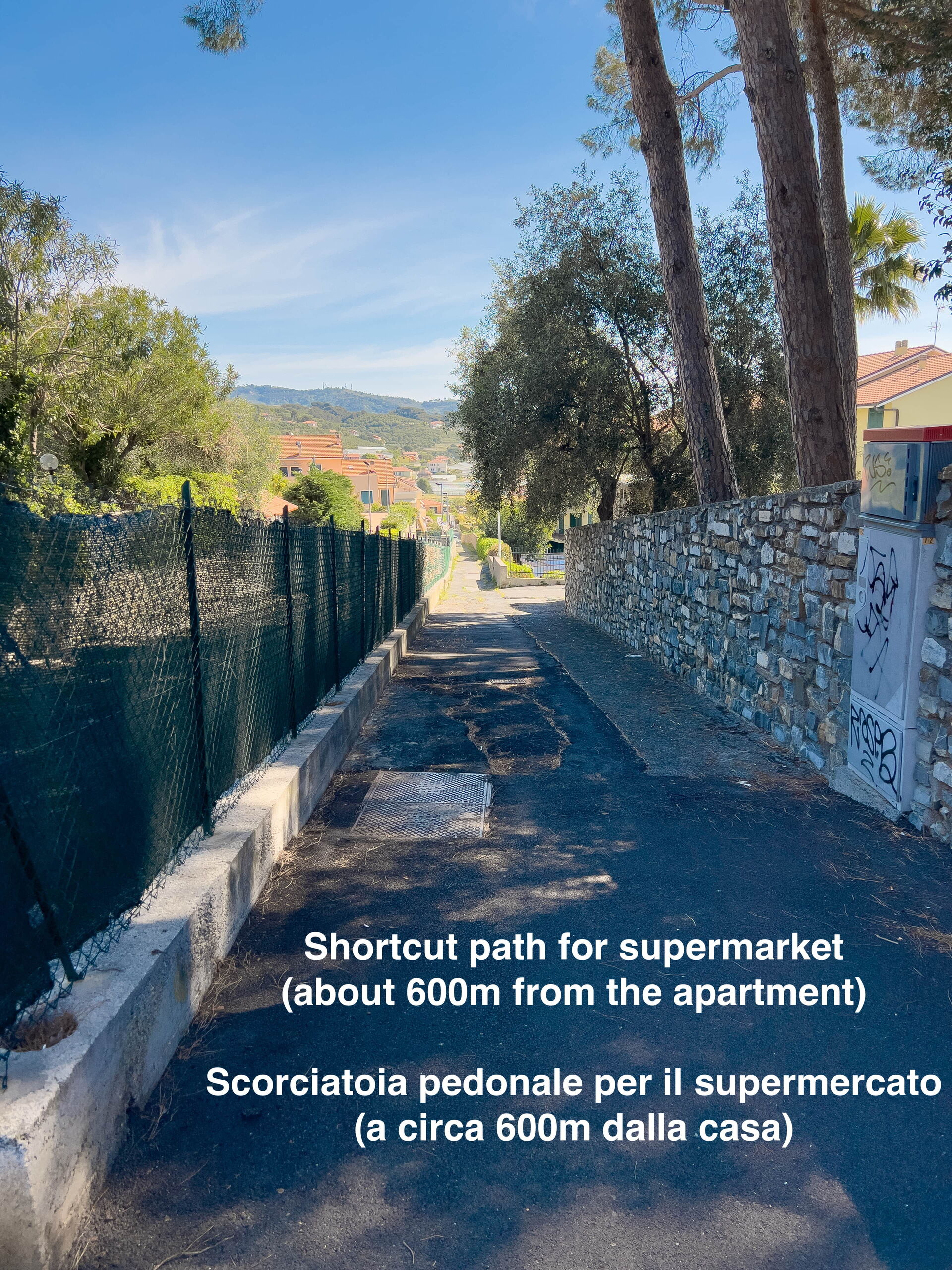 Tenga en cuenta que los últimos 300 metros para volver al apartamento son ligeramente cuesta arriba. Gran supermercado a 650 m (con ligera subida/bajada).