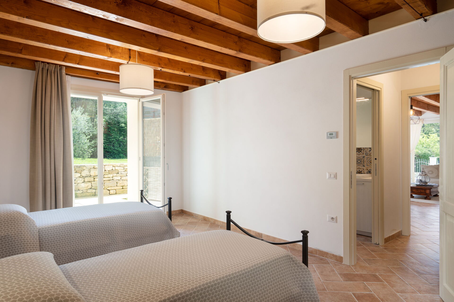 Habitación: tres camas individuales, WIFI internet, aire acondicionado, acceso al jardín.
