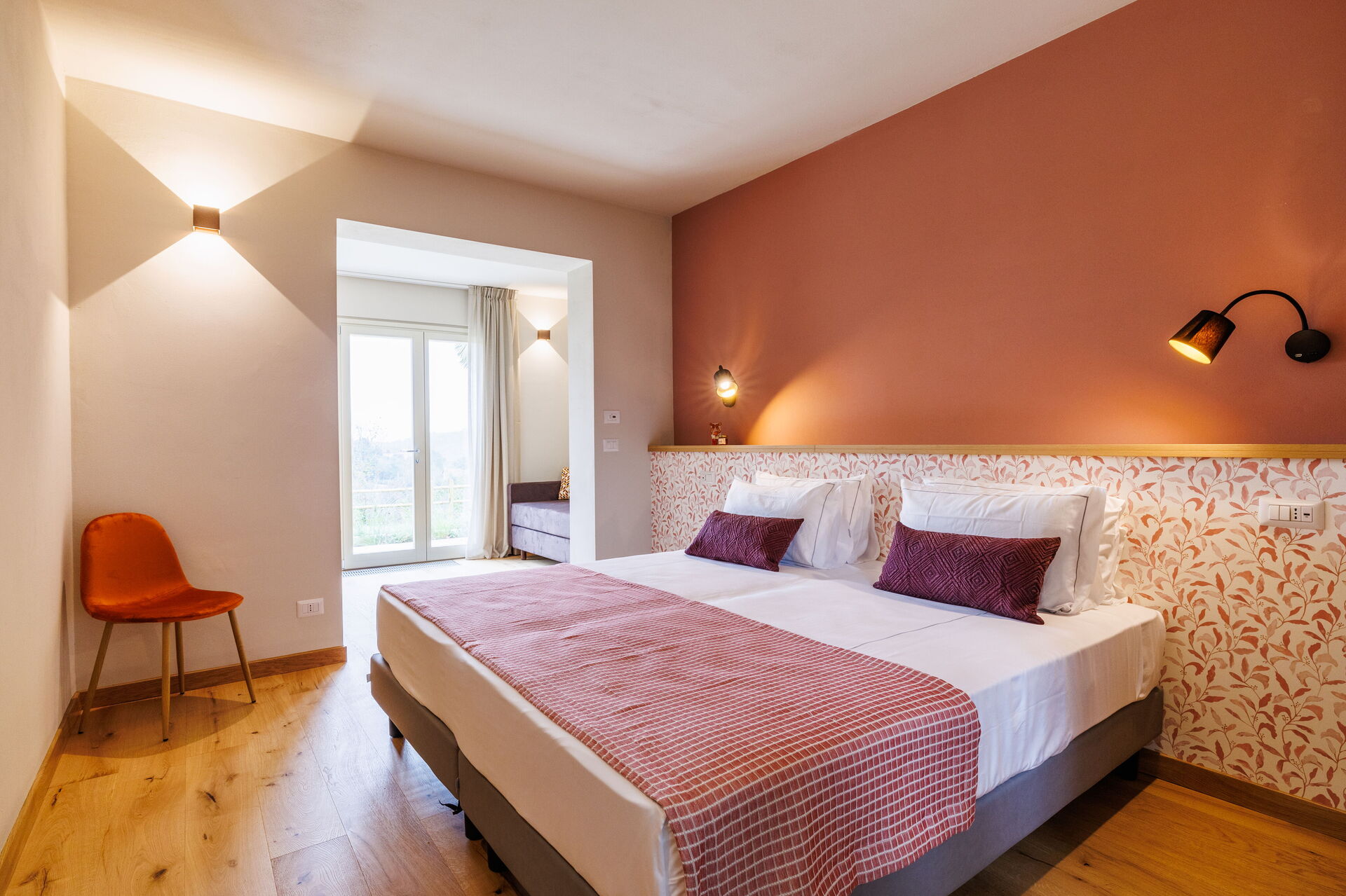 Habitación con baño 3: cama doble, sofá cama, WIFI internet, aire acondicionado, lavabo, baño, bidé, ducha, secador.
