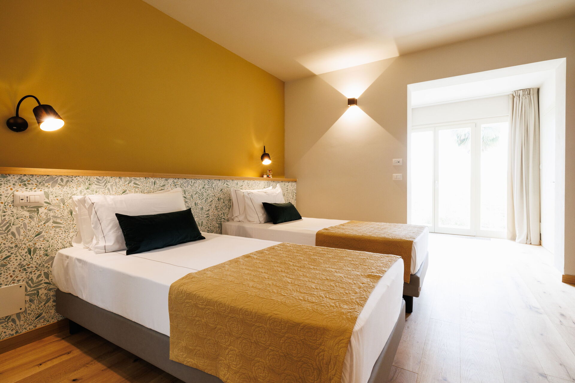 Habitación con baño 7: cama doble, dos camas individuales, WIFI internet, aire acondicionado, lavabo, baño, bidé, ducha, secador, altillo.