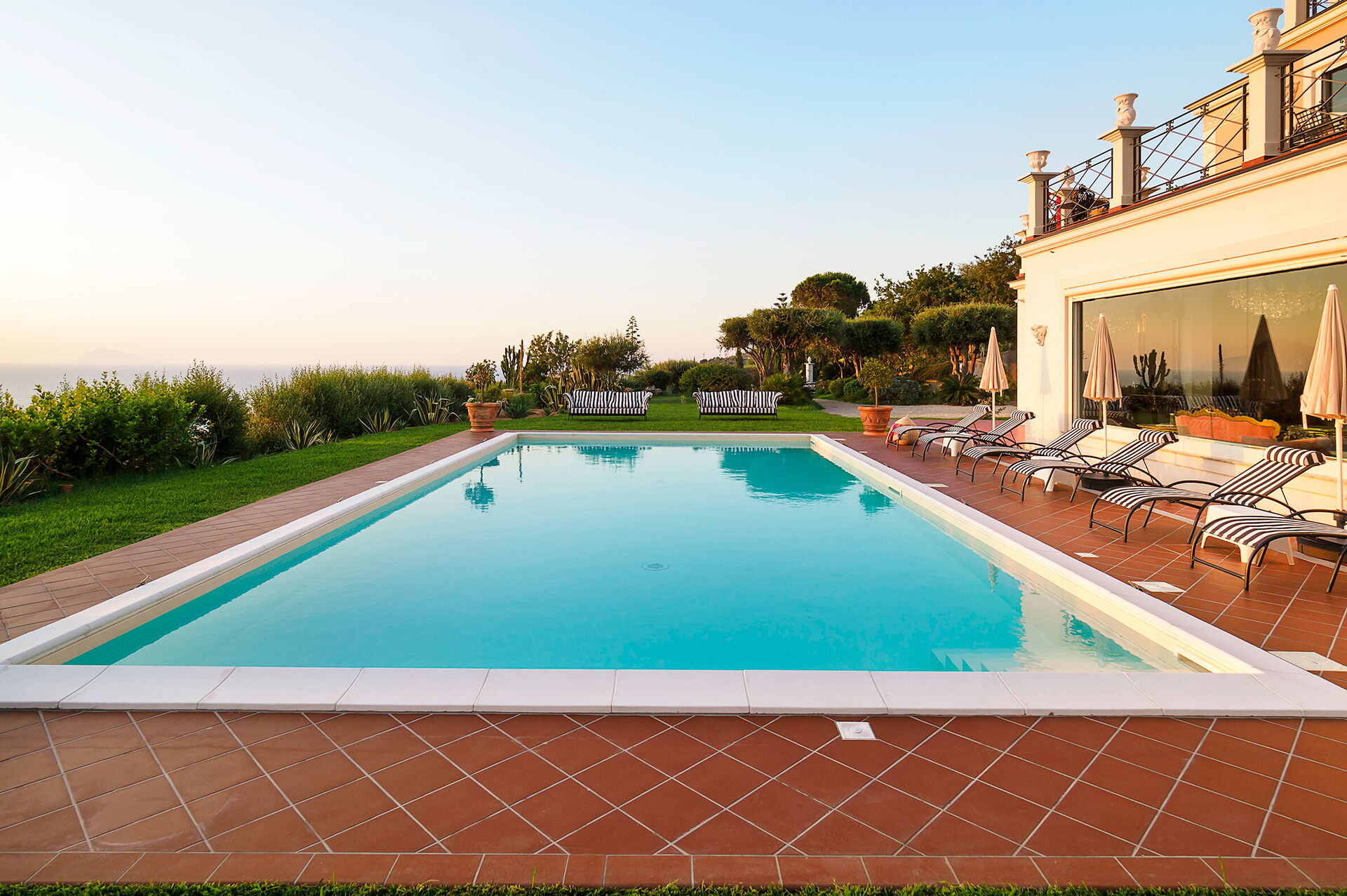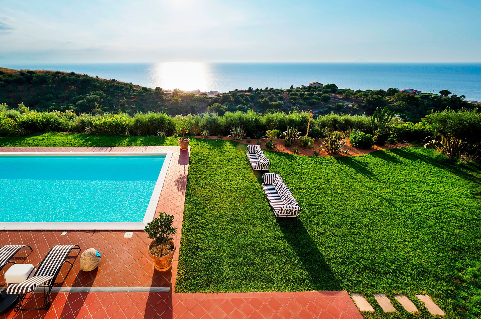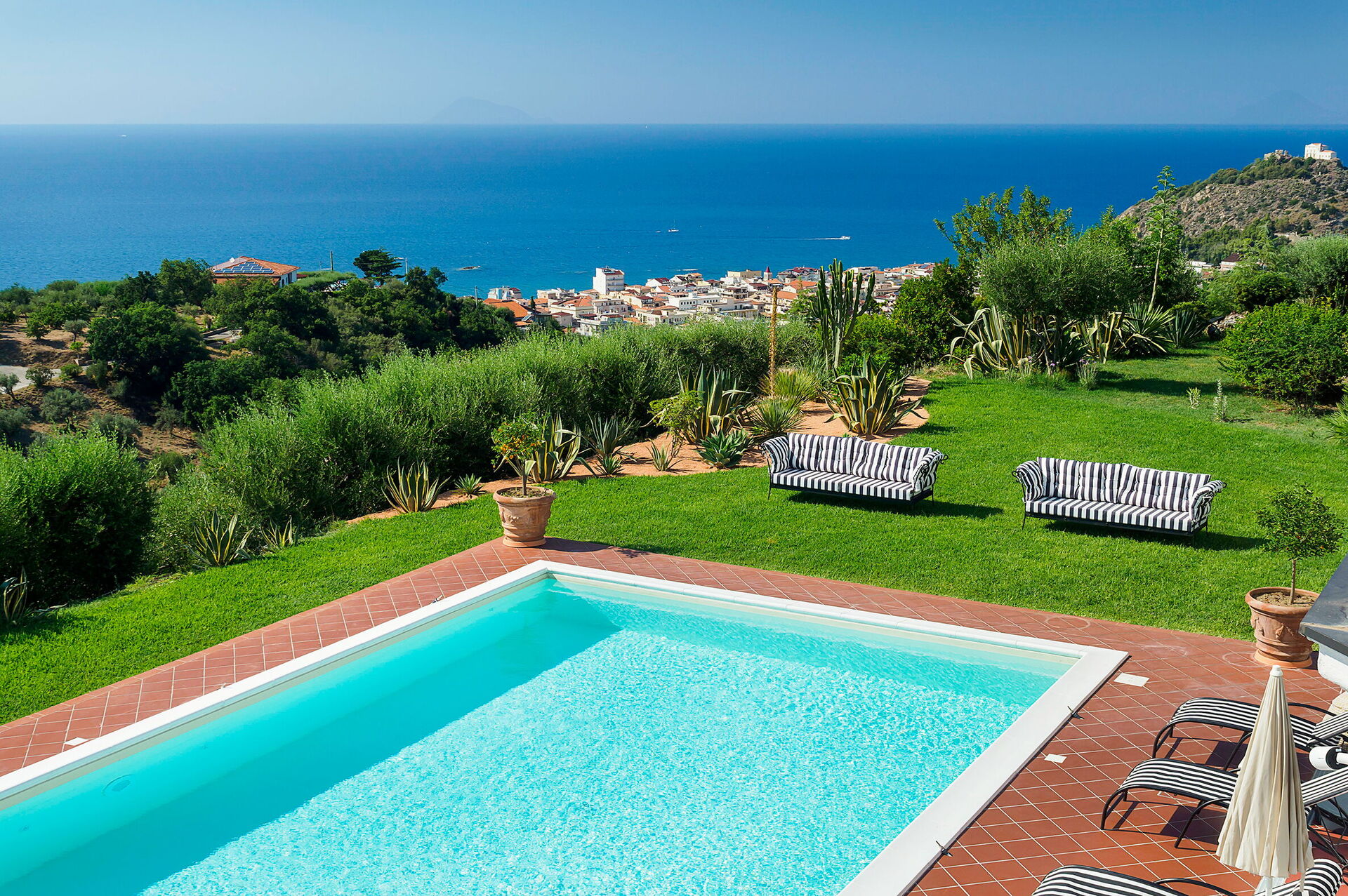 Villa Ester is a luxurious residence with a large lush garden with swimming pool (6x12 m, depth 1.40 m) located near Capo d'Orlando, a renowned seaside resort on the north coast of Sicily. The villa is in a quiet, sunny and panoramic position offering an enchanting view of the sea and the Aeolian Islands, particularly beautiful at sunset. It is equipped with various comforts, including air conditioning and Wi-Fi internet, it is elegant and refined, recently built, with a perfect combination of furnishings and precious materials. Marble floors, antiques and sumptuous lamps characterize the interior spaces. Some of the main attractions in the area are easily reachable, including the beaches of Capo d'Orlando, the villages of the Nebrodi Park, Cefalù, the archaeological area of Tindari, Taormina, Etna and the Aeolian Islands.
