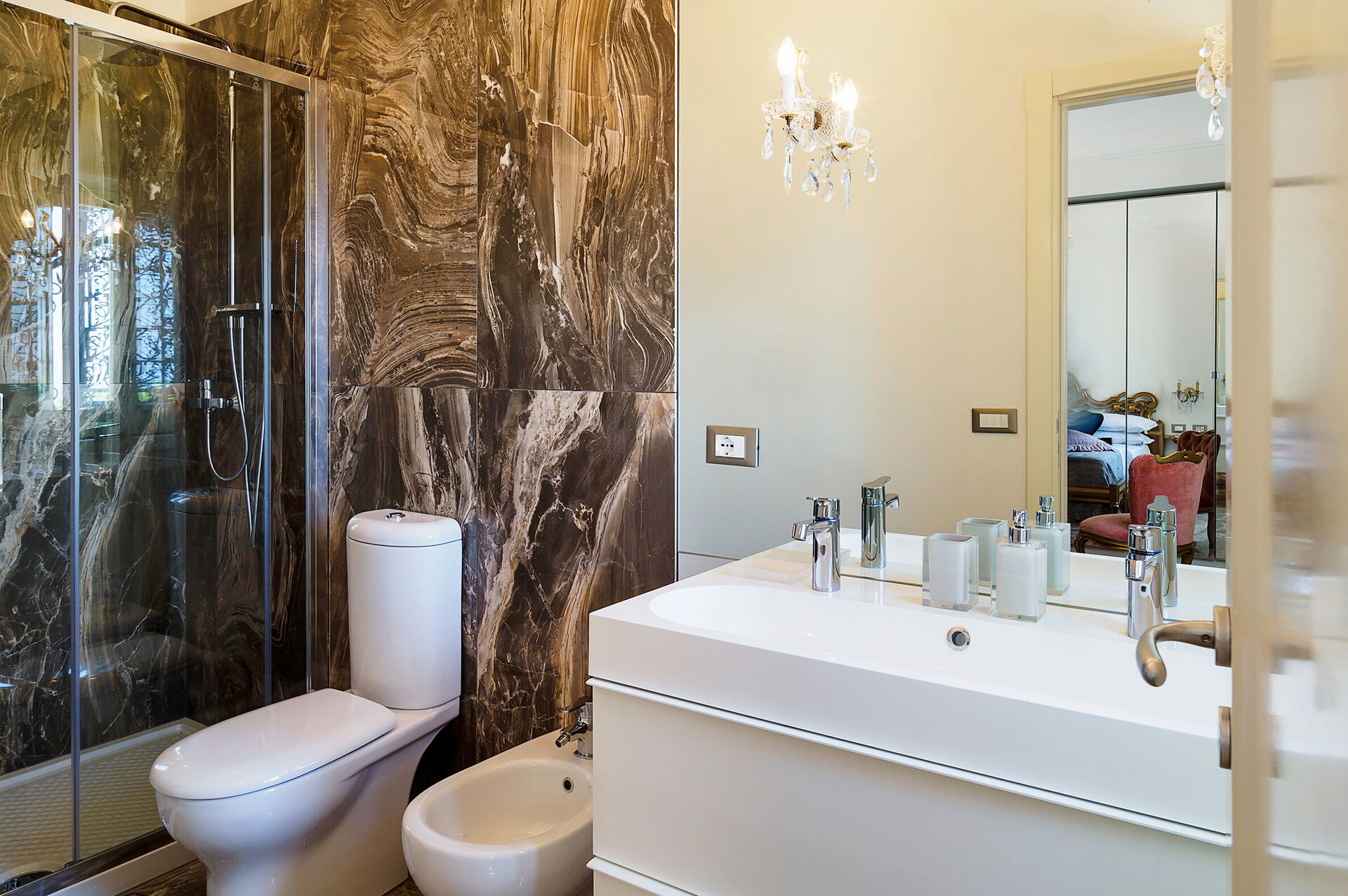 Habitación con baño 1: cama doble, cuna de bebe, WIFI internet, internet, aire acondicionado, mosquitero, tv vía satélite, sillón, lavabo doble, baño, bidé, ducha, secador.