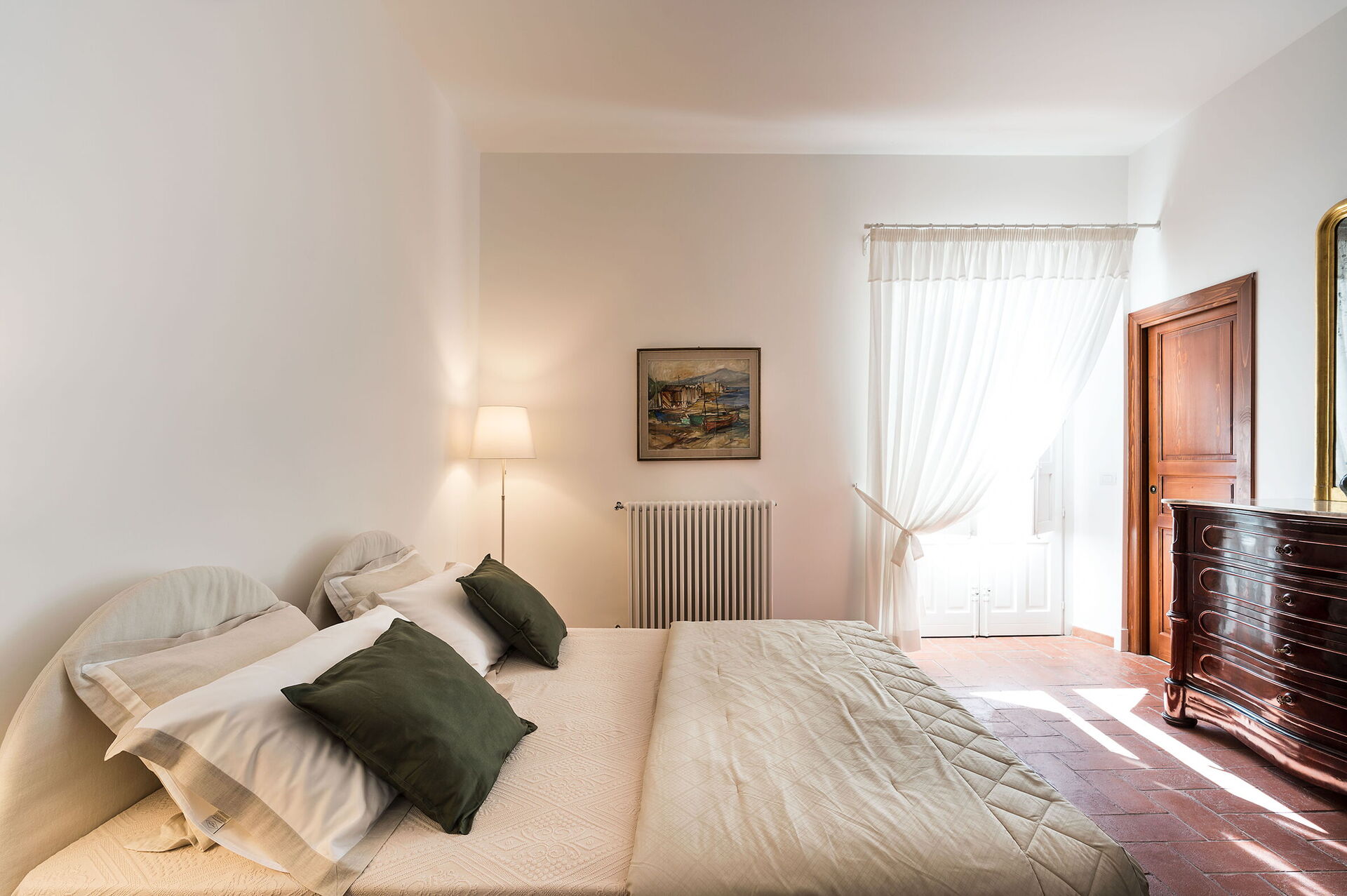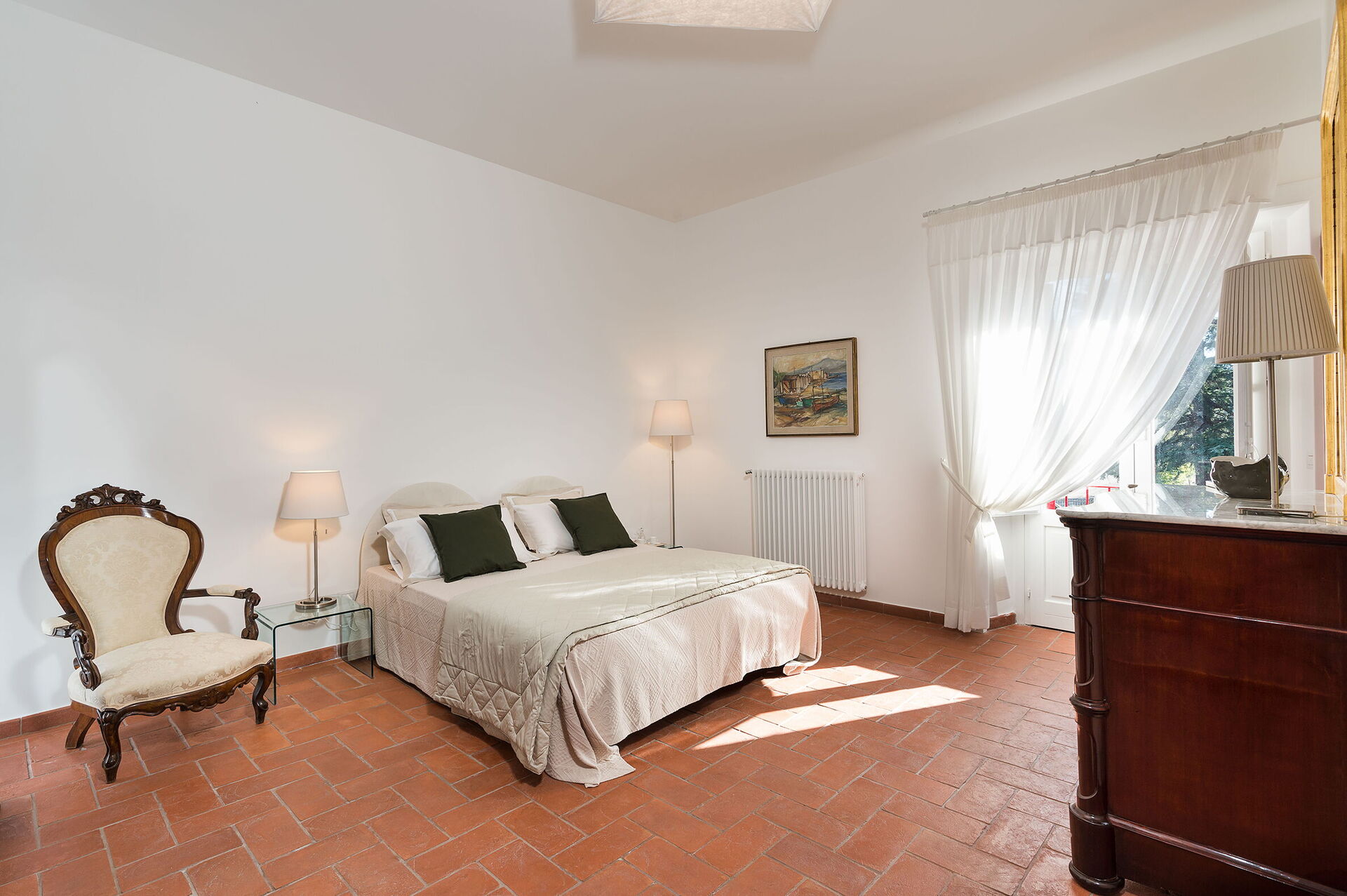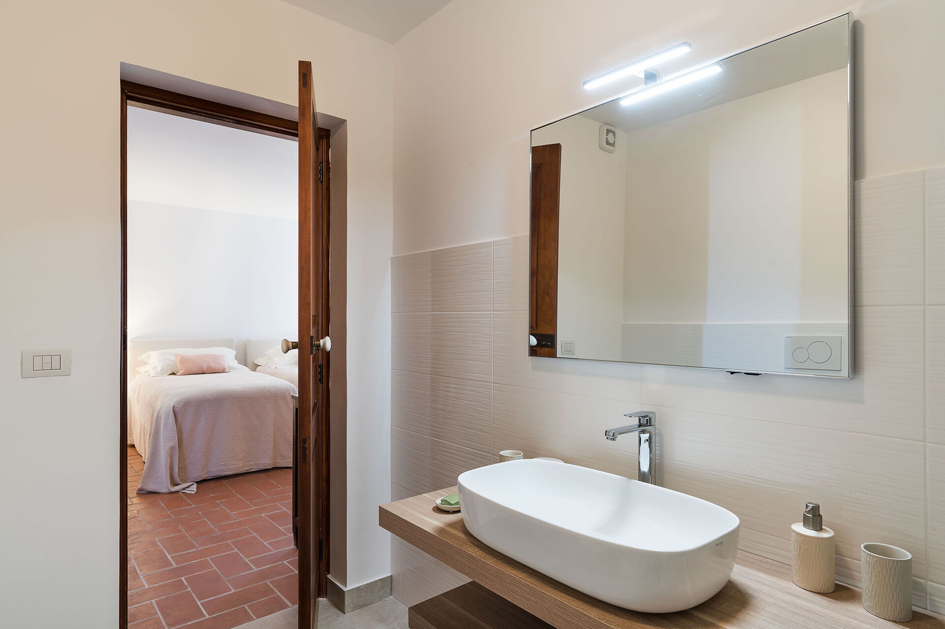 Habitación con baño 1: cama doble, cuna de bebe, WIFI internet, internet, aire acondicionado, sillón, lavabo doble, baño, bidé, ducha, secador, lavadora, acceso a la terraza.