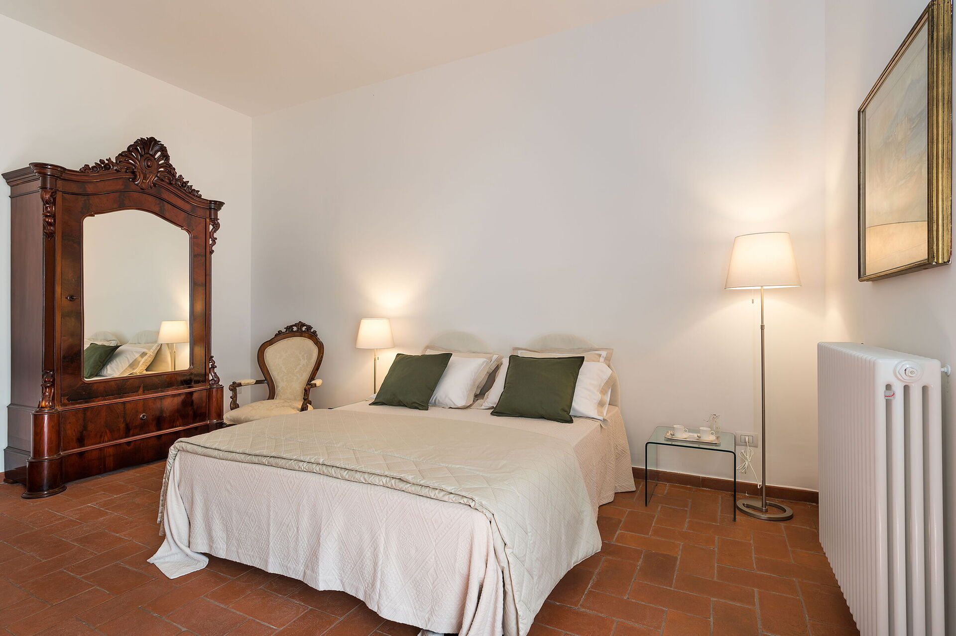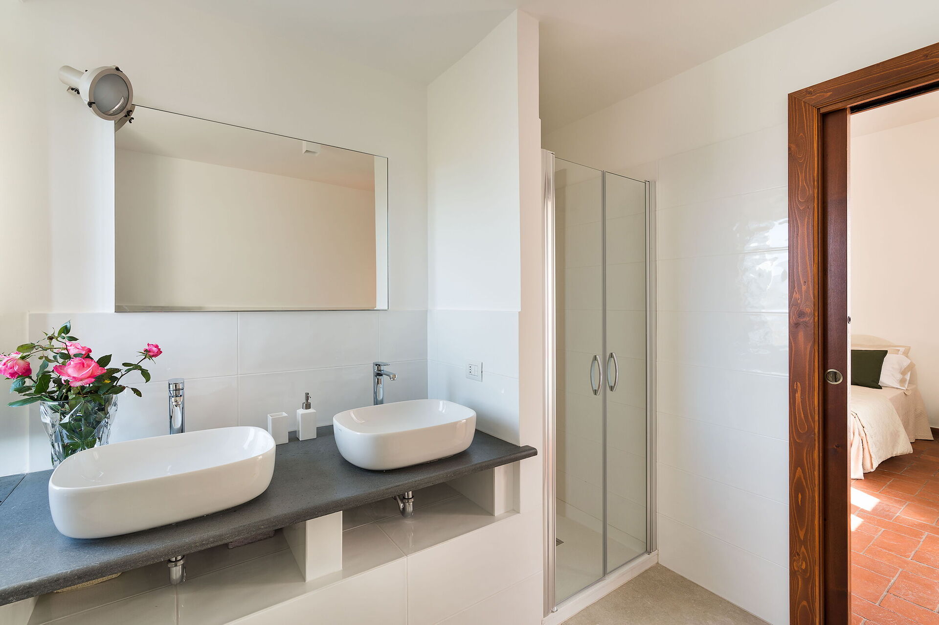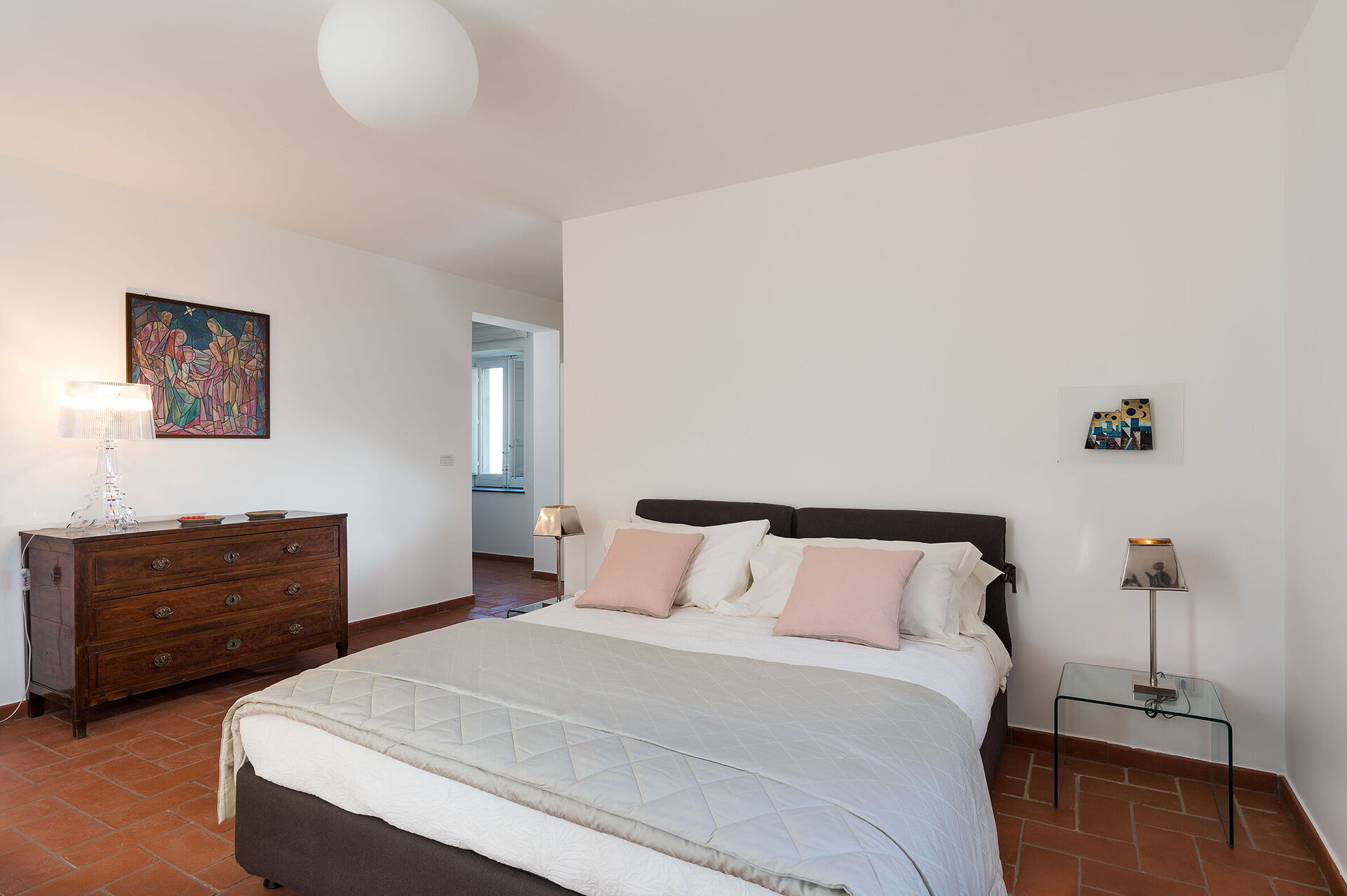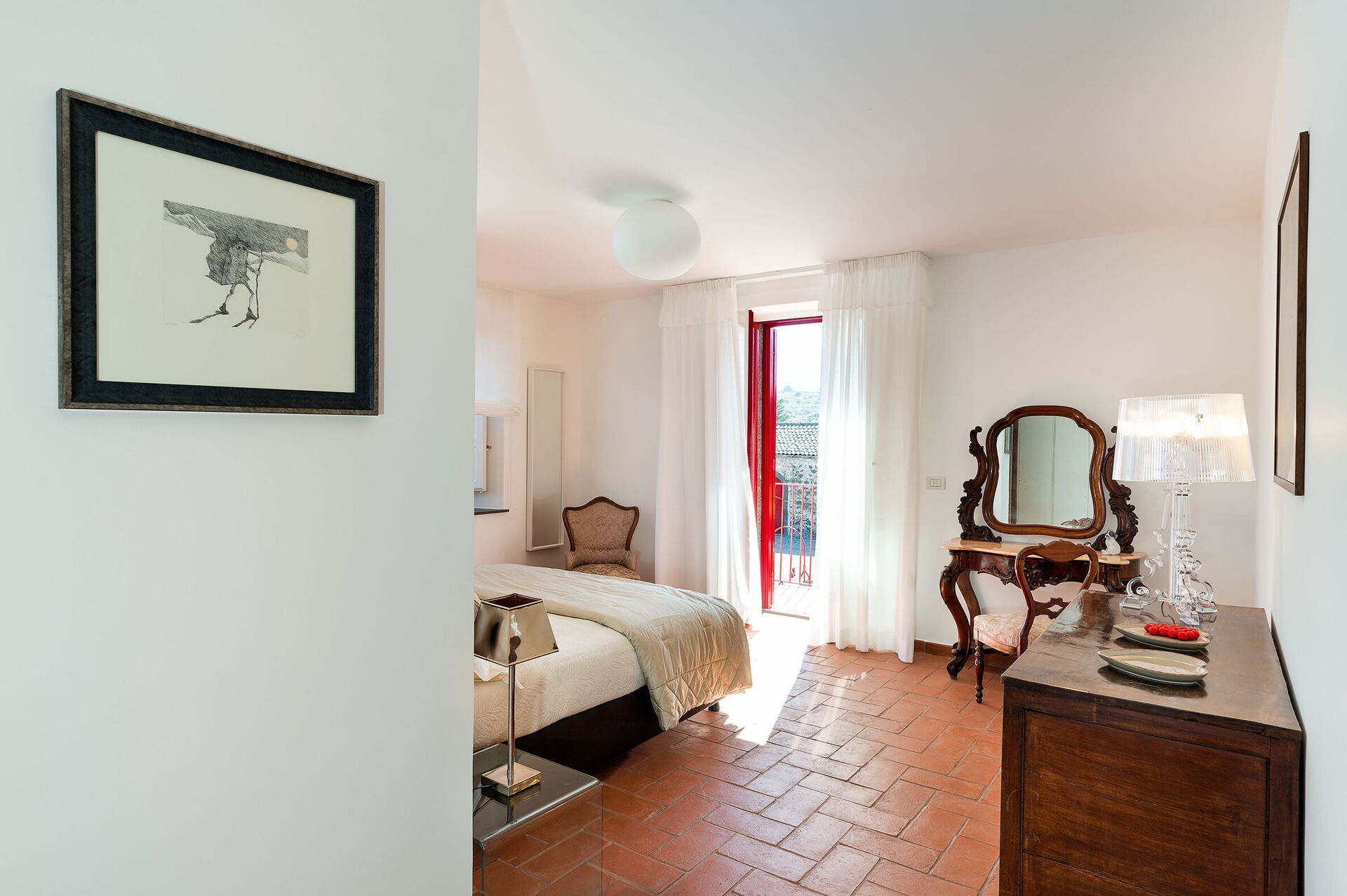 Habitación con baño 1: cama doble, cuna de bebe, WIFI internet, internet, aire acondicionado, sillón, lavabo doble, baño, bidé, ducha, secador, lavadora, acceso a la terraza.
