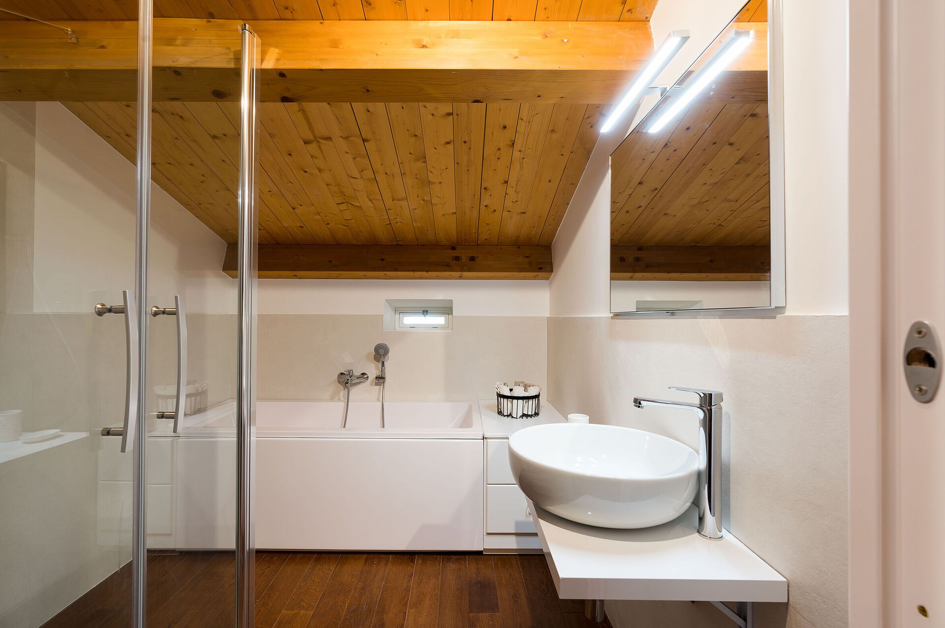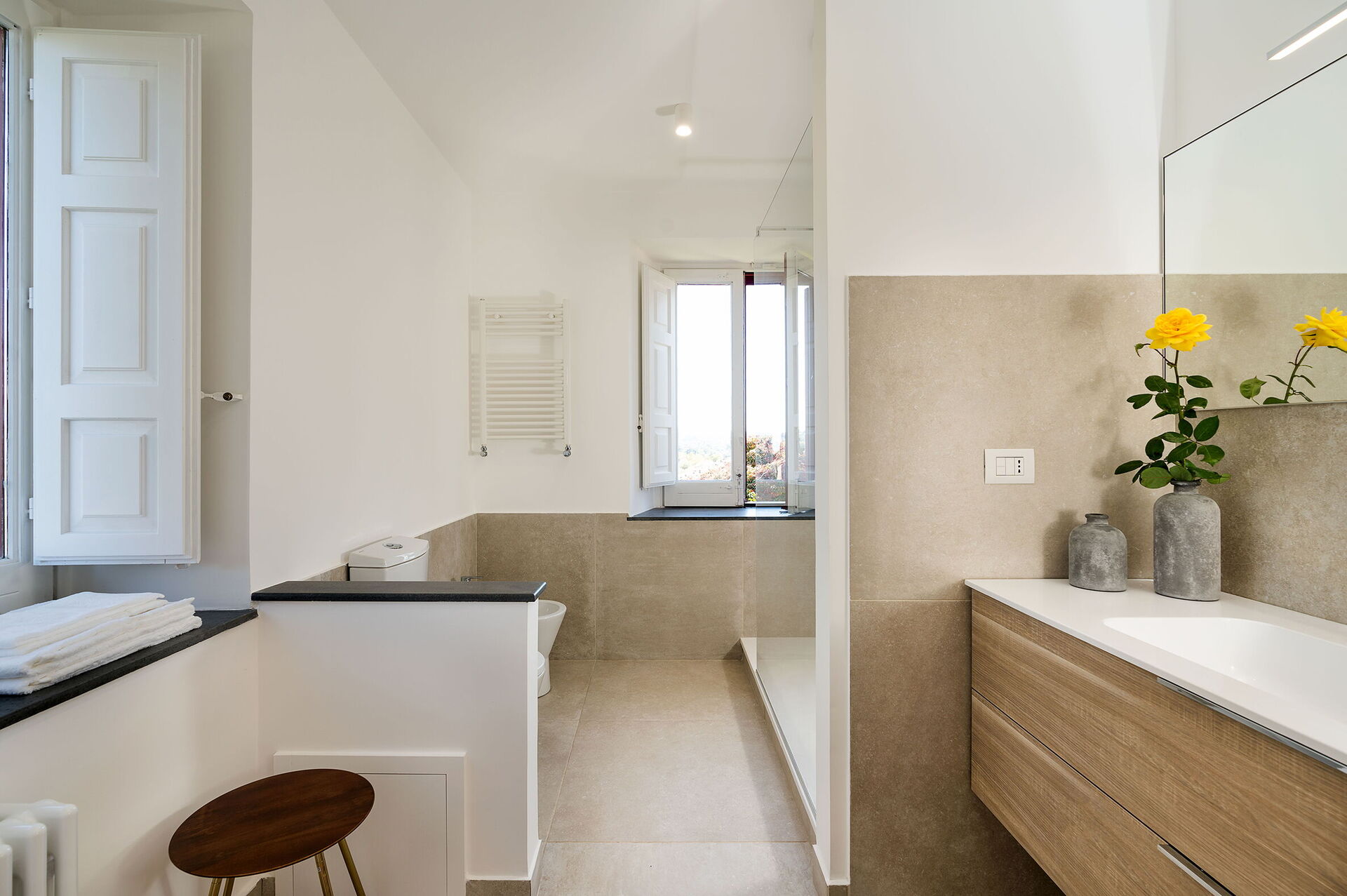 Habitación con baño: cama doble, WIFI internet, internet, aire acondicionado, televisión, sofa, sillón, lavabo, baño, bidé, bañera, ducha.