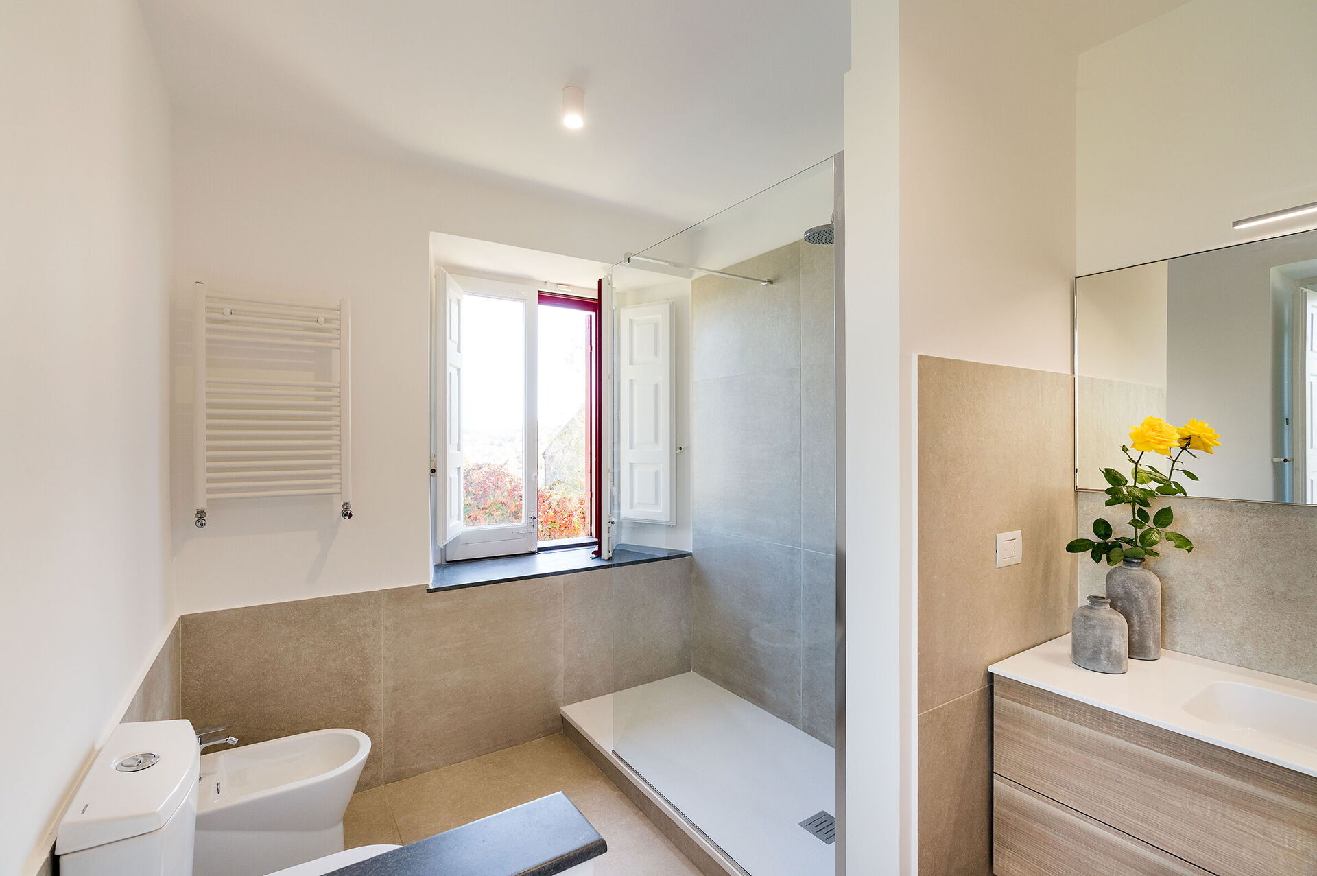 Habitación con baño 3: dos camas individuales, WIFI internet, internet, aire acondicionado, sillón, lavabo, baño, bidé, ducha.
