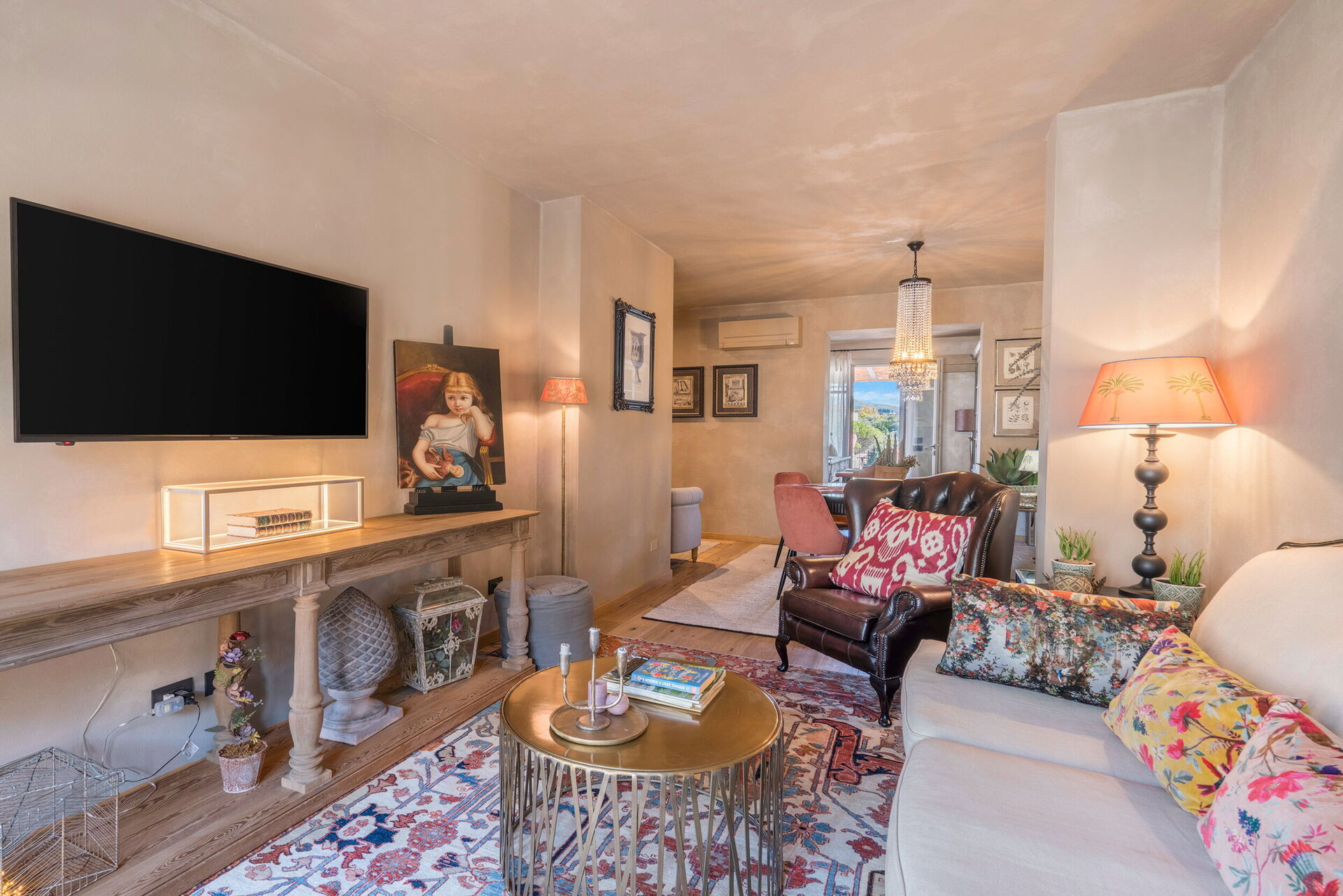 Salón: sofa, mesa de comedor, WIFI internet, aire acondicionado, tv vía satélite, acceso a la terraza.