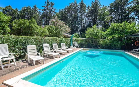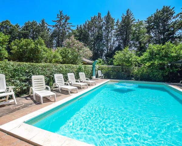 El jardín vallado de 1 hectárea proporciona privacidad completa y una verdadera experiencia de vida en el campo abierto. La piscina mide 5 x 10 metros con una profundidad de 140 cm y está disponible del 15 de mayo al 15 de octubre; cuenta con una ducha exterior. El mobiliario de jardín está distribuido en las áreas exteriores, creando espacios confortables para tomar el sol, leer o contemplar las vistas de los viñedos y campos. La propiedad dispone de una barbacoa y una casa de barbacoa dedicada para cenas al aire libre. Un parque infantil se encuentra dentro del jardín para el disfrute de los huéspedes más jóvenes.