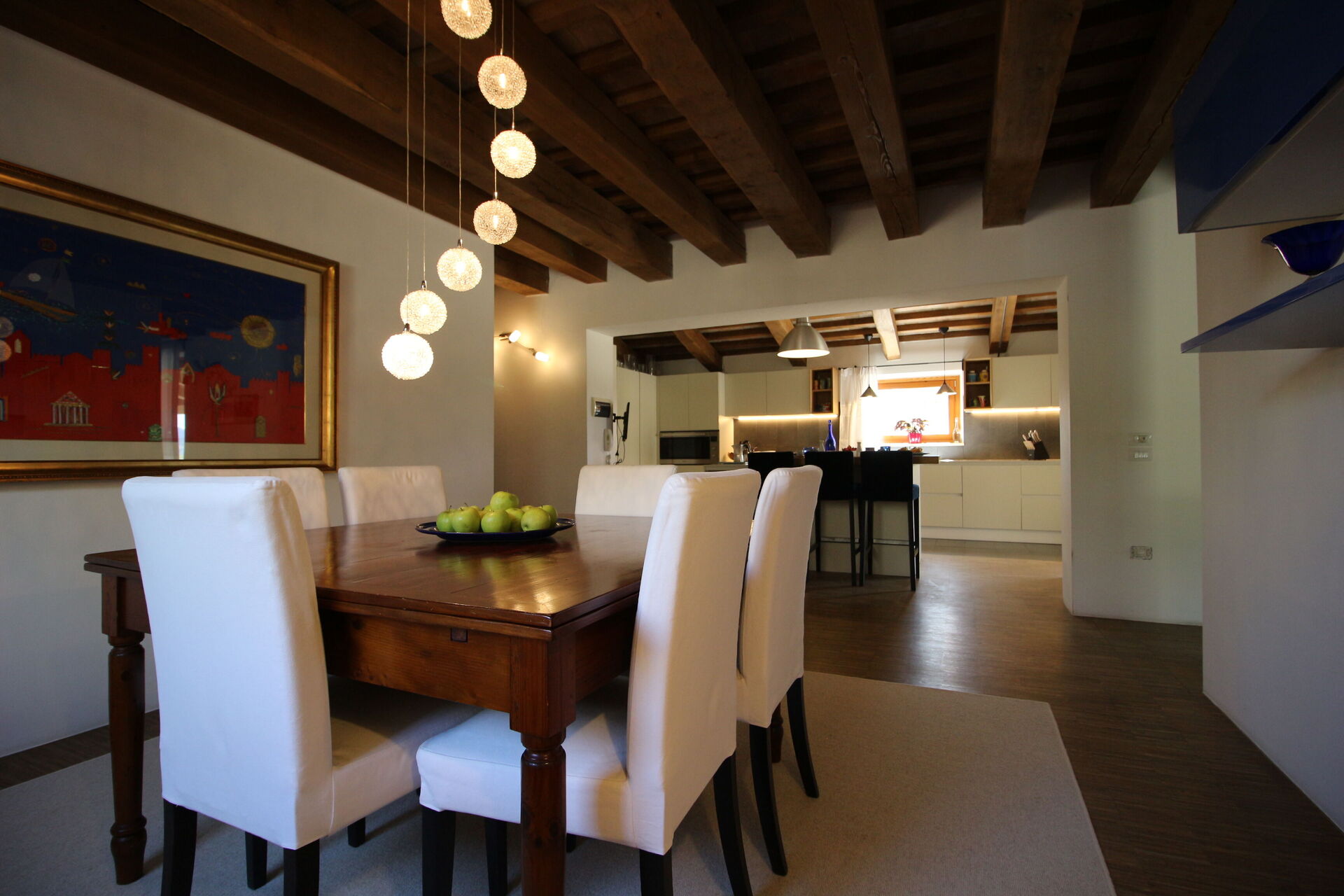 Cocina: cocina bien equipada, mesa de comedor, lavavajillas, frigorífico, congelador, microondas, cocina de gas, cocina a leña, estufa de leña, horno, tostadora, máquina de café italiana, máquina de café americana, WIFI internet, acceso a la terraza.