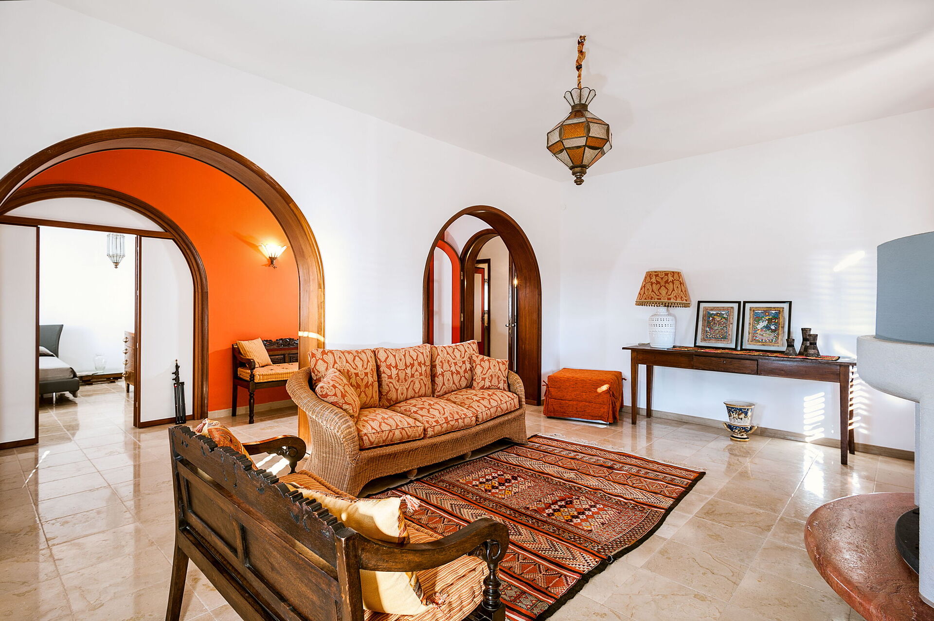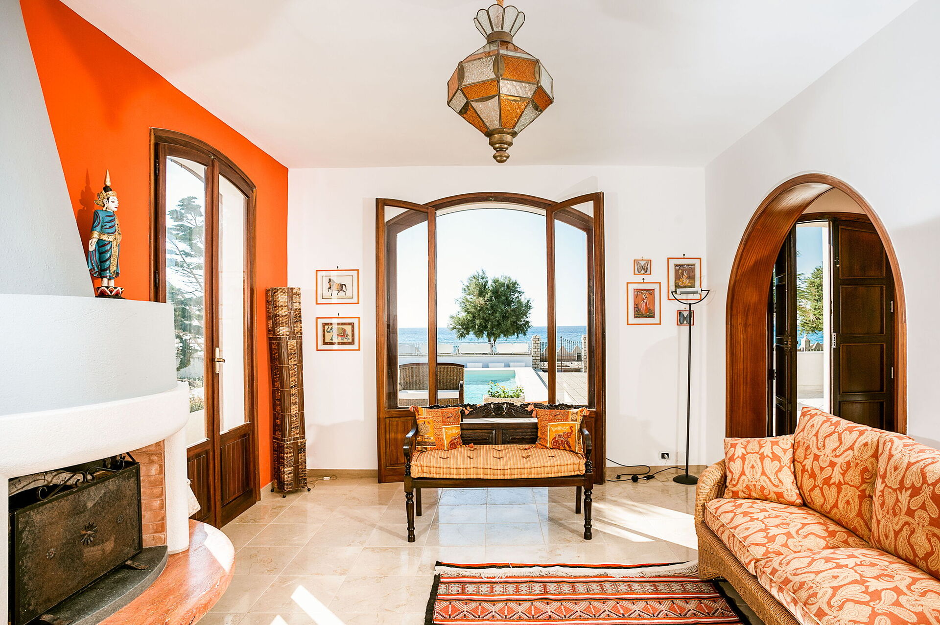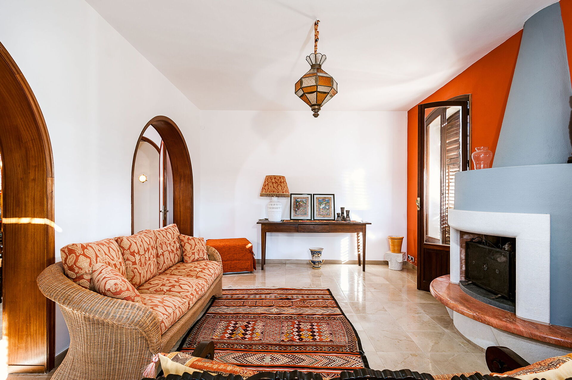 Salón: sofa, chimenea, acceso al jardín, acceso a la terraza.