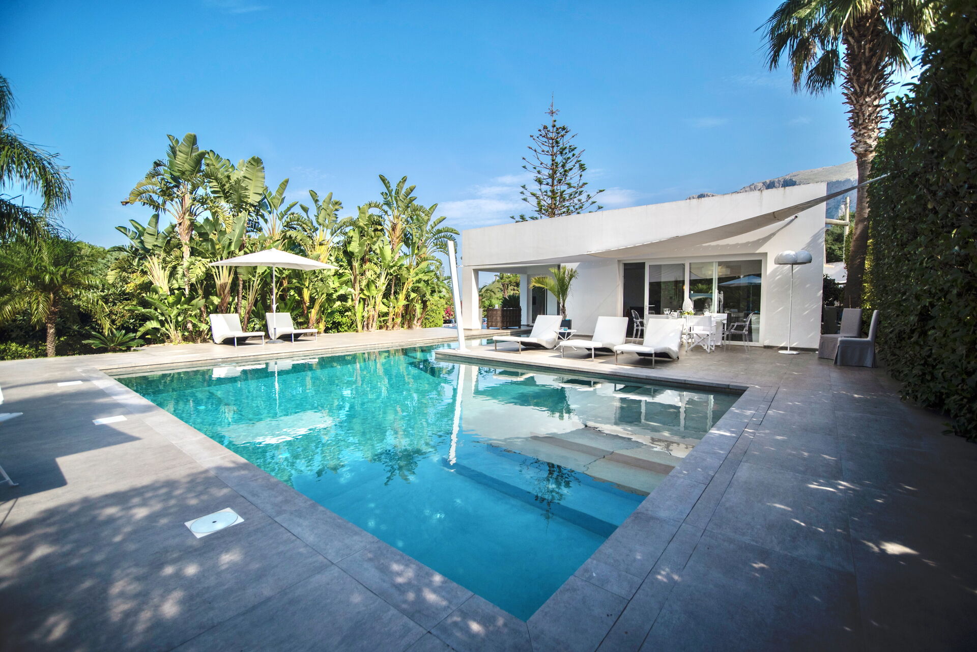 This modernist style property extends on one floor and is located in the garden that surrounds it, while the pure white structure immediately strikes the visitors attention.