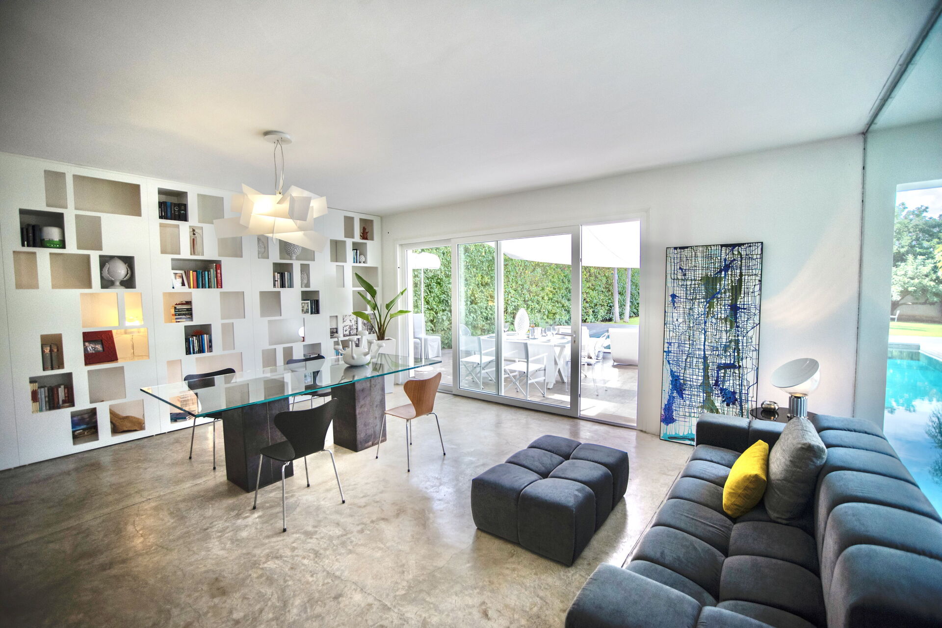 The large living area comprises living room, dining room and kitchen creating a fluid open-plan space, emphasized by the natural concrete floor and the large windows that redefine the interior space so that it becomes one with the outside.