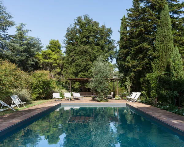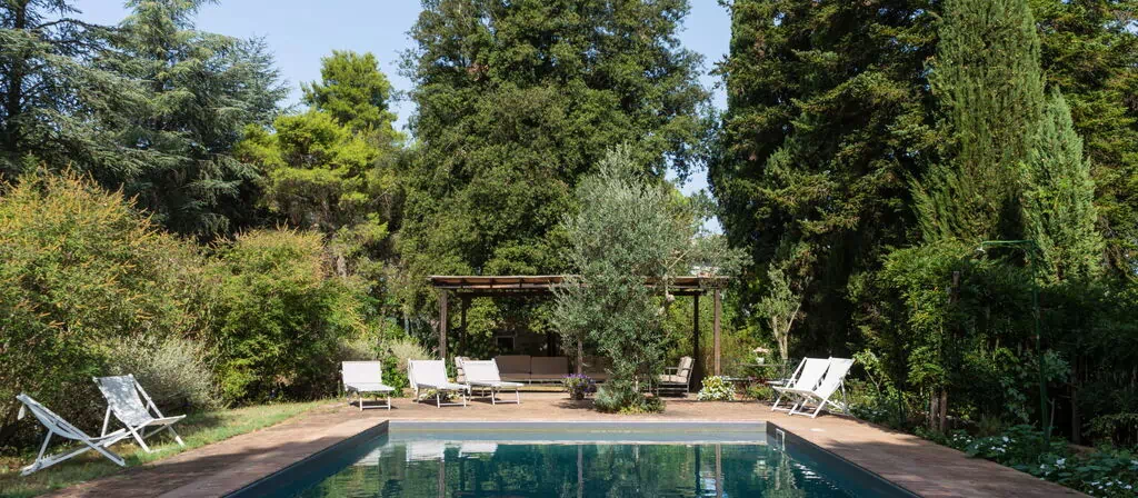 El jardín privado de 1 hectárea envuelve la villa en vegetación exuberante y bien cuidada, creando un entorno sereno y pintoresco completamente vallado para garantizar privacidad. La piscina compartida mide 12 x 6 metros con una profundidad de 150 cm y está disponible del 15 de mayo al 15 de octubre. La posición elevada de la propiedad en lo alto de la colina asegura que los espacios exteriores disfruten de vistas panorámicas sobre la campiña de Umbría y Lazio sin urbanizar.