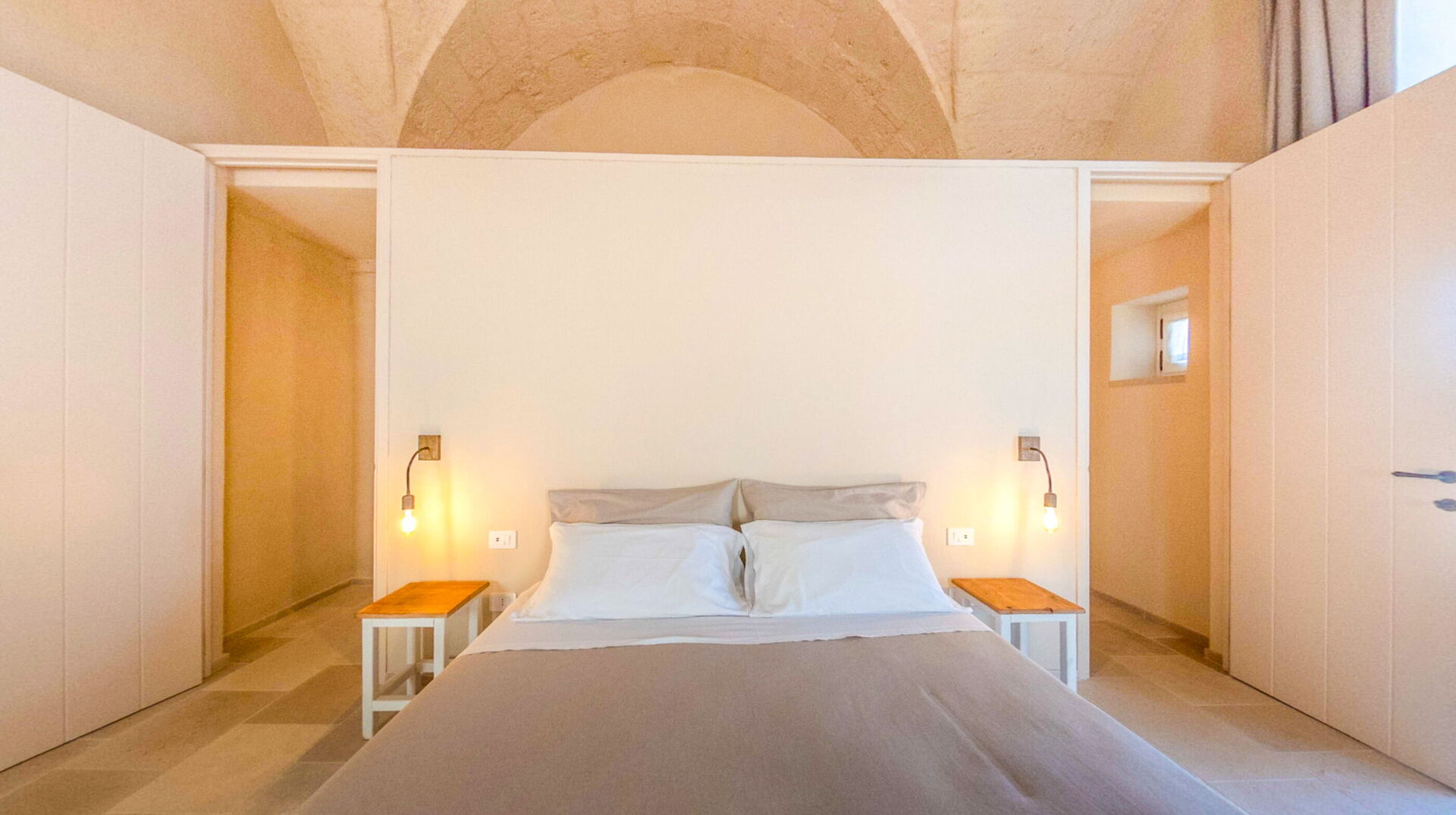 Located on the ground floor of Masseria Vaccaro, with the external entrance, it is a spacious room for two people, the ideal location for unforgettable stays and holidays in Puglia.