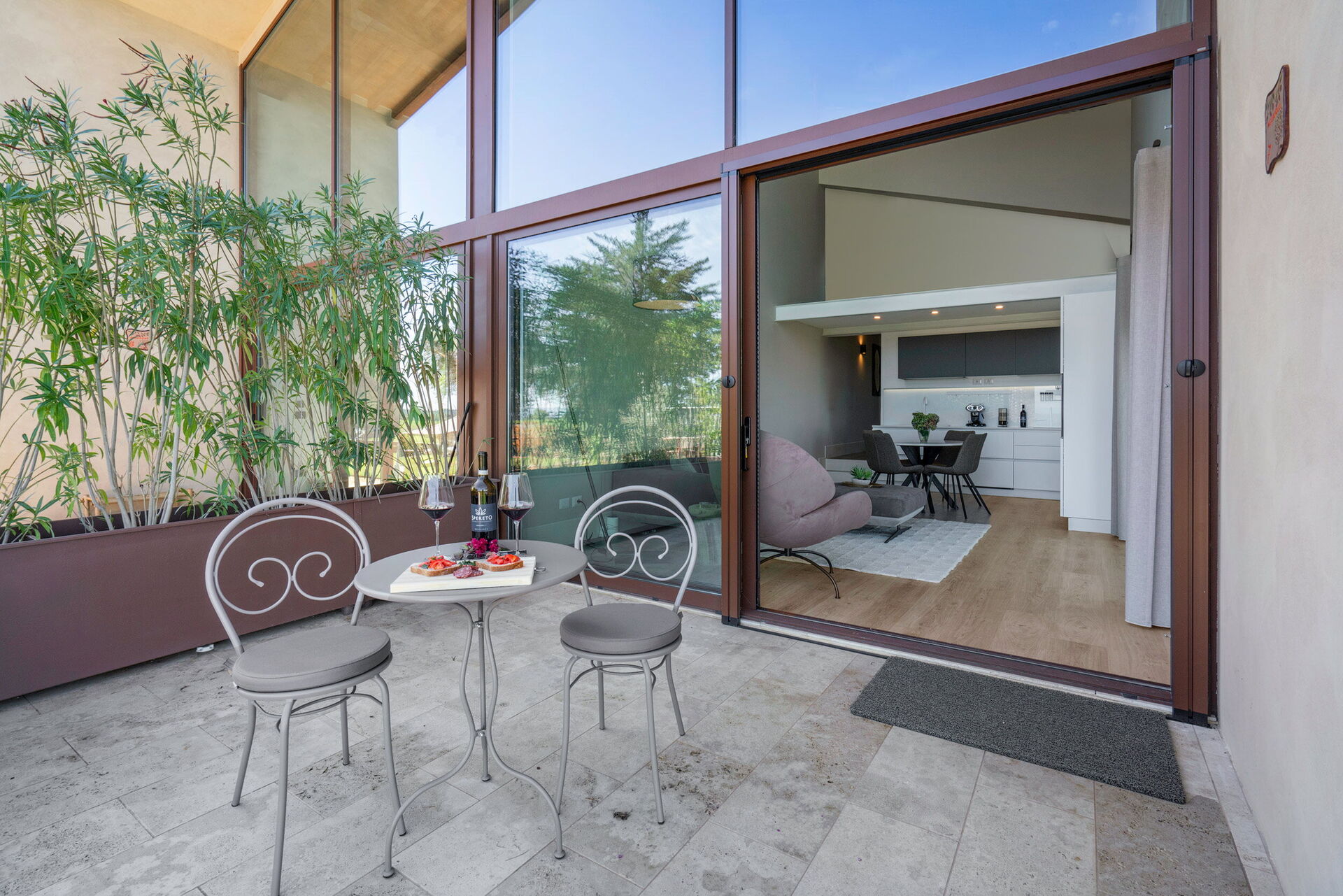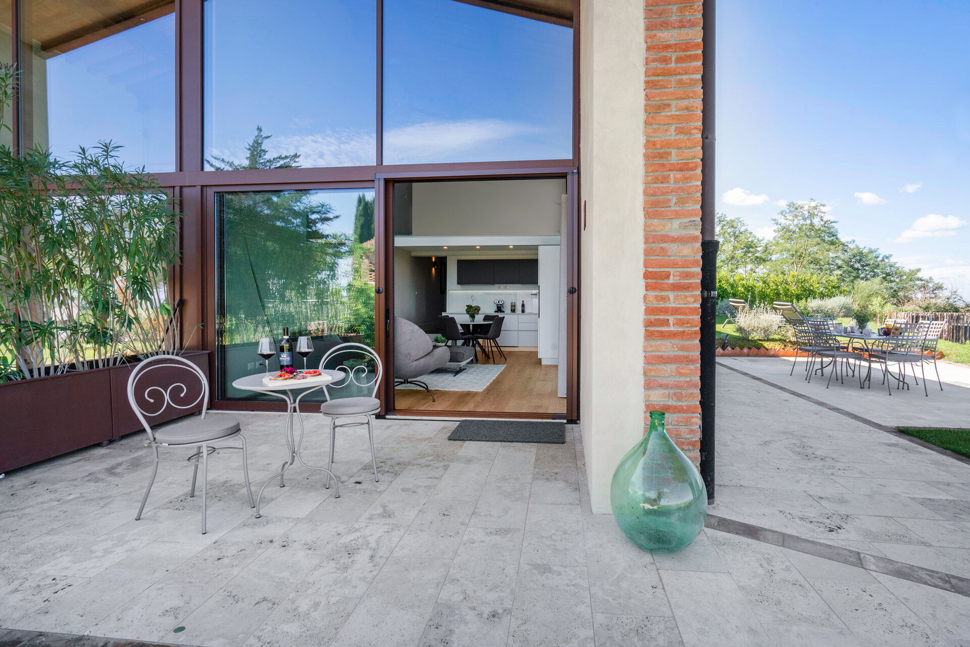 La piscina está climatizada de mayo a octubre y es compartida exclusivamente por los diez apartamentos y tres villas.