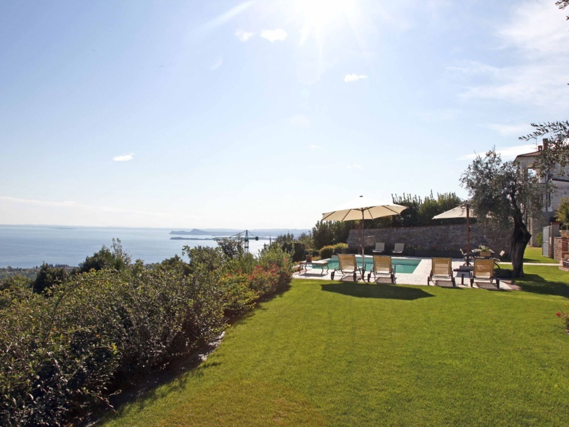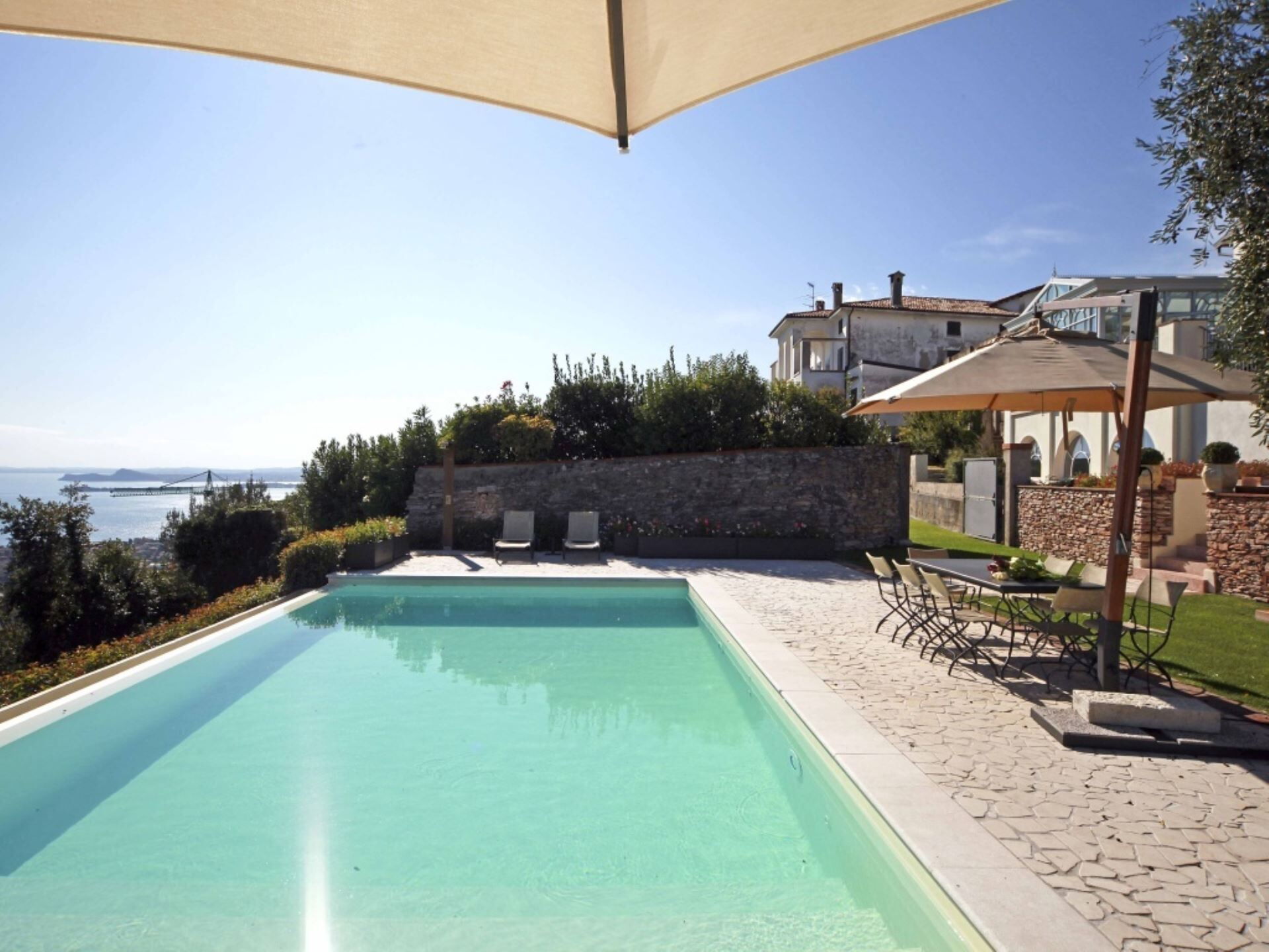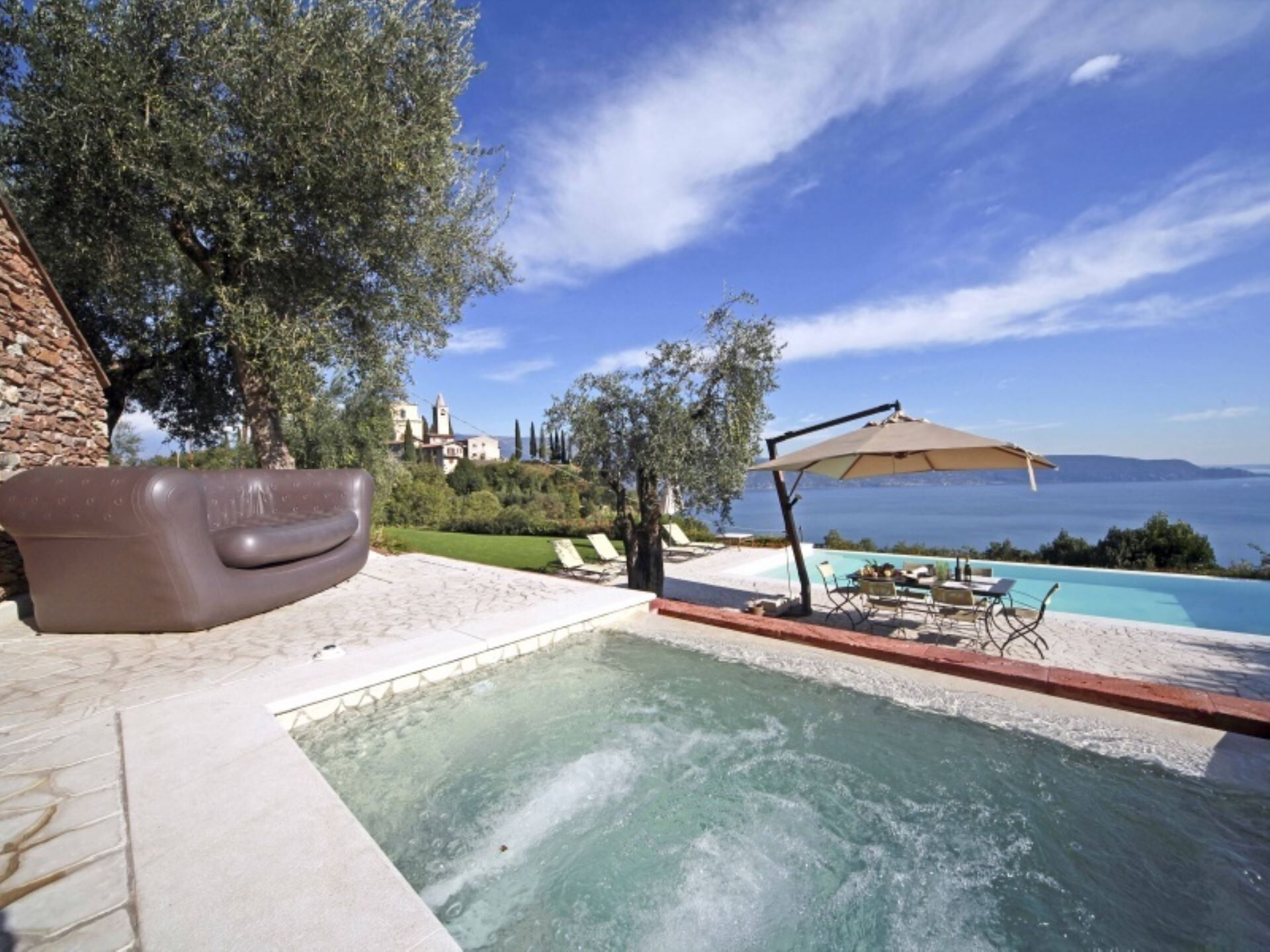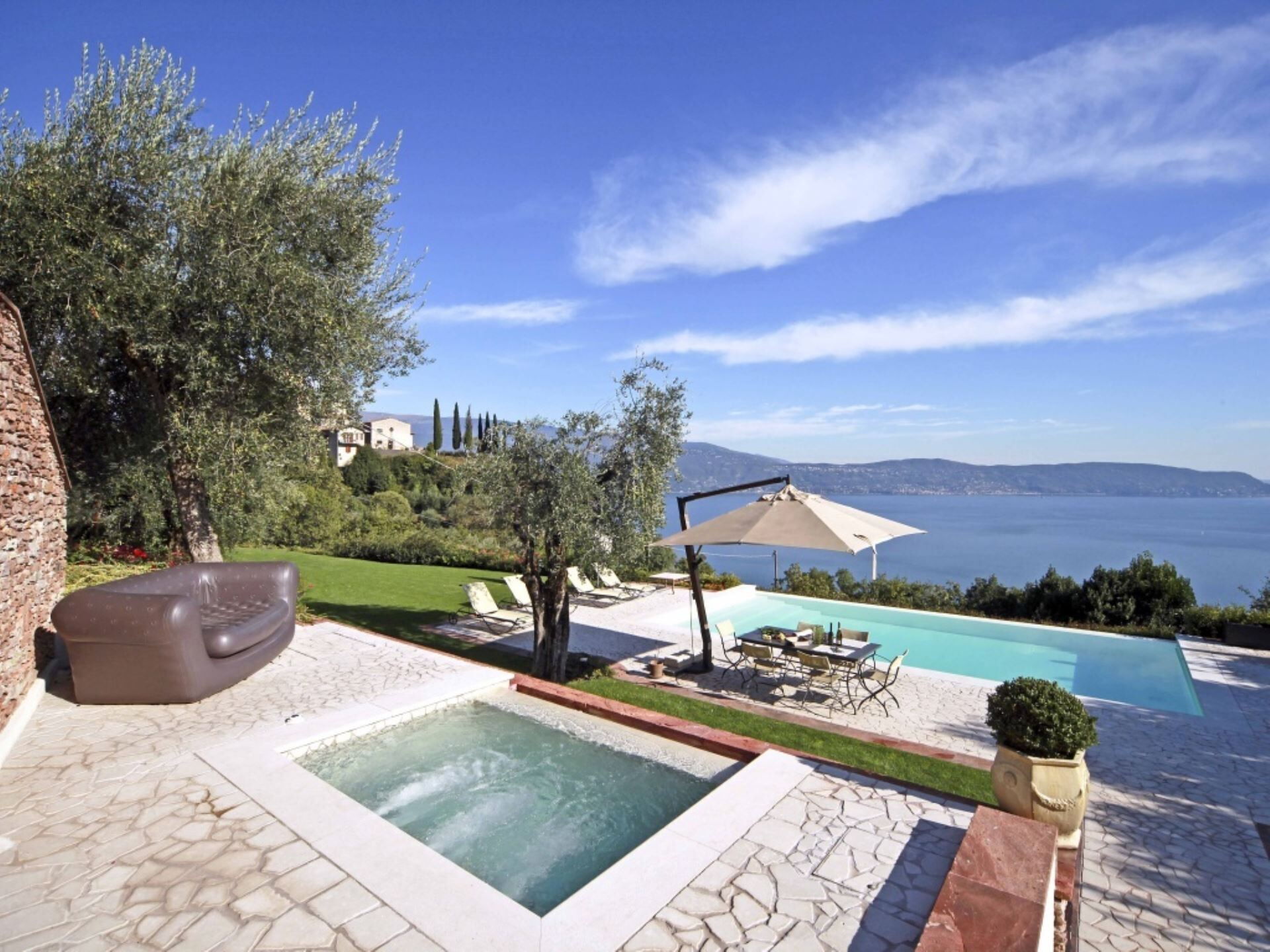 El entorno exterior de la propiedad ofrece espacios excepcionales diseñados para la relajación y el entretenimiento. La amplia piscina infinita, que puede climatizarse bajo petición para extender el disfrute en todas las estaciones, presenta una profundidad que oscila entre 60 centímetros y 145 centímetros. Junto a la piscina, encontrarán un baño de hidromasaje de generosas dimensiones elaborado en mampostería de piedra, creando un santuario adicional para el bienestar al aire libre. La zona de la piscina está cuidadosamente organizada con cómodas tumbonas y sombrillas en el solárium, junto con una mesa para cenas al aire libre. El jardín de 750 metros cuadrados está bellamente ajardinado con parterres floridos llenos de esencias aromáticas y enmarcado por la suave extensión de olivos. Disponen de una instalación de barbacoa para cocinar al aire libre, permitiéndoles preparar comidas mientras disfrutan de las espectaculares vistas al lago y el aire fresco.