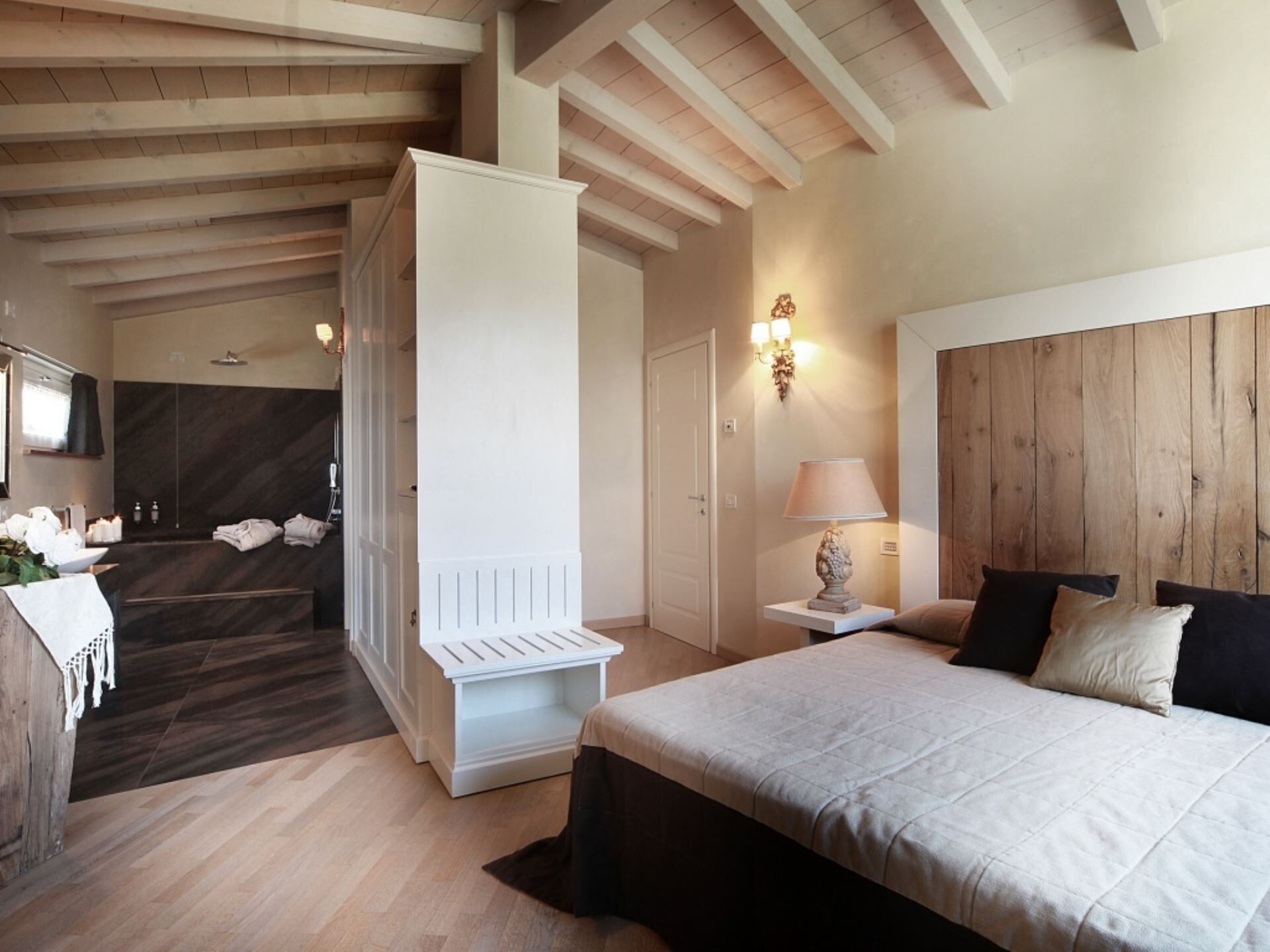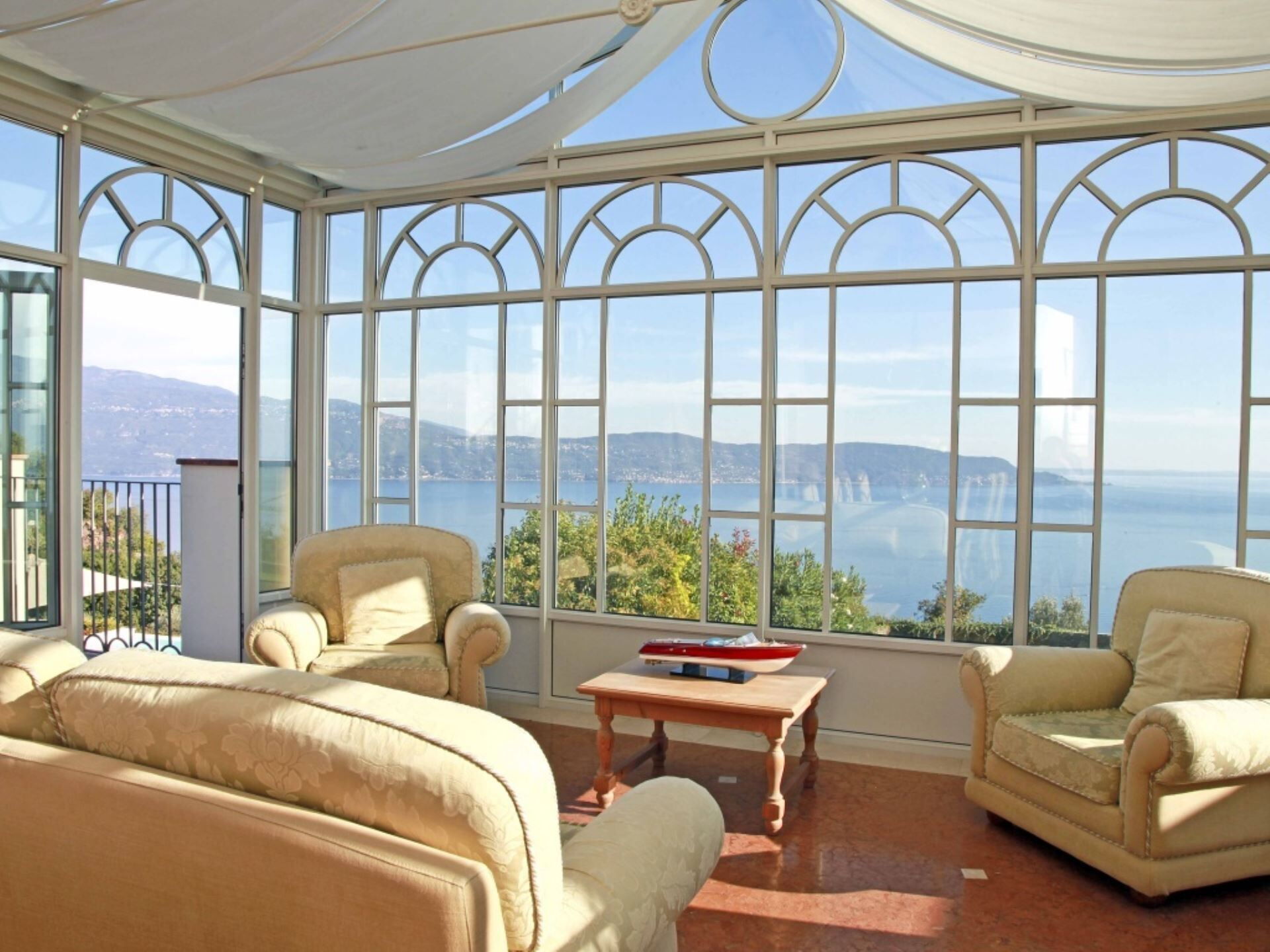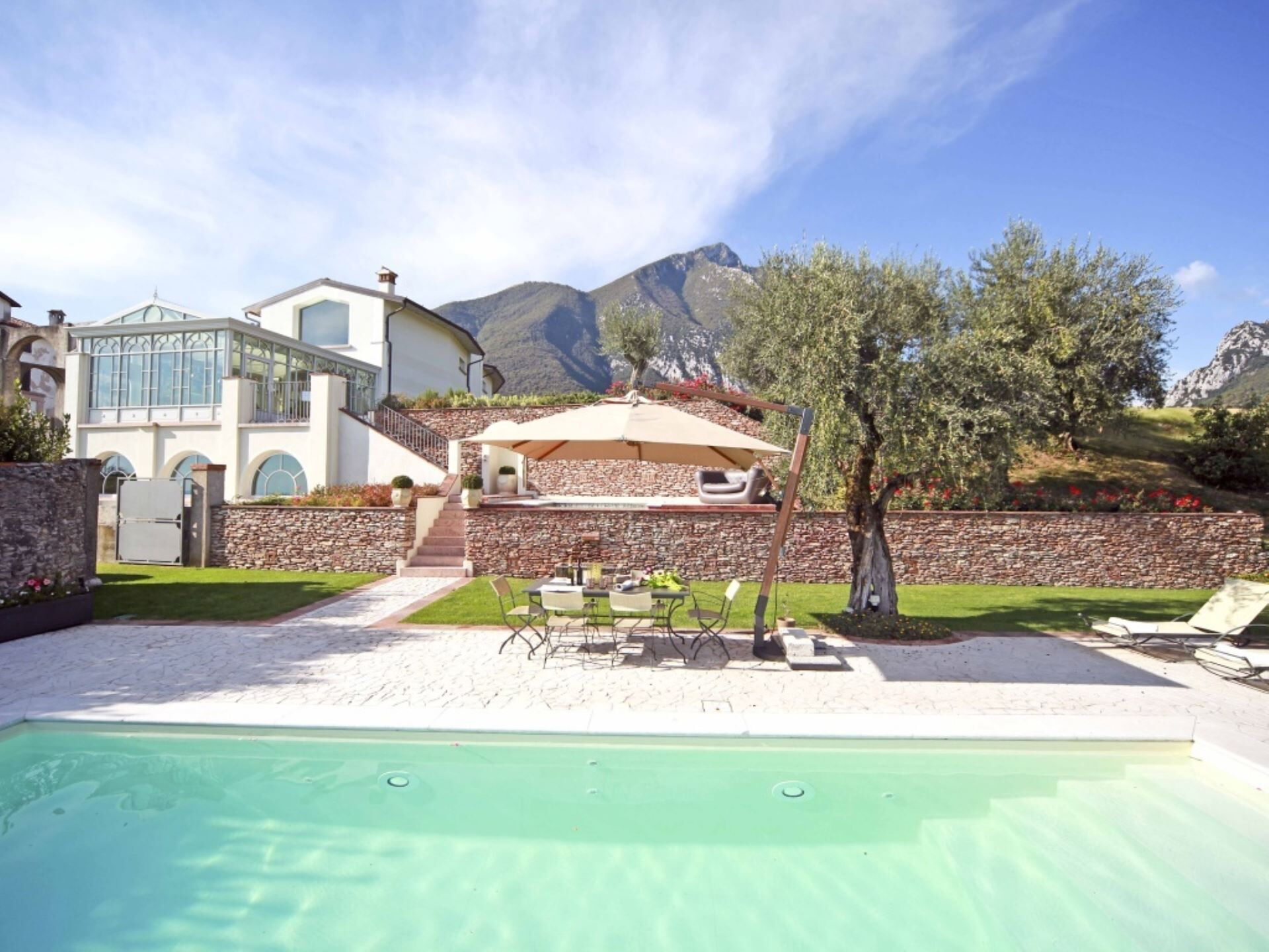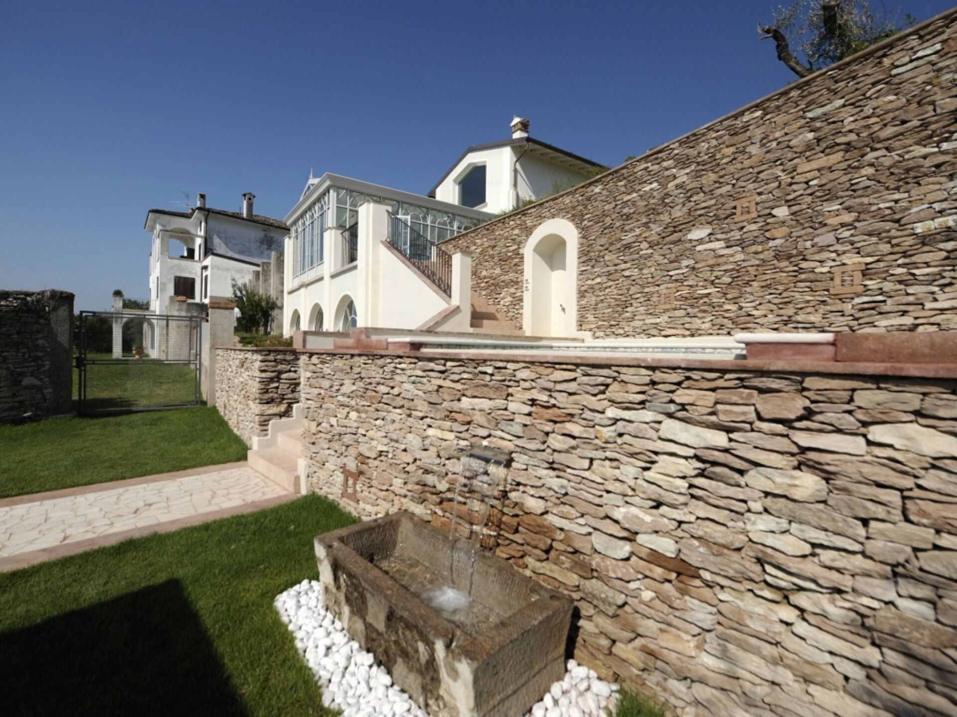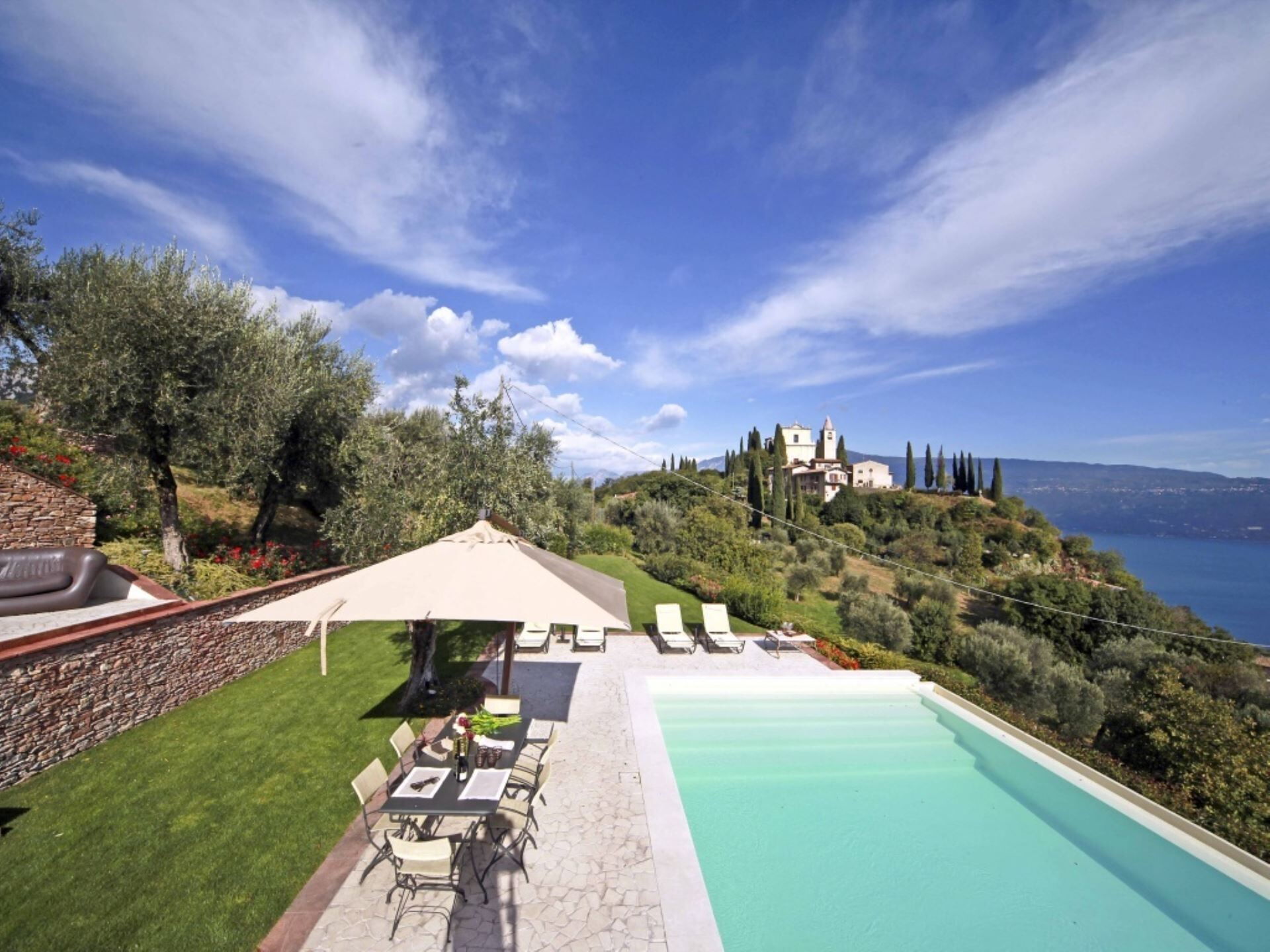 El entorno exterior de la propiedad ofrece espacios excepcionales diseñados para la relajación y el entretenimiento. La amplia piscina infinita, que puede climatizarse bajo petición para extender el disfrute en todas las estaciones, presenta una profundidad que oscila entre 60 centímetros y 145 centímetros. Junto a la piscina, encontrarán un baño de hidromasaje de generosas dimensiones elaborado en mampostería de piedra, creando un santuario adicional para el bienestar al aire libre. La zona de la piscina está cuidadosamente organizada con cómodas tumbonas y sombrillas en el solárium, junto con una mesa para cenas al aire libre. El jardín de 750 metros cuadrados está bellamente ajardinado con parterres floridos llenos de esencias aromáticas y enmarcado por la suave extensión de olivos. Disponen de una instalación de barbacoa para cocinar al aire libre, permitiéndoles preparar comidas mientras disfrutan de las espectaculares vistas al lago y el aire fresco.