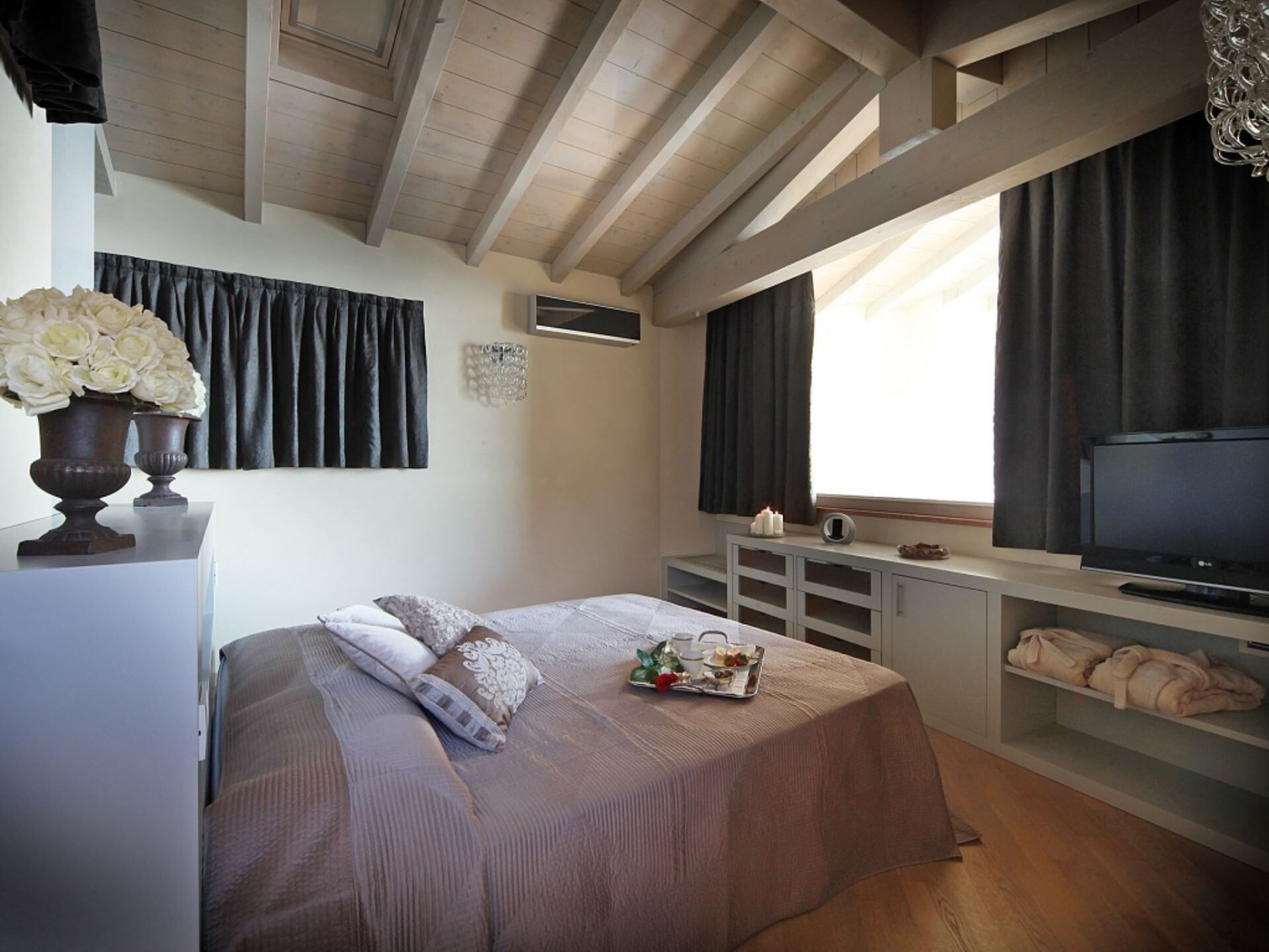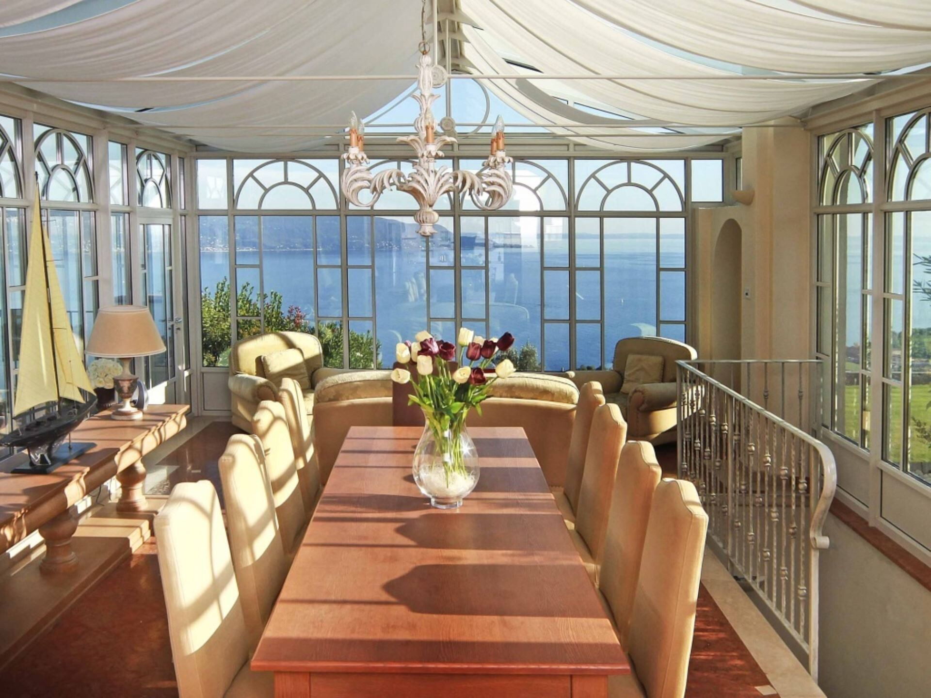 La villa ofrece una sofisticada distribución en tres niveles con una capacidad máxima de 6 huéspedes en 3 dormitorios, con la posibilidad de alojar hasta 8 huéspedes con 2 camas individuales adicionales. La planta baja presenta un impresionante espacio abierto que cuenta con un invernadero de hierro y cristal con vistas al lago, equipado con una chimenea de gas. Esta área está amueblada con una mesa de comedor para almuerzos y cenas, mientras que detrás del comedor descubrirán la cocina totalmente equipada desarrollada en torno a una encimera central de mármol. Un baño con inodoro también está convenientemente situado en la planta baja. El nivel inferior alberga la notable zona de SPA con vistas al jardín y al lago, amueblada con camas chaise lounge en el área de relajación y un hervidor para preparar infusiones. La primera planta acomoda la zona de descanso con 3 dormitorios: un dormitorio doble y dos dormitorios con dos camas individuales, ofreciendo estos últimos la posibilidad de añadir una cama infantil. Cada dormitorio se beneficia de un baño privado ensuite, con 1 baño con ducha y 2 baños equipados con bañera.