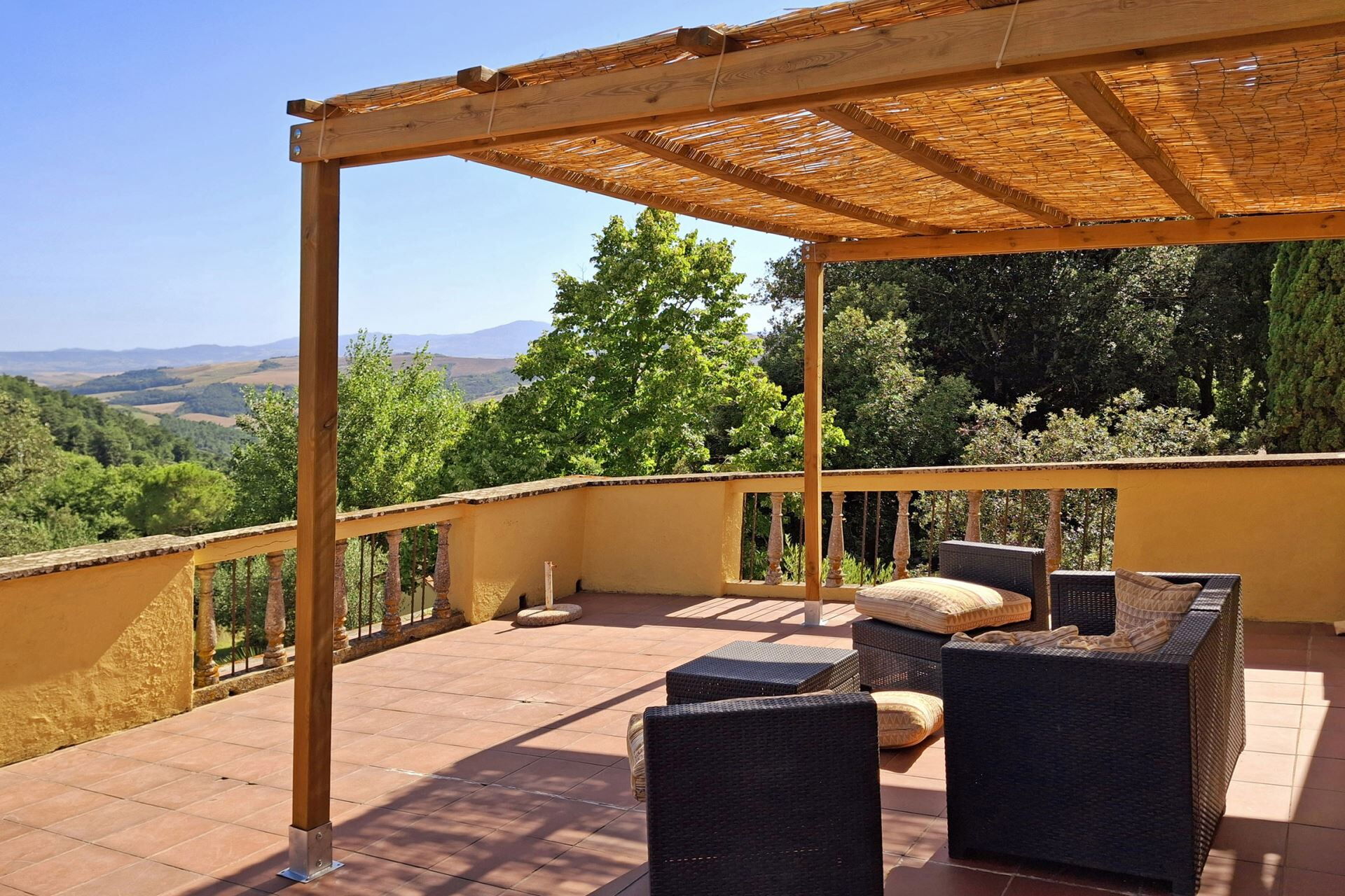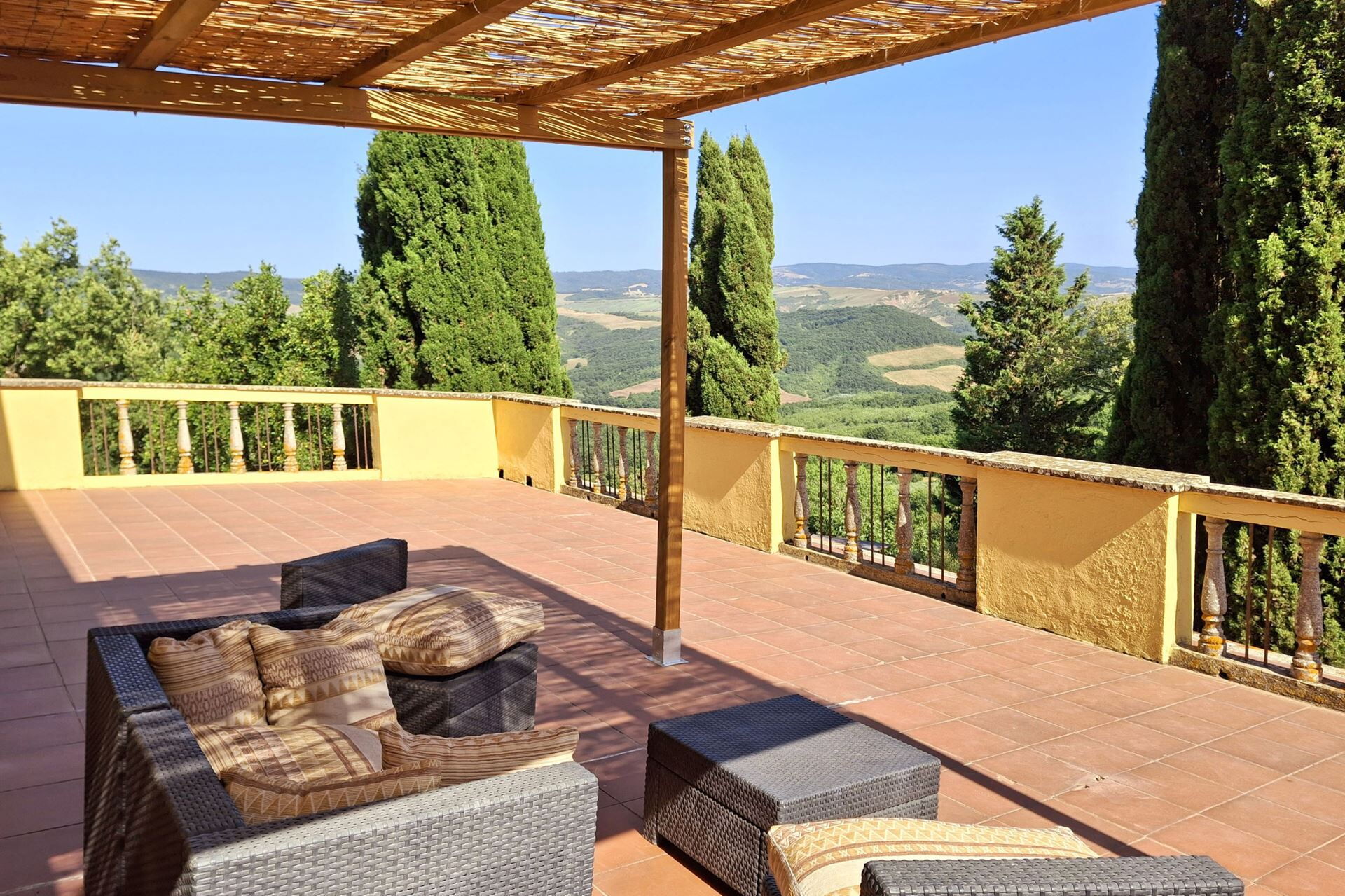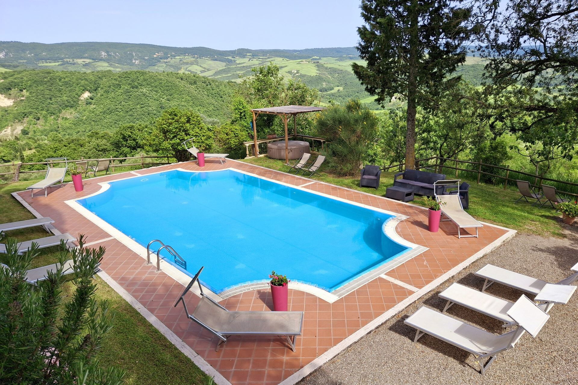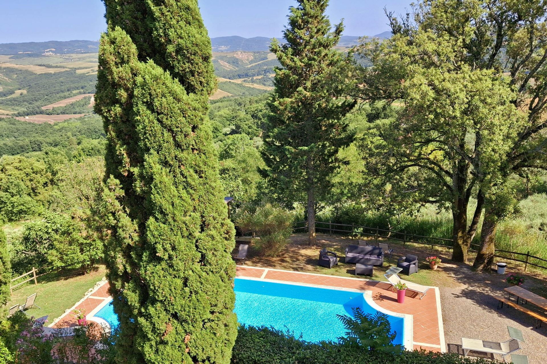 La villa ocupa una posición privilegiada en la campiña de Val d'Orcia cerca de Radicofani, situándole en el corazón de uno de los paisajes más celebrados de la Toscana. Este territorio Patrimonio de la Humanidad de la UNESCO ofrece colinas onduladas, caminos bordeados de cipreses y pueblos medievales en lo alto de colinas que personifican la clásica campiña italiana. La histórica ruta de peregrinación Vía Francigena atraviesa la región, conectándole con siglos de patrimonio cultural y espiritual. El área circundante proporciona numerosas oportunidades para explorar pueblos encantadores, bodegas de renombre, manantiales termales y auténticas trattorias que sirven cocina tradicional toscana. La ubicación elevada en lo alto de la colina ofrece vistas imponentes del valle, permitiéndole apreciar la belleza distintiva de este legendario paisaje desde la comodidad de la finca.