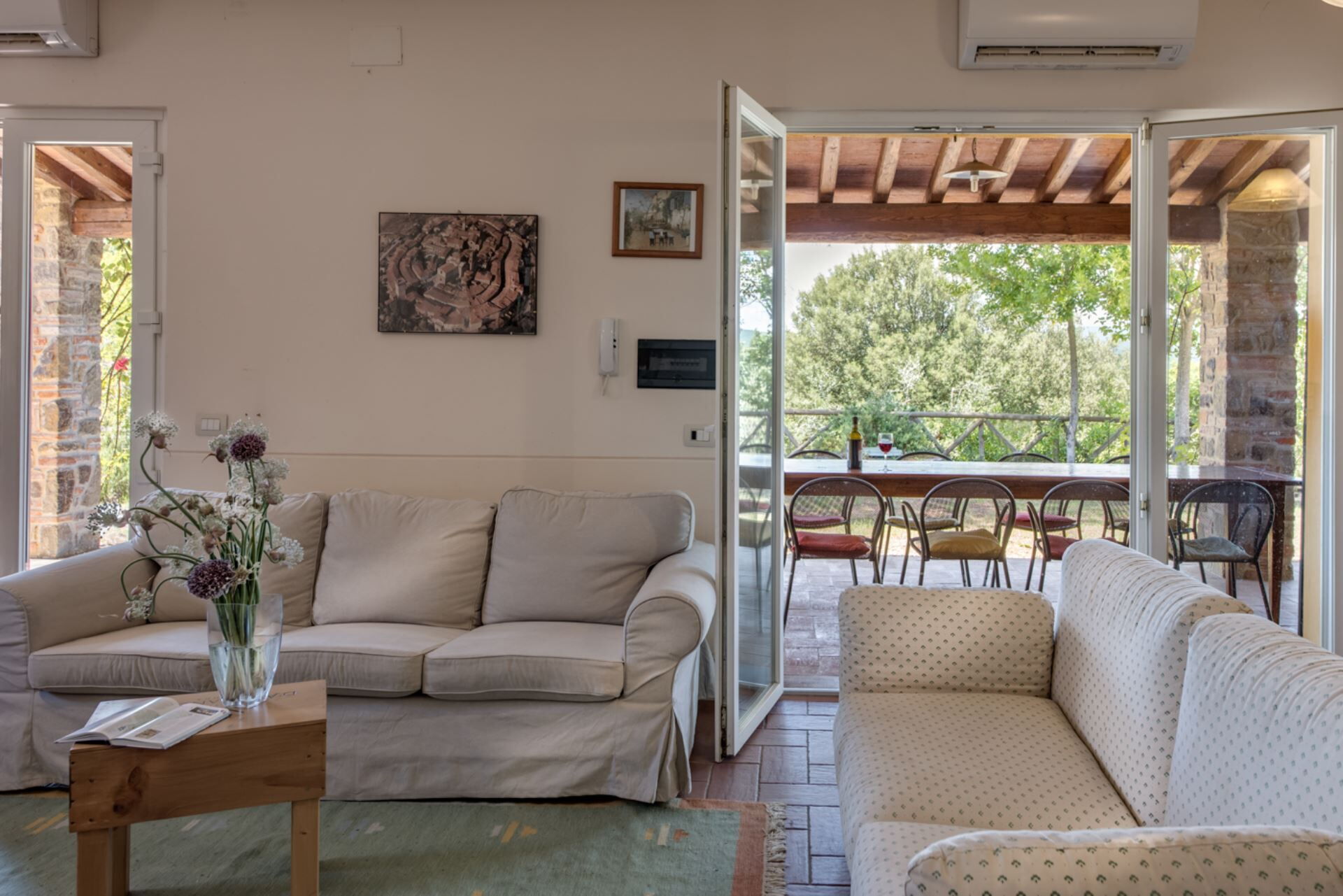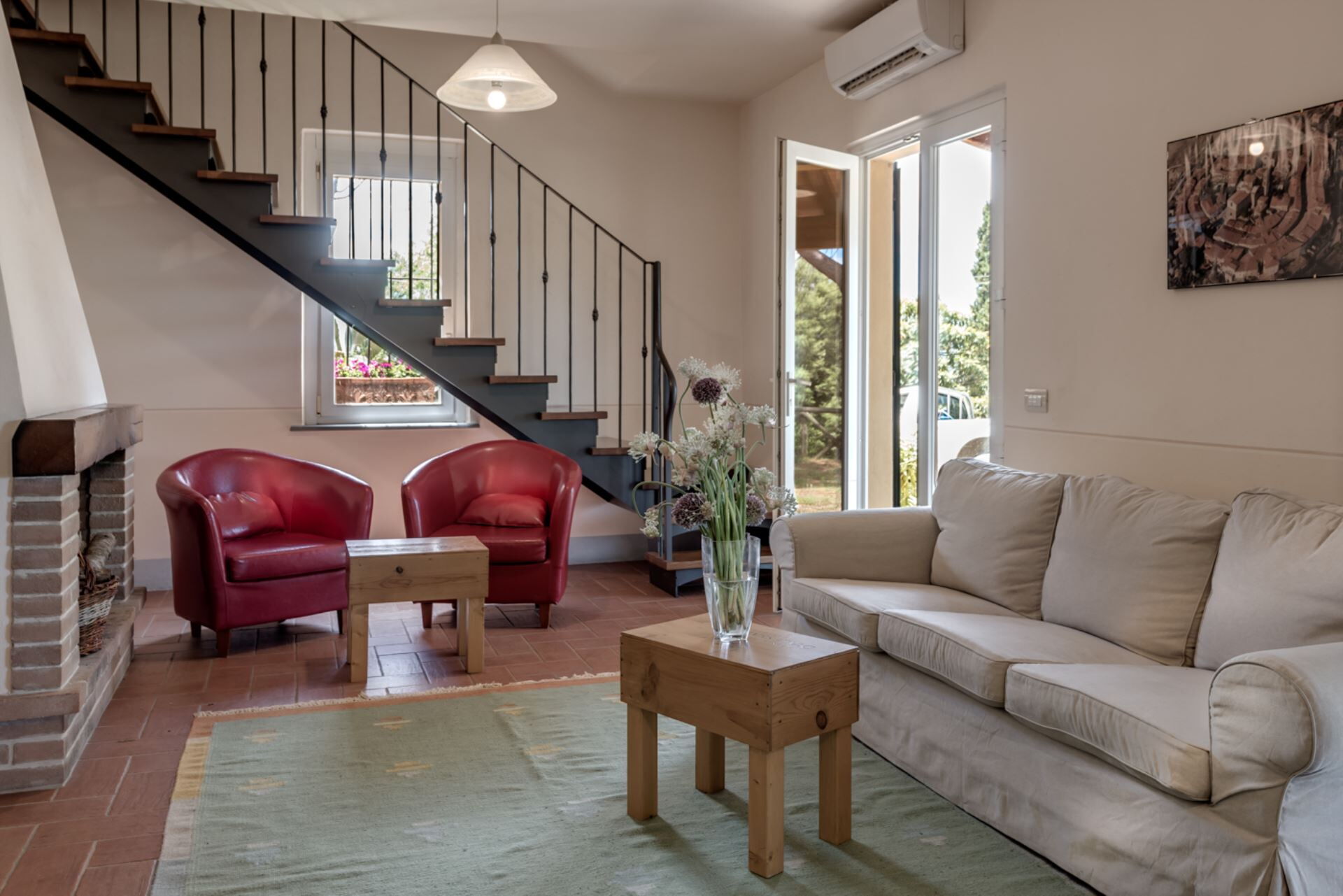 Bellaria Independent Villa es una encantadora villa de vacaciones ubicada en Lucignano, Italia, que ofrece un auténtico refugio campestre para huéspedes que buscan tanto relajación como exploración cultural. Situada sobre una colina rodeada de olivos, esta masía recientemente renovada proporciona impresionantes vistas del paisaje de Valdichiana, donde las características terrazas de olivares se encuentran con bosques silvestres. La propiedad ha sido cuidadosamente restaurada para ofrecer confort y bienestar manteniendo el respeto por el entorno natural. Ubicada a solo 2 km del hermoso pueblo medieval de Lucignano, reconocido por su singular planta ovalada y calles concéntricas donde cada rincón merece atención, se encontrarán perfectamente situados tanto para disfrutar de la tranquila vida campestre como para acceder cómodamente a atracciones culturales. La villa cuenta con comodidades modernas que incluyen conexión WiFi a Internet en toda la propiedad e instalaciones de aparcamiento dedicadas para sus vehículos. Esta residencia independiente combina la arquitectura tradicional toscana con servicios contemporáneos, creando un entorno ideal para familias o grupos que buscan una experiencia inmersiva en el corazón de la campiña italiana.