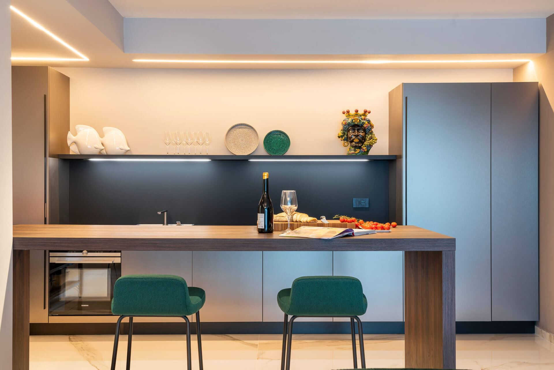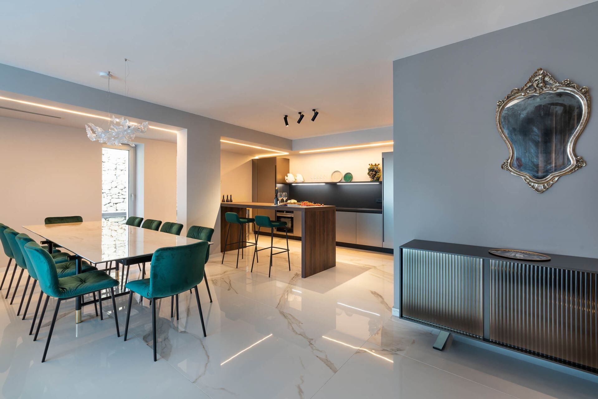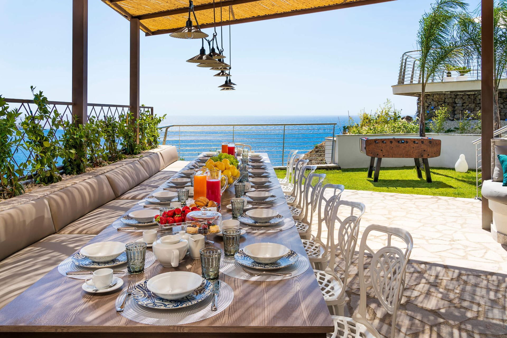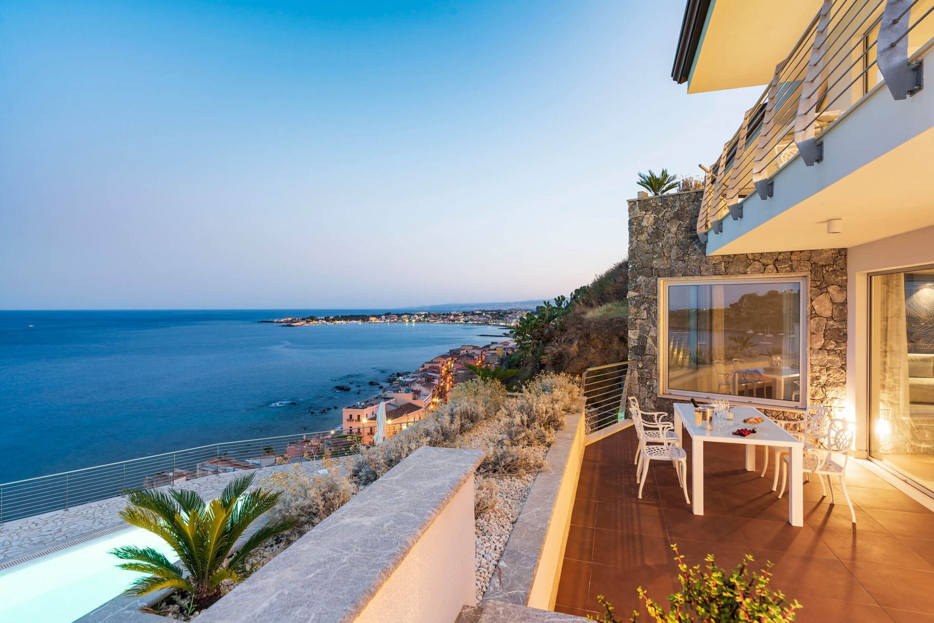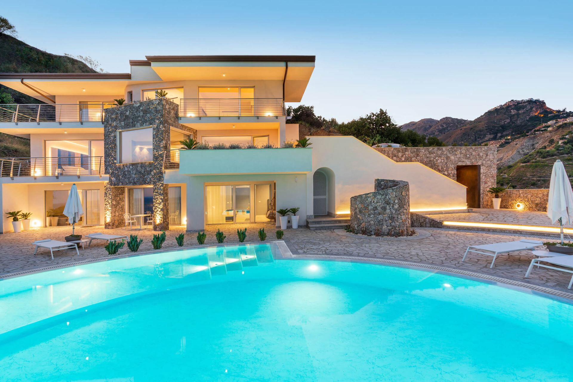 Villa Taormina es una villa de vacaciones de lujo situada cerca de Taormina, Italia, que ofrece un refugio excepcional para viajeros exigentes que buscan comodidad y exclusividad. Esta propiedad panorámica se encuentra en una ladera y proporciona vistas impresionantes sobre el mar, a tan solo 600 metros de la playa más cercana. La villa cuenta con una piscina climatizada de agua salada que mejora su experiencia de relajación durante toda su estancia. Diseñada para alojar hasta 20 huéspedes, Villa Taormina combina arquitectura contemporánea con servicios de lujo, lo que la convierte en una opción ideal para familias numerosas o grupos. La propiedad incluye una zona de bienestar exclusiva con gimnasio, sauna, sala de masajes y ducha multisensorial, asegurando que disfrute de unas vacaciones verdaderamente rejuvenecedoras. Con su proximidad tanto a Giardini Naxos como a Taormina, esta extraordinaria villa sirve como base perfecta para explorar los tesoros culturales y naturales de Sicilia.