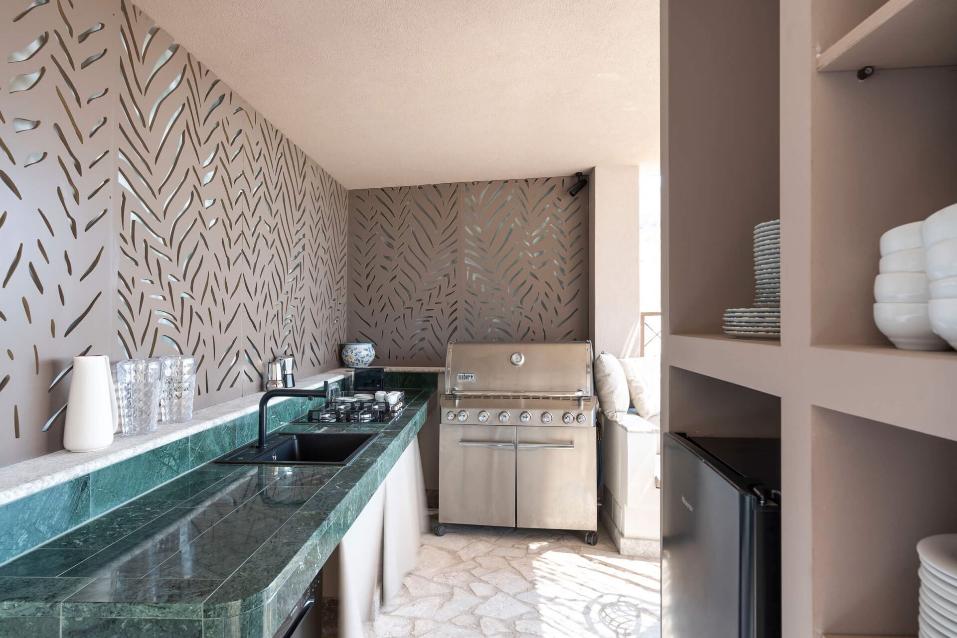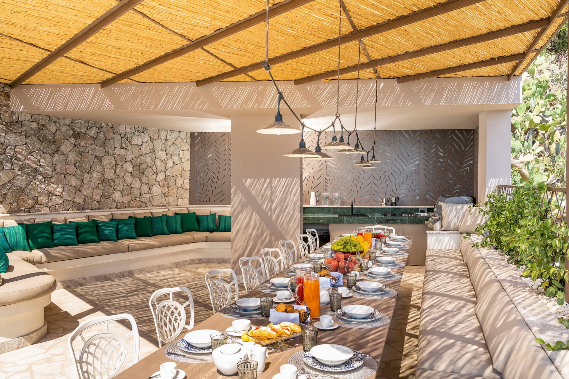 Los espacios exteriores de Villa Taormina están diseñados para maximizar su disfrute del clima mediterráneo y las impresionantes vistas al mar. Encontrará amplias terrazas que proporcionan abundante espacio para descansar, cenar y entretenerse mientras contempla las vistas panorámicas. La propiedad cuenta con jardines bellamente cuidados que crean una atmósfera serena en todo el recinto. La piscina climatizada de agua salada mide 7,00 por 12,00 metros con una profundidad que varía de 1,20 a 1,50 metros y funciona durante todo el año desde el 01/01 hasta el 31/12, ofreciéndole el lugar perfecto para refrescarse y relajarse. Junto a la piscina, descubrirá una terraza solárium dedicada ideal para tomar el sol. La cocina exterior está completamente equipada con barbacoa y zona de comedor, permitiéndole preparar y disfrutar de comidas al aire libre. Además, hay un jacuzzi privado que mide 2,00 por 2,00 metros con una profundidad que varía de 0,60 a 0,80 metros, climatizado a una temperatura agradable de 28 grados y en funcionamiento durante todo el año. Un baño exterior con ducha está convenientemente ubicado cerca de la zona de la piscina para su comodidad.