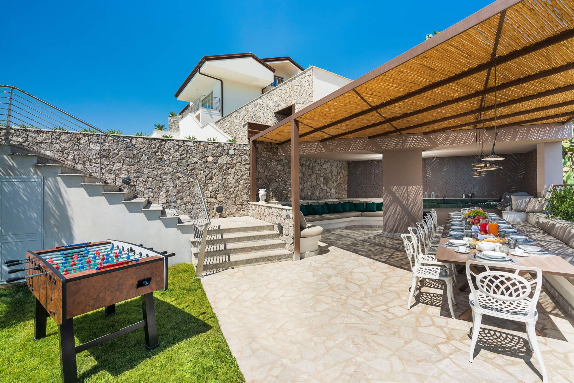 Su estancia en Villa Taormina incluye una amplia gama de servicios diseñados para garantizar la máxima comodidad y conveniencia. Las unidades de aire acondicionado están instaladas en todas las habitaciones de la villa, permitiéndole mantener su temperatura preferida independientemente de la estación. Para su entretenimiento, encontrará un televisor con TV satélite en cada dormitorio, así como altavoces bluetooth disponibles para su uso. La villa está equipada con lavadora y secadora para atender sus necesidades de lavandería durante su estancia. Las cocinas cuentan con electrodomésticos modernos incluyendo 5 lavavajillas distribuidos en las diferentes plantas y microondas para su conveniencia. Las áreas exteriores incluyen una barbacoa para preparar comidas a la parrilla. La propiedad ofrece acceso gratuito a internet Wi-Fi en todas sus instalaciones, manteniéndole conectado durante sus vacaciones. Los servicios adicionales incluidos comprenden electricidad, consumo de gas de cocina, consumo de agua, calefacción proporcionada por bombas de calor en todas las habitaciones, y aparcamiento privado dentro de la propiedad. También se beneficiará de limpieza diaria de baños y dormitorios durante 8 horas, cambio dos veces por semana de ropa de cama, toallas de baño, toallas de piscina y mantelería, y un servicio de limpieza final. Las instalaciones de bienestar incluyendo el área de fitness y la sauna están disponibles para su uso exclusivo. A su llegada, será recibido con una bebida de bienvenida y una cesta de bienvenida con artículos de desayuno. La villa proporciona 2 cunas para familias que viajan con bebés y cuenta con acceso para personas con discapacidad con un baño adaptado específico.