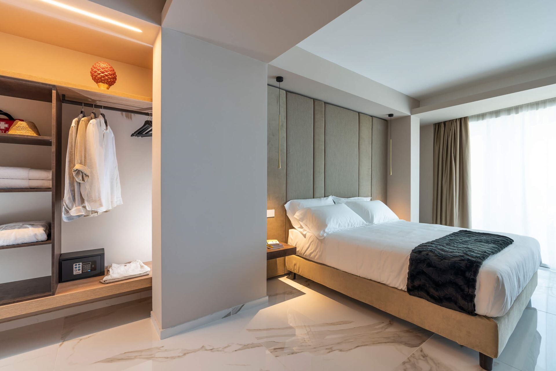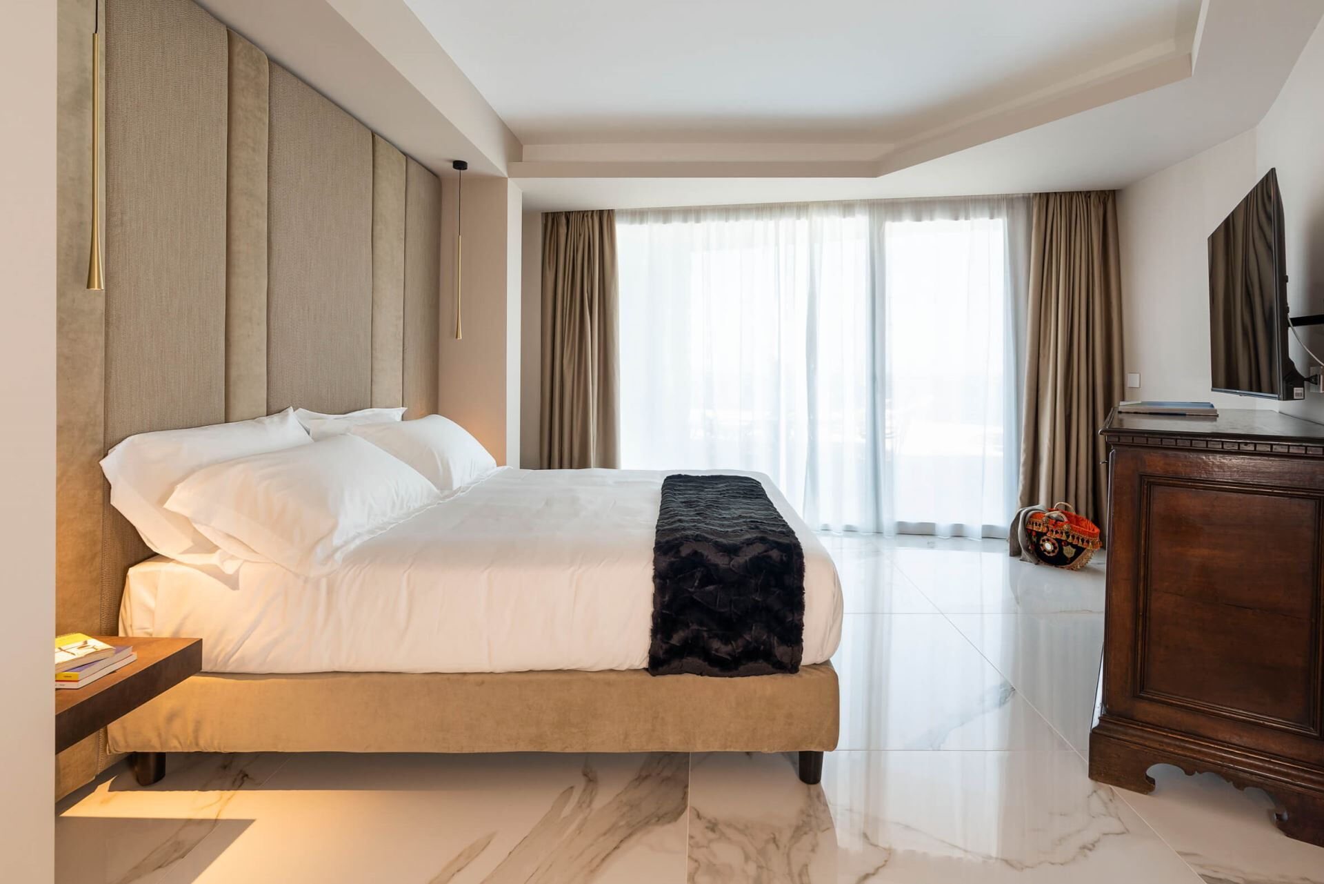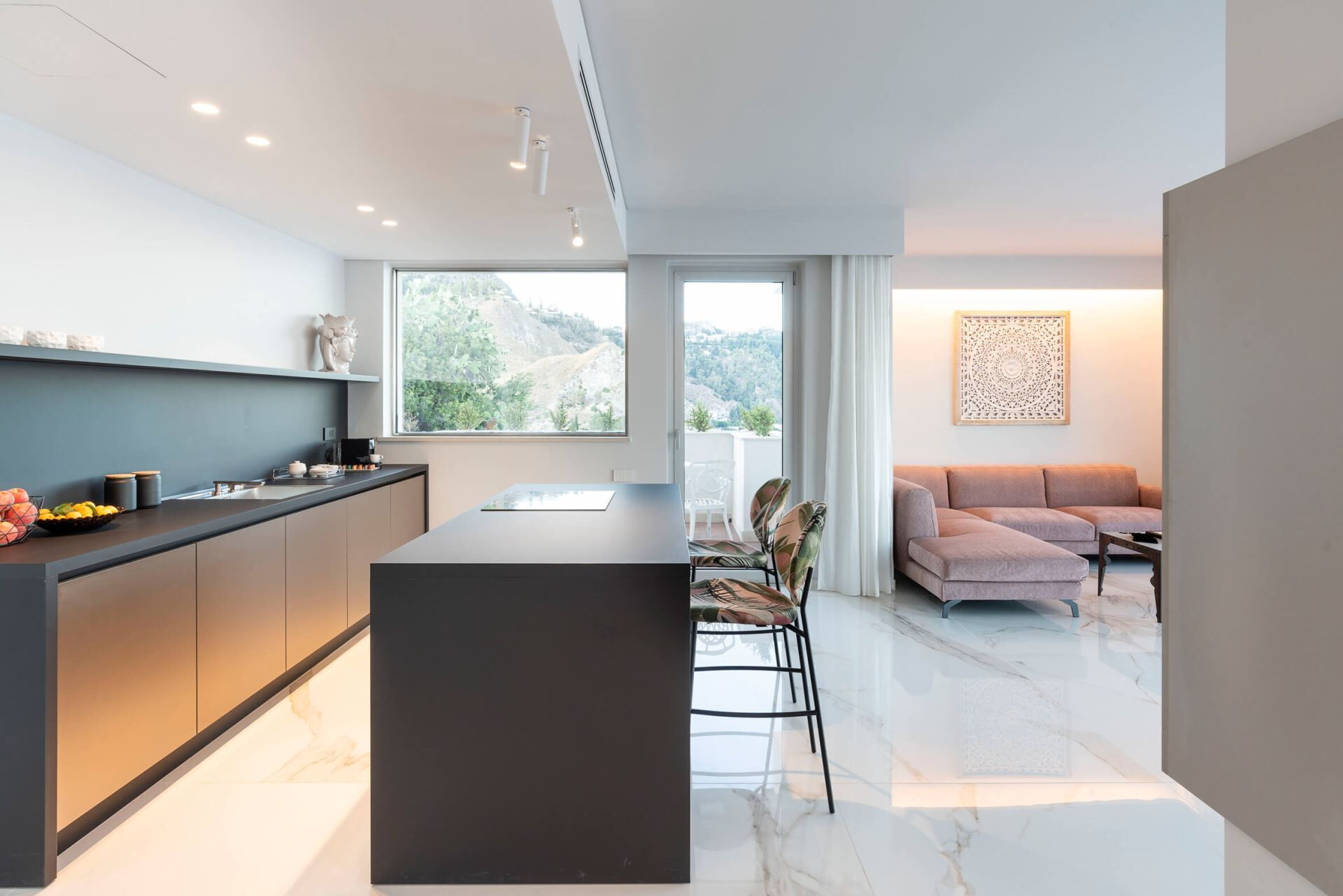 Villa Taormina se distribuye en cuatro niveles, todos conectados por un ascensor para facilitar el acceso, y aloja una capacidad máxima de 20 huéspedes en 10 dormitorios y 11 baños. La planta baja cuenta con un amplio salón con comedor y cocina, 2 dormitorios dobles con duchas en suite, un lavadero y la completa zona de bienestar que incluye las instalaciones de fitness, sauna, sala de masajes y ducha multisensorial. Uno de los dormitorios de la planta baja incluye un vestidor. La primera planta ofrece un amplio salón con zona de estar, comedor y cocina, junto con 4 dormitorios dobles, todos con duchas en suite, y una terraza. Dos de estos dormitorios cuentan con vestidores. La segunda planta contiene un amplio salón con zona de comedor y cocina, 3 dormitorios dobles con duchas en suite, y una terraza. Uno de estos dormitorios incluye un vestidor. La tercera planta comprende un salón con zona de comedor, cocina, 1 dormitorio doble con ducha en suite, y 2 pequeñas terrazas. Los 10 dormitorios dobles están equipados con televisiones y lujosos baños en suite con duchas, asegurando privacidad y comodidad para cada huésped. La villa cuenta con 4 salones independientes con cocinas, zonas de comedor y estar distribuidos en las diferentes plantas, proporcionando múltiples espacios de reunión para su grupo.