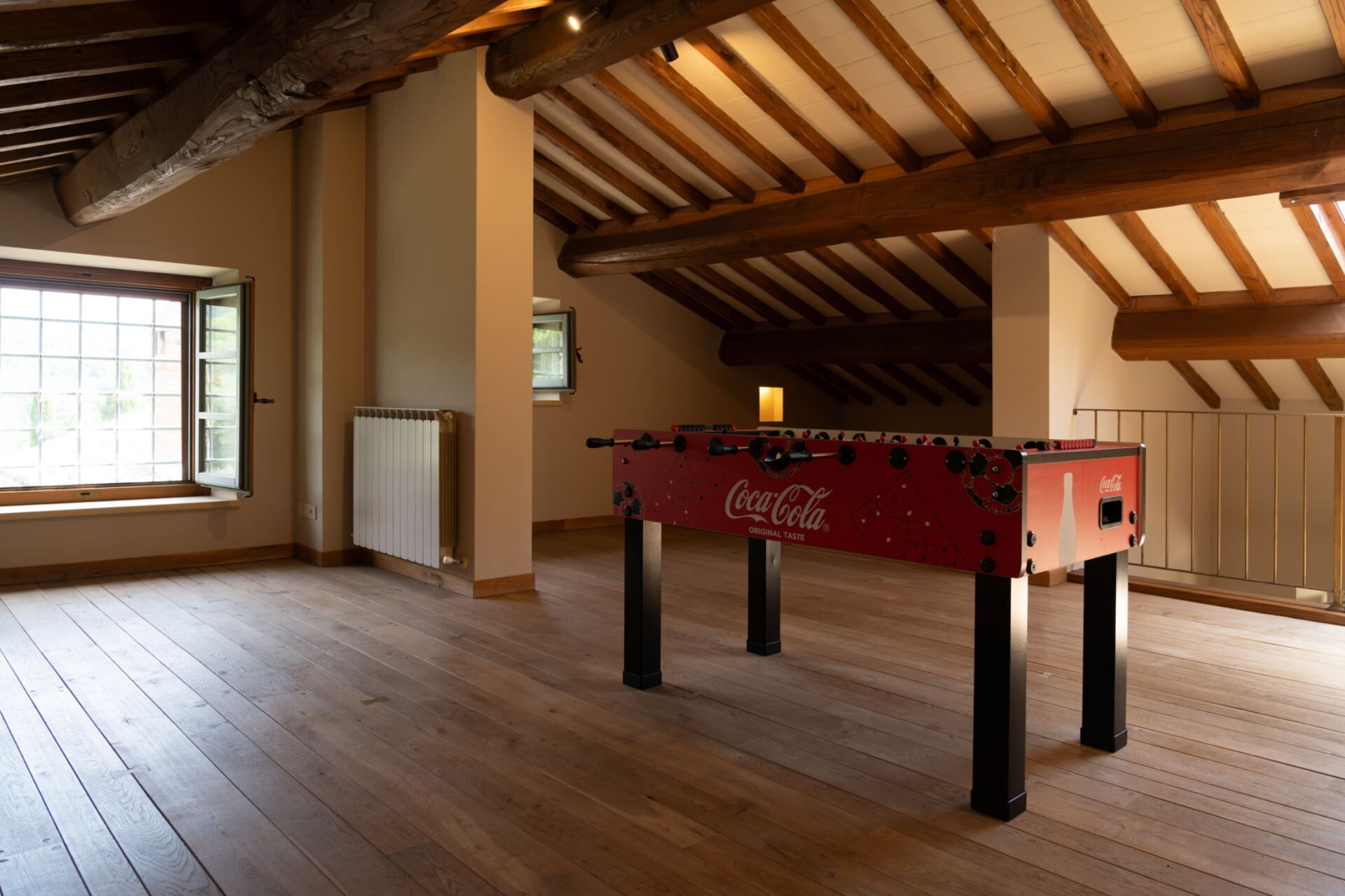 La segunda planta consta de un ático con una gran sala de ocio con futbolín. Aquí también hay un dormitorio doble adicional que puede estar disponible bajo petición con un suplemento y un cuarto de baño con bañera.
