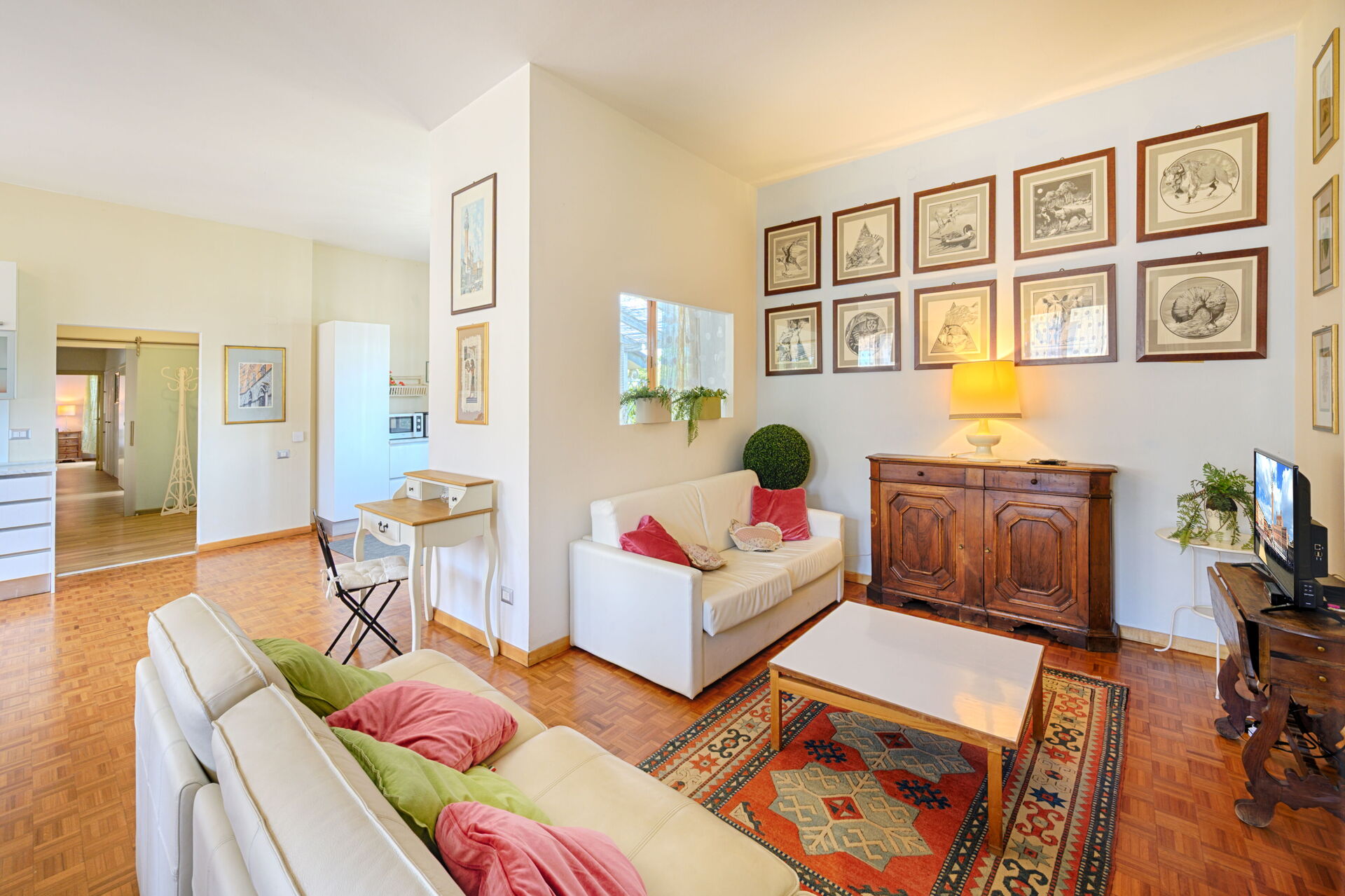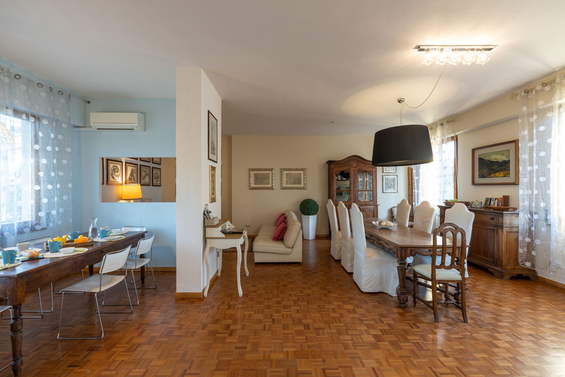 Cocina-salón (56 m2): cocina bien equipada, mesa de comedor (gente: 12), lavavajillas, frigorífico, congelador, microondas, cocina de gas, horno, tostadora, máquina de café italiana, máquina de café americana, sofa (gente: 10), sillón, escritorio, WIFI internet, WIFI internet, aire acondicionado, silla alta, tv vía satélite, televisión, detector de humo, detector de humo, detector de co2, detector de co2, acceso a la terraza, acceso a la terraza.