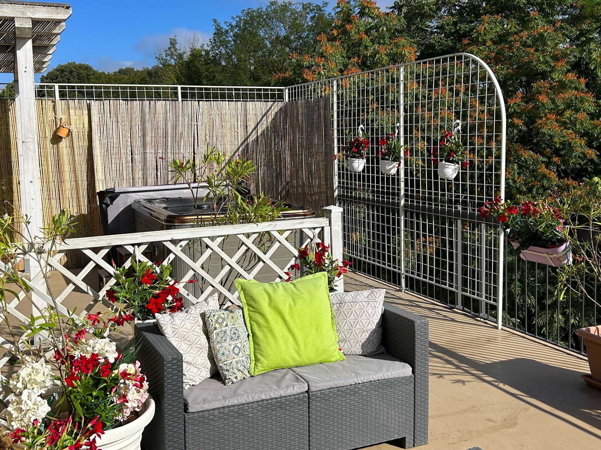 Terraza (80 m2): bañera de hidomasaje exterior (ancho: 1.5m, longitud: 2m), comer al aire libre, mesa de comedor (gente: 8), WIFI internet, barbacoa, mobiliario de jardin, mobiliario de terraza, cuatro tumbonas.