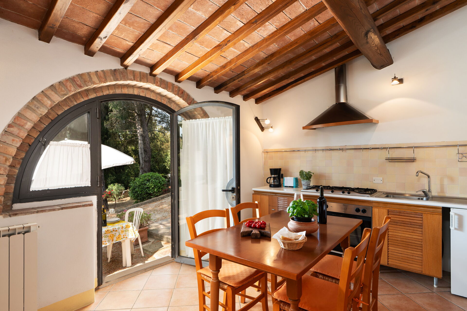Cocina-salón 1: cocina bien equipada, mesa de comedor (gente: 4), frigorífico, microondas, cocina de gas, horno, tostadora, plancha, máquina de café italiana, máquina de café americana, chimenea, sofá cama de matrimonio (ancho: 1.4m, longitud: 1.9m), WIFI internet, mosquitero, tv vía satélite, detector de humo, acceso al jardín.