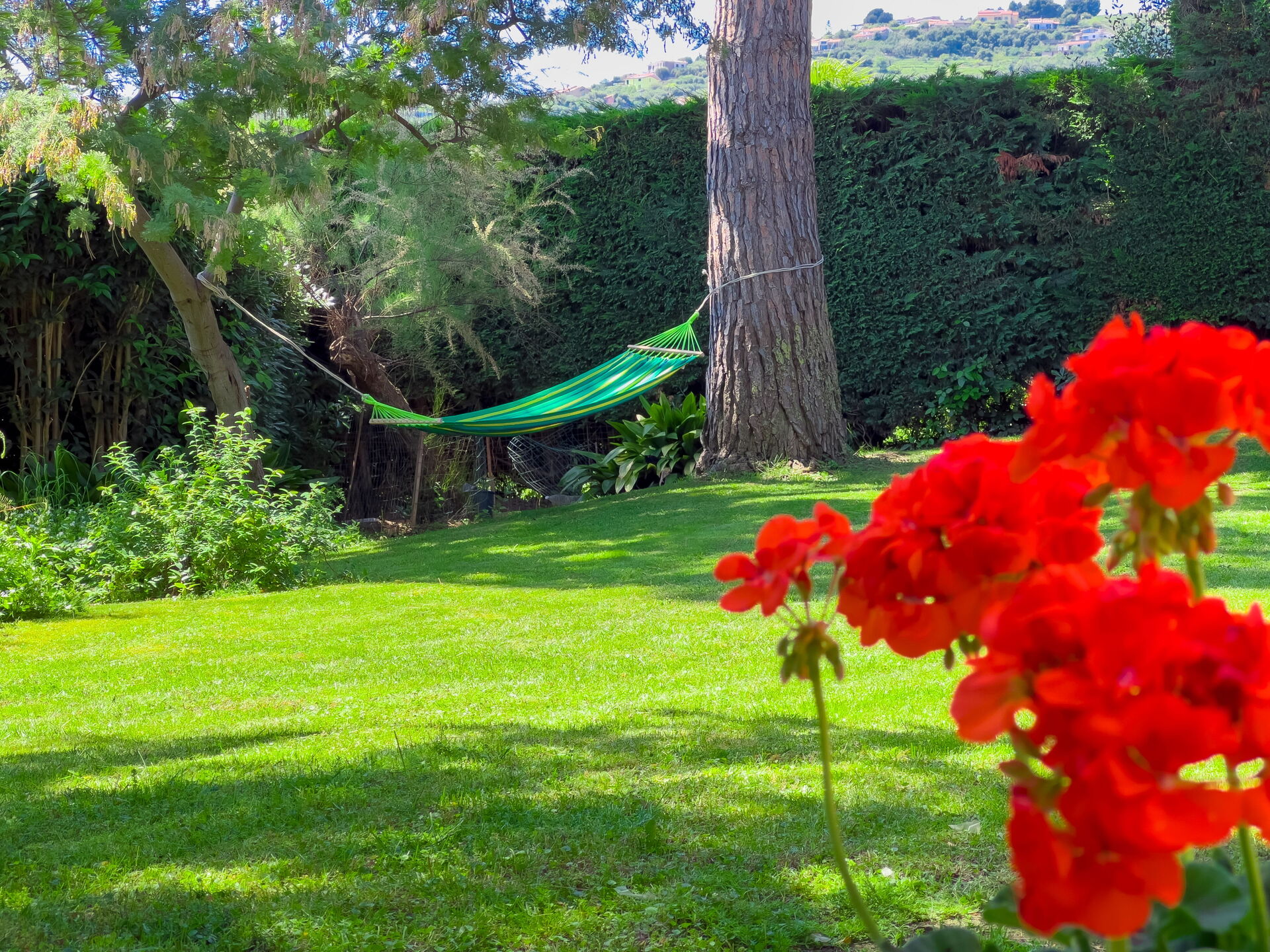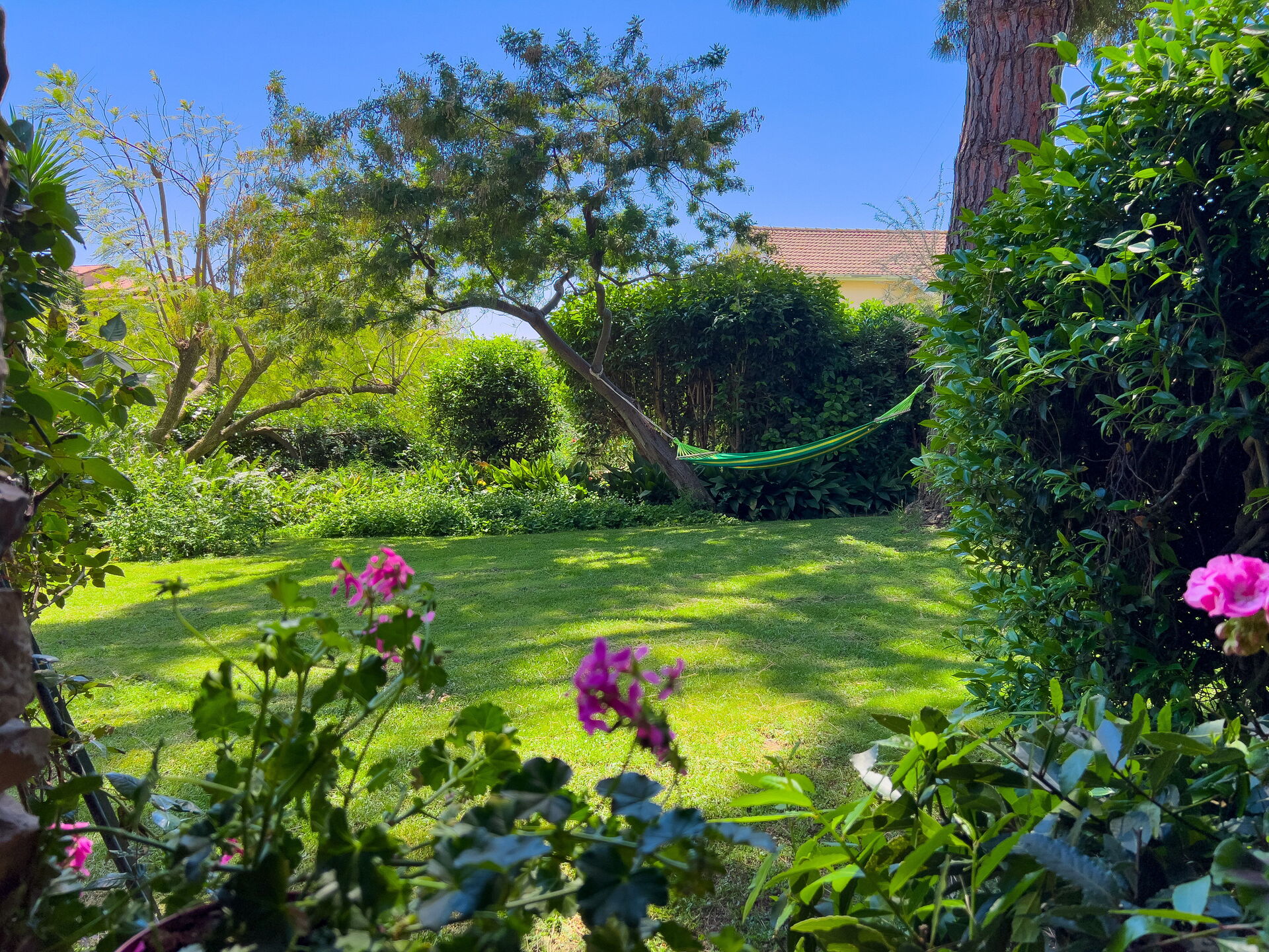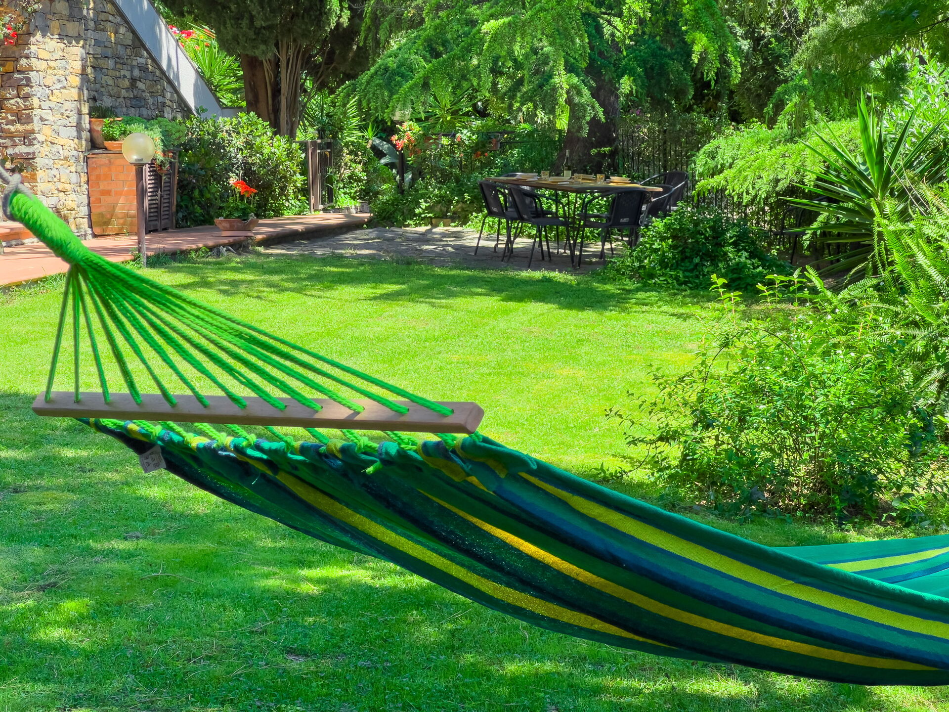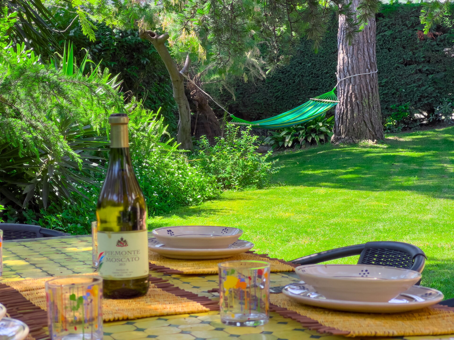 Frente al jardín: este precioso apartamento tiene vistas a un precioso césped verde, parcialmente soleado y parcialmente sombreado por grandes árboles. ¡Mesa de comedor exterior, hamaca y tumbonas para tomar el sol y relajarse!