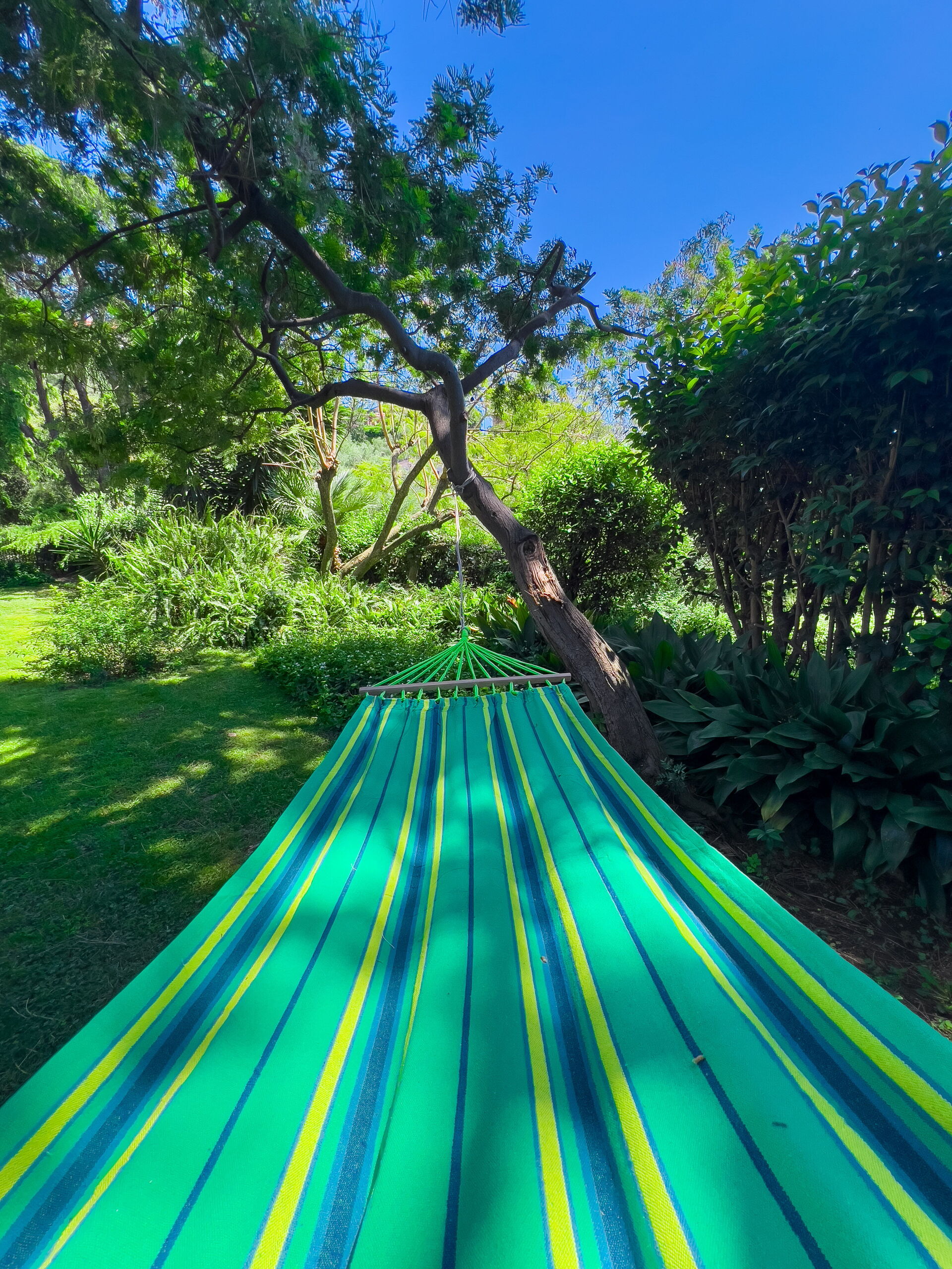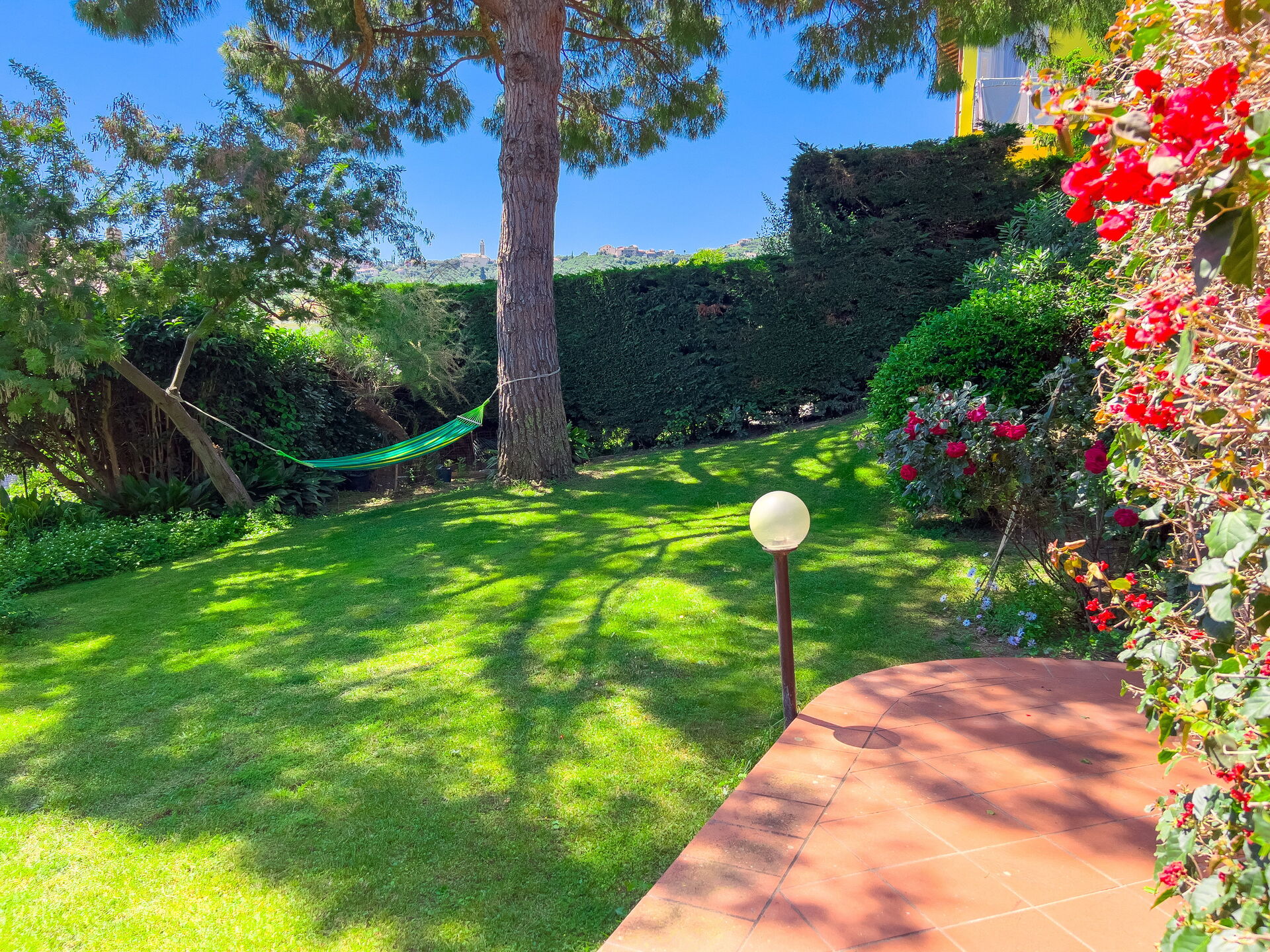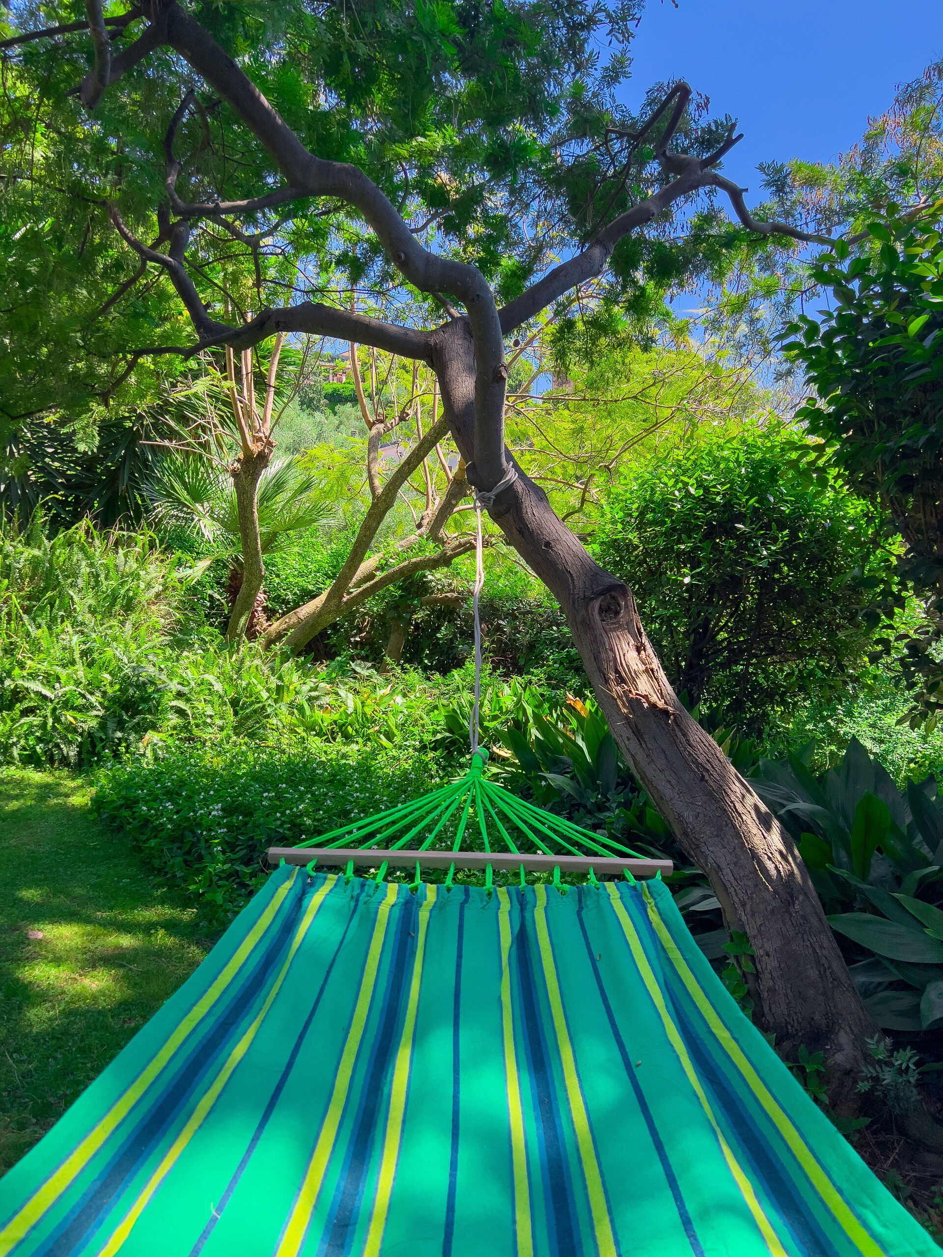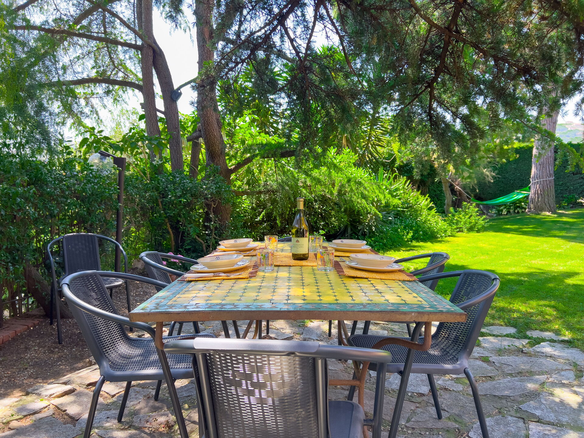 Frente al jardín: este precioso apartamento tiene vistas a un precioso césped verde, parcialmente soleado y parcialmente sombreado por grandes árboles. ¡Mesa de comedor exterior, hamaca y tumbonas para tomar el sol y relajarse!