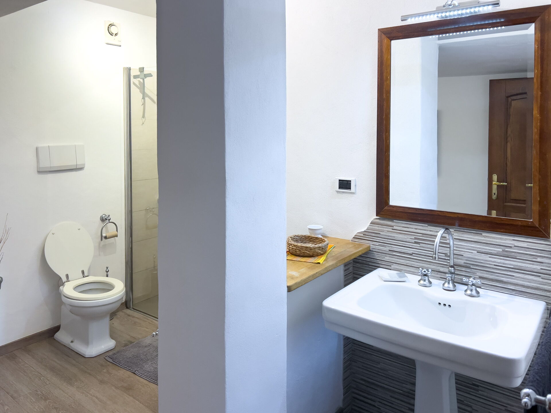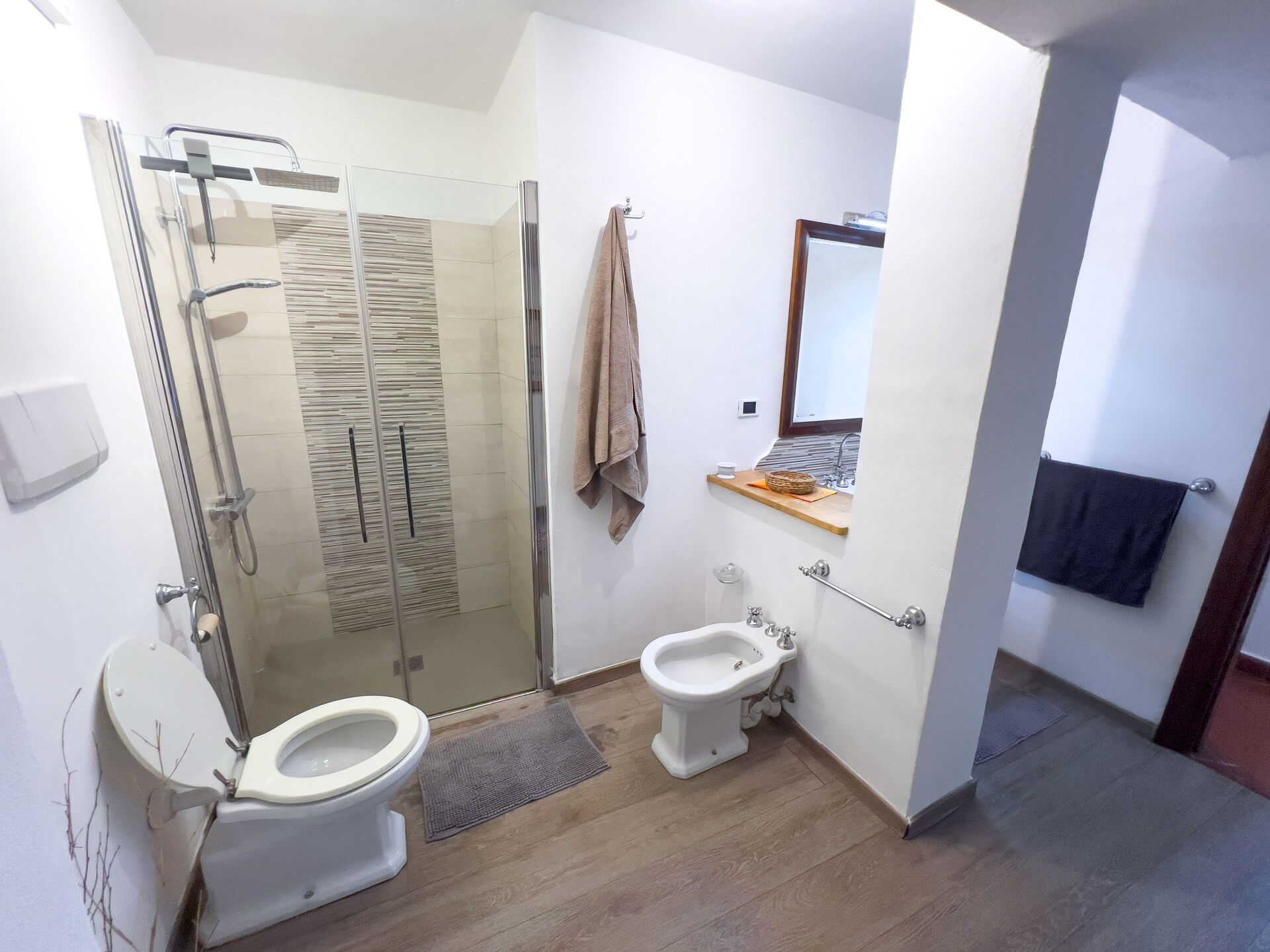 Primer dormitorio: dormitorio doble con vestidor y baño en suite. Baño completo (ducha, inodoro, bidé, lavabo; sin ventana).