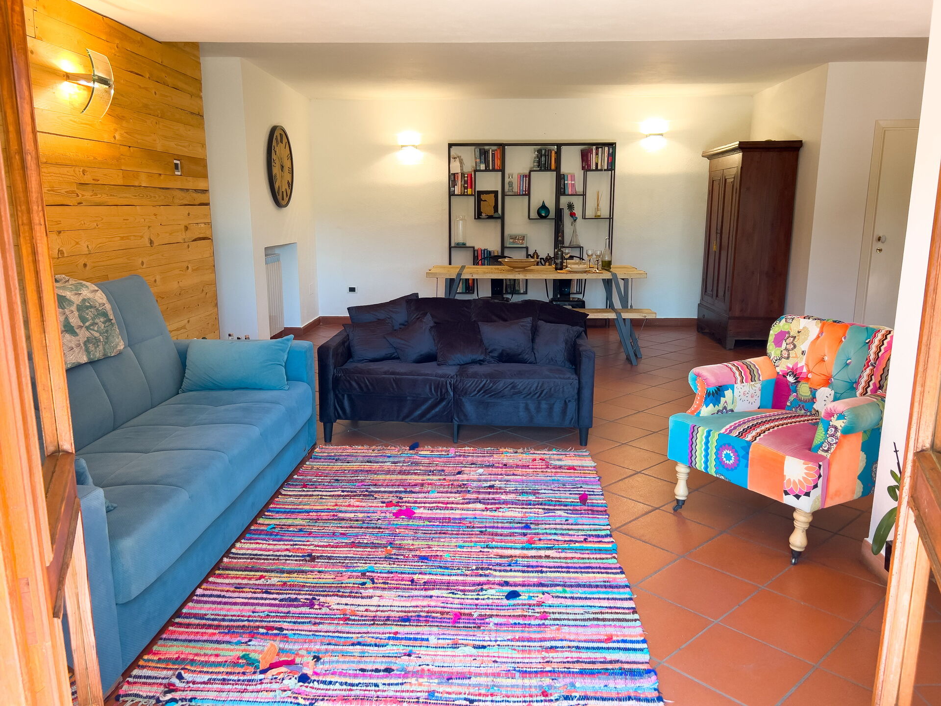 Amplia sala de estar, compuesta por un espacio abierto con sofá, sofá cama doble y mesa de comedor, y cocina con una segunda mesa de comedor.